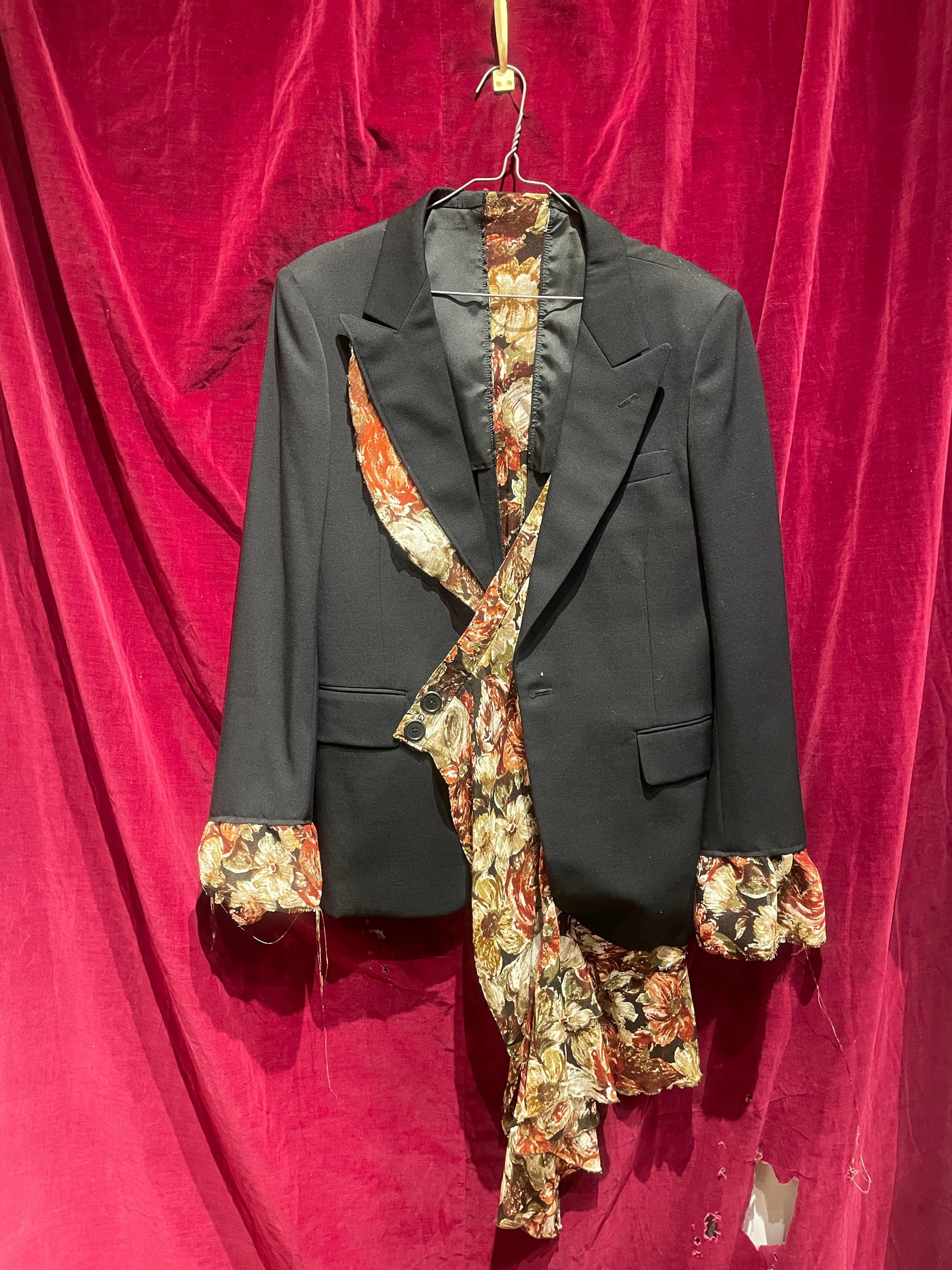 テーラードジャケットの前開きをギミック的に開くようリメイク。エレガントな柄と合わせアシンメトリー化した一着。