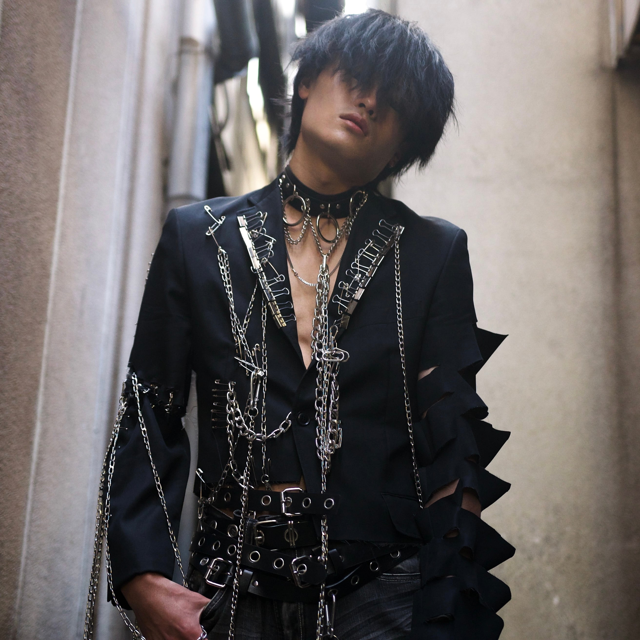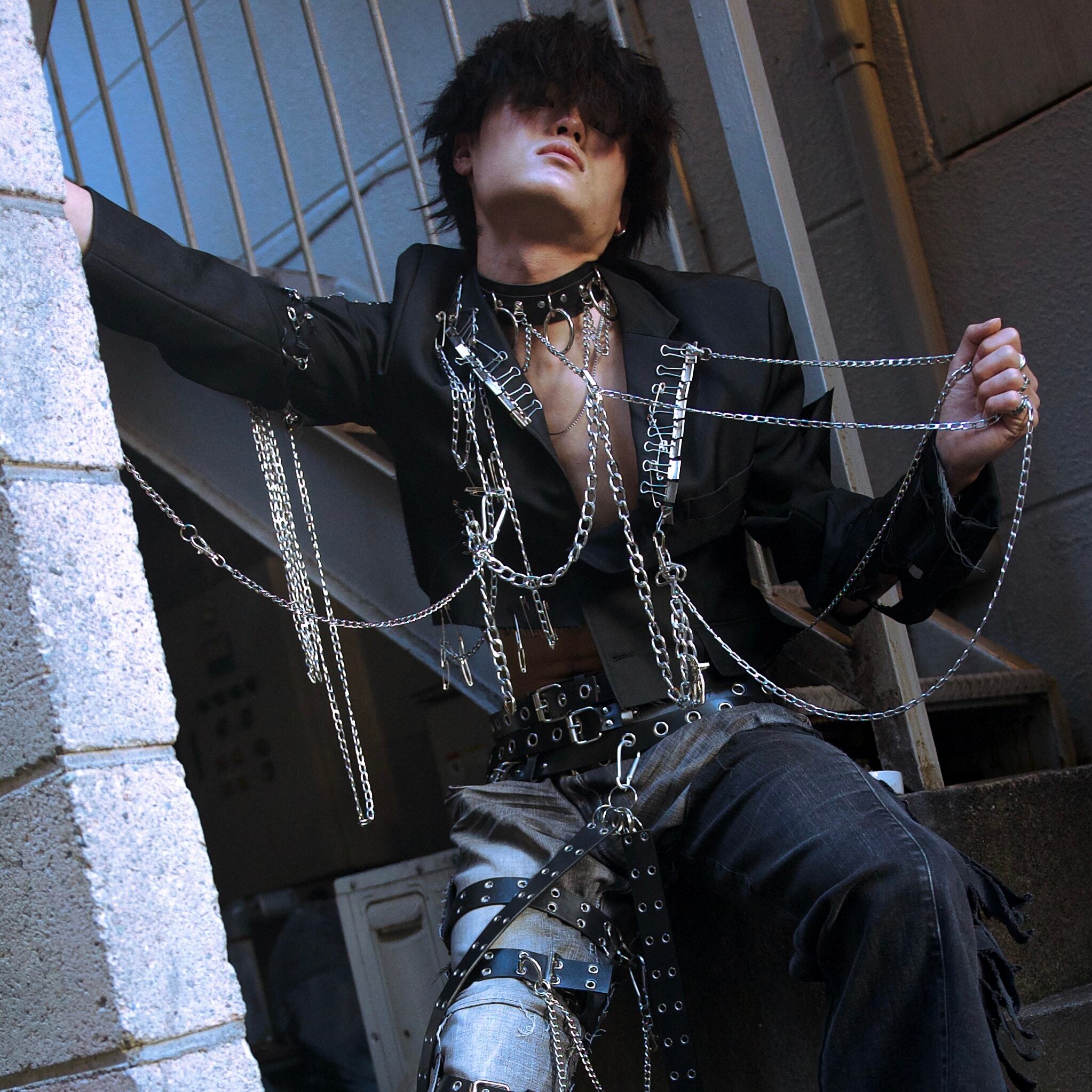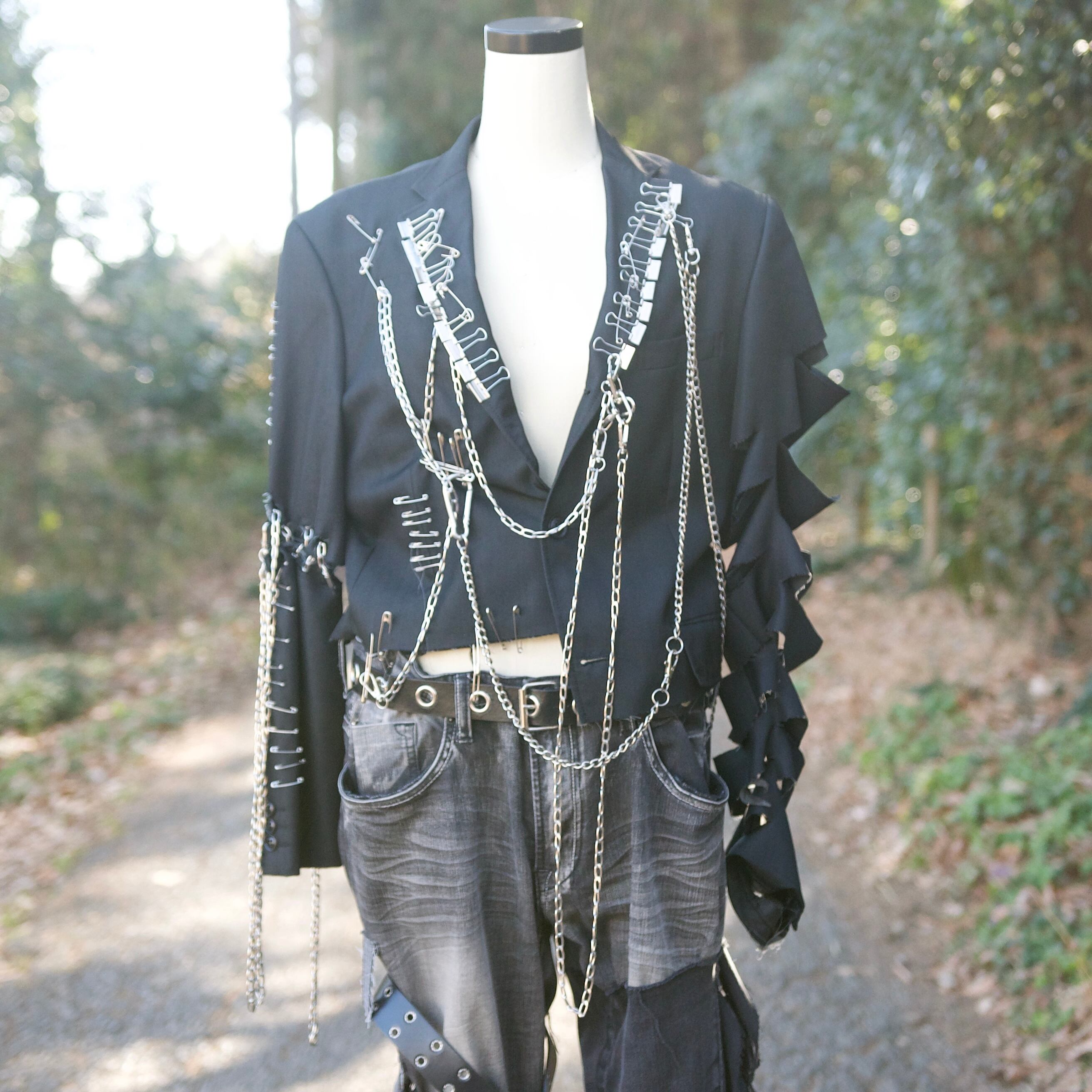 テーラードジャケットに体力のシルバーアクセサリを使って装飾しています。