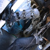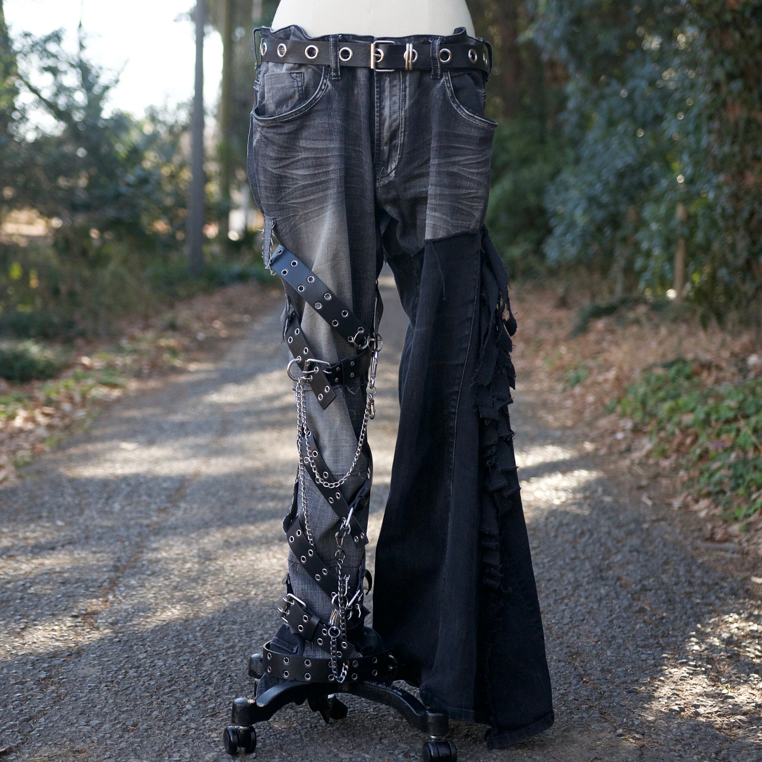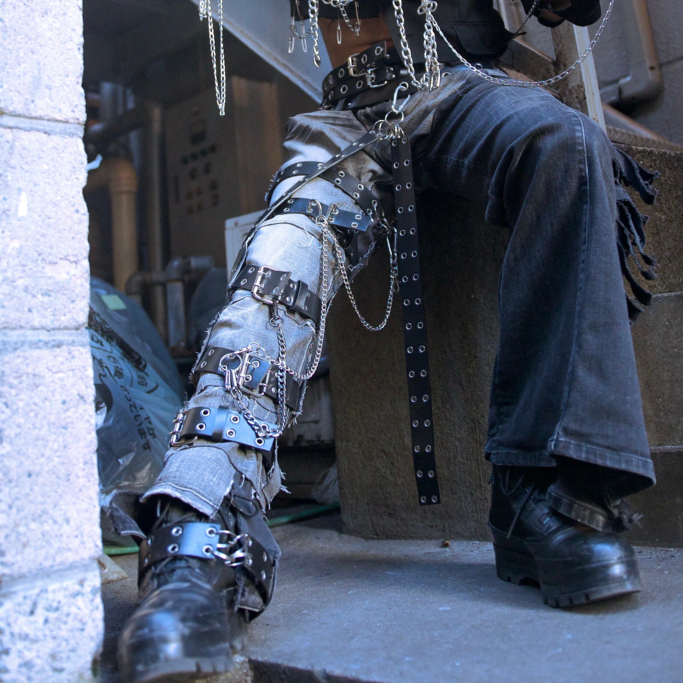 右足にベルト、シルバーチェーンを巻き付けてパンクを演出しています。