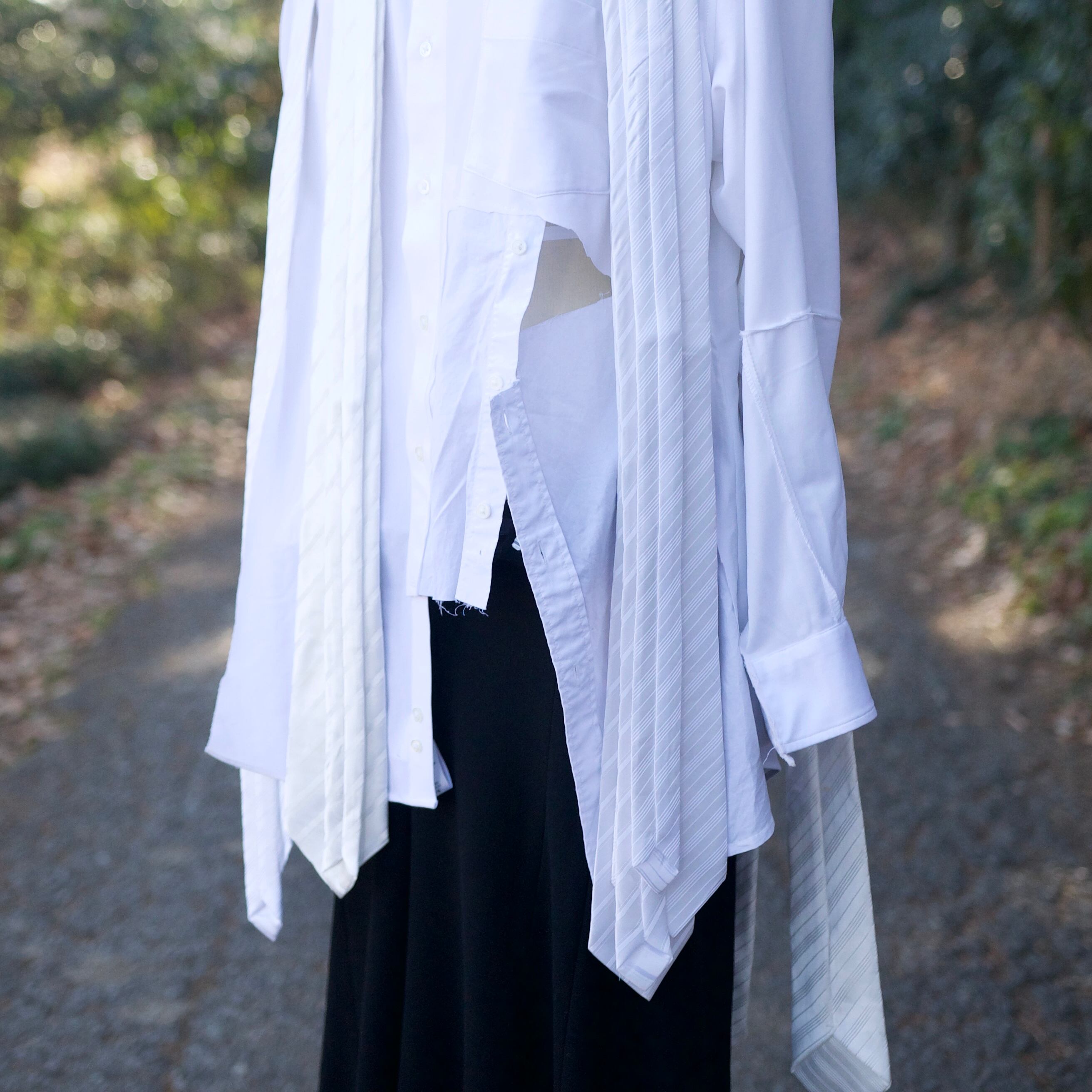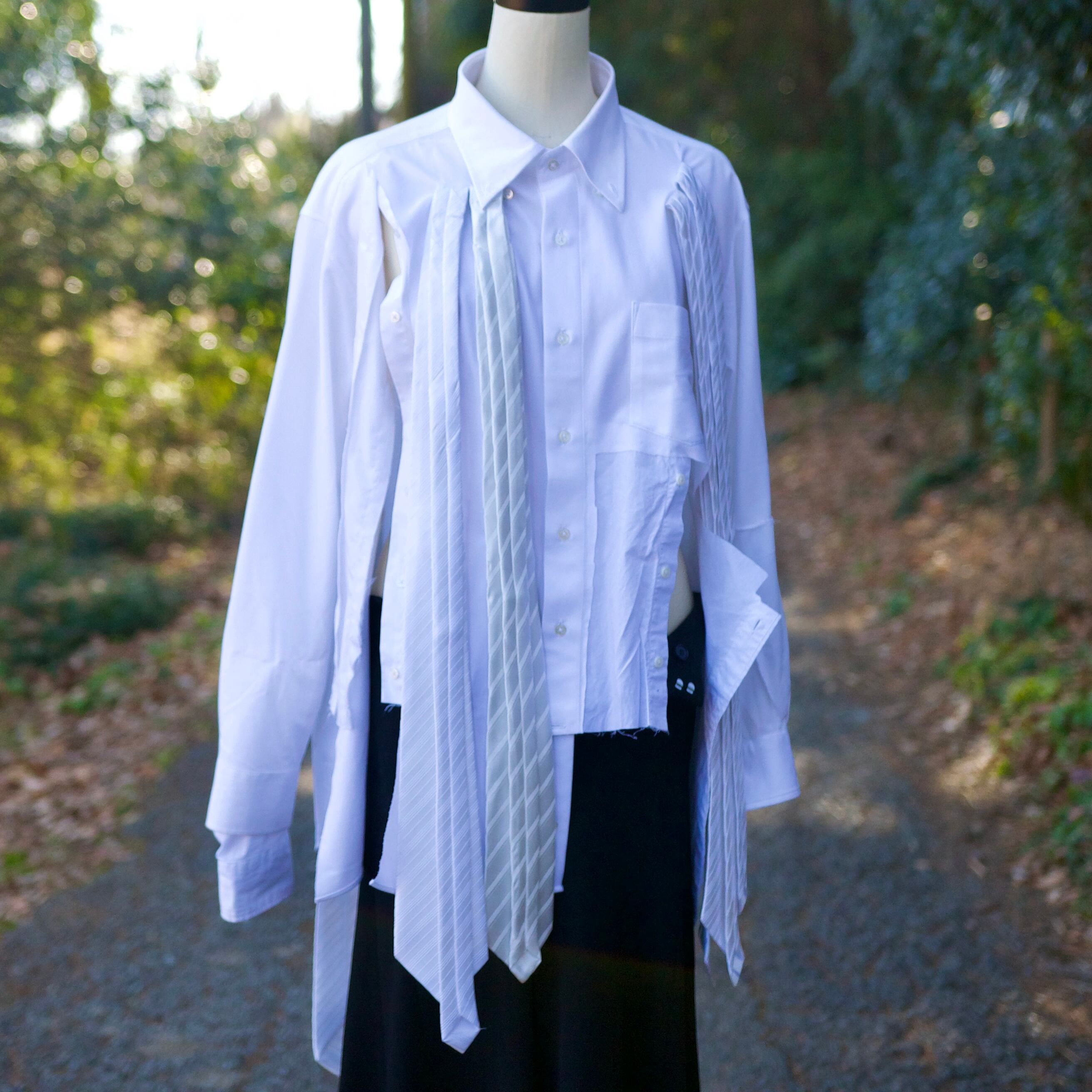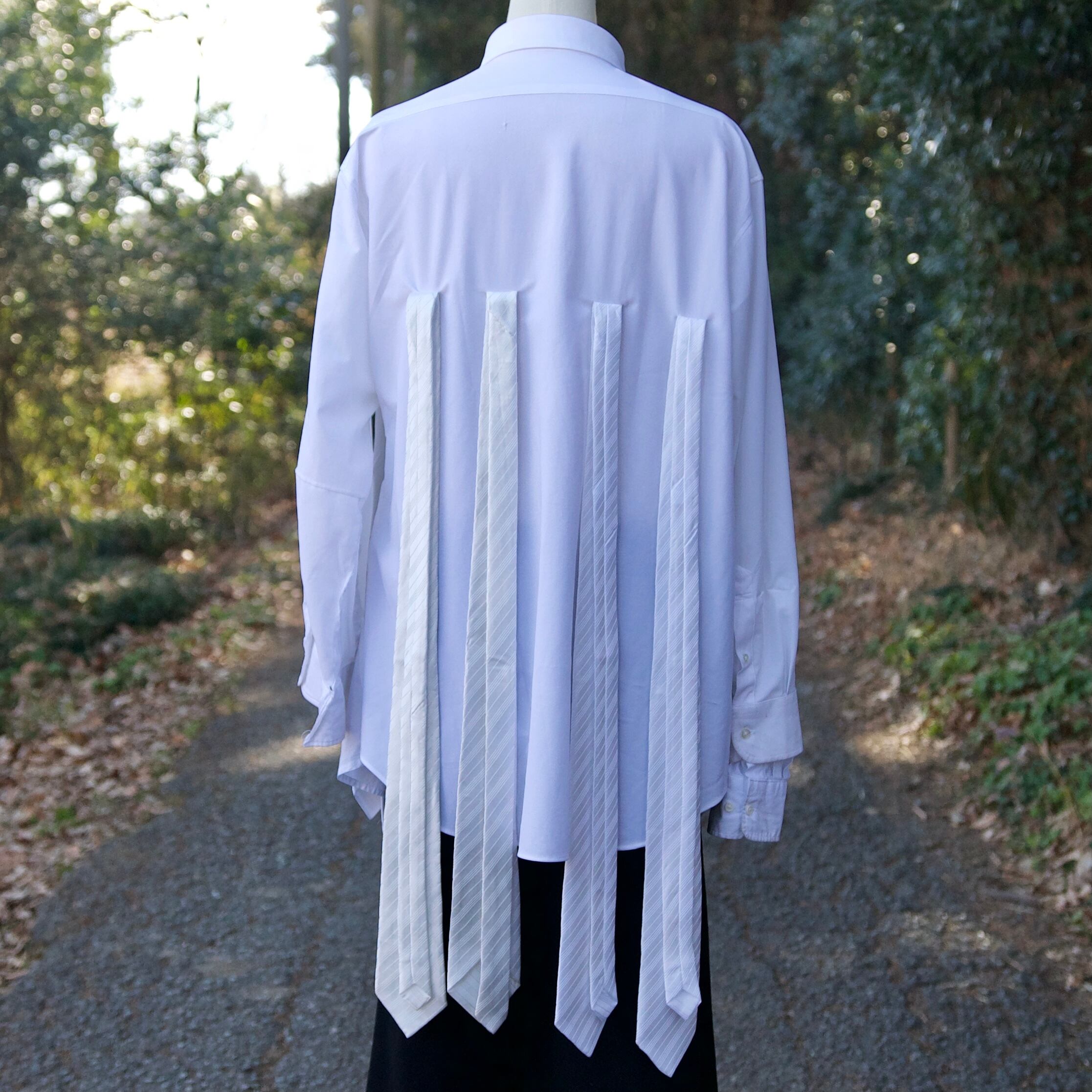 白シャツを3枚使って再構築し、白のネクタイを前に4本、後ろに4本の計8本を縫い付けて、動きのあるシャツを作成致しました。