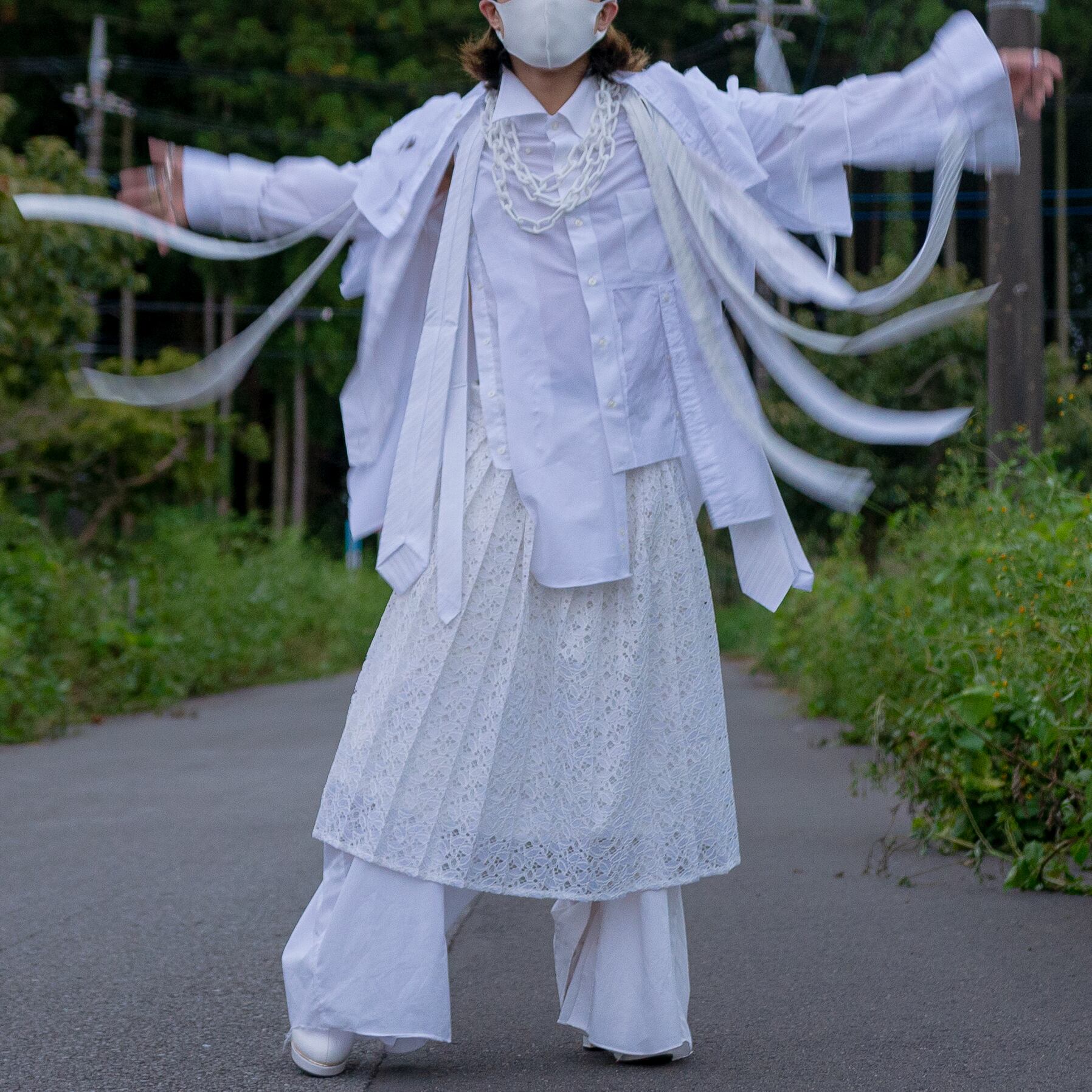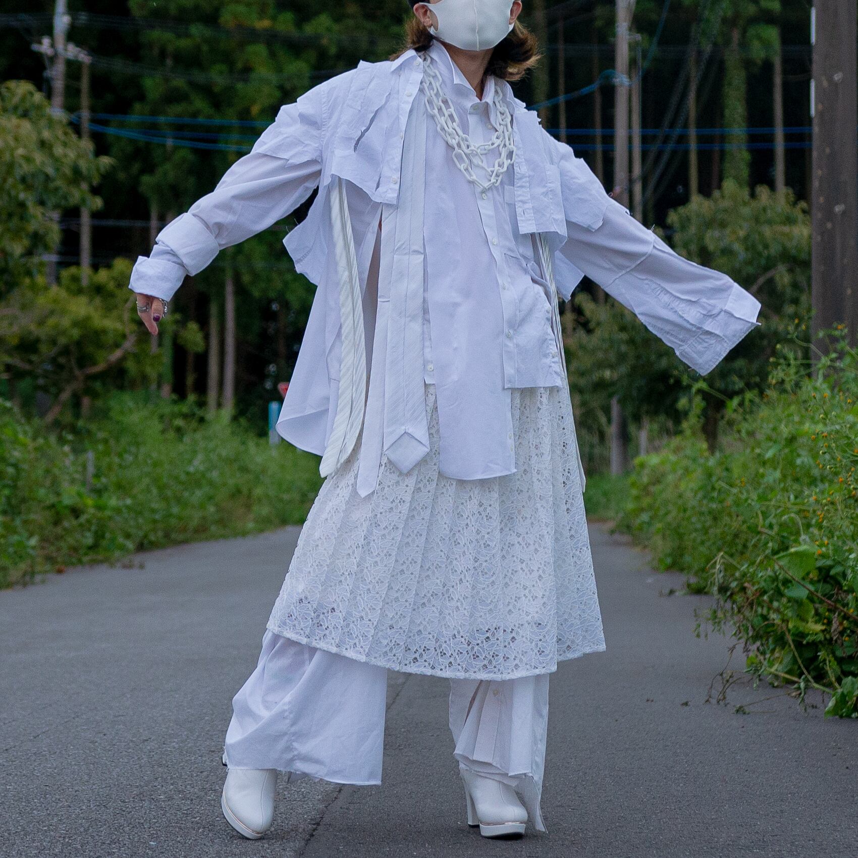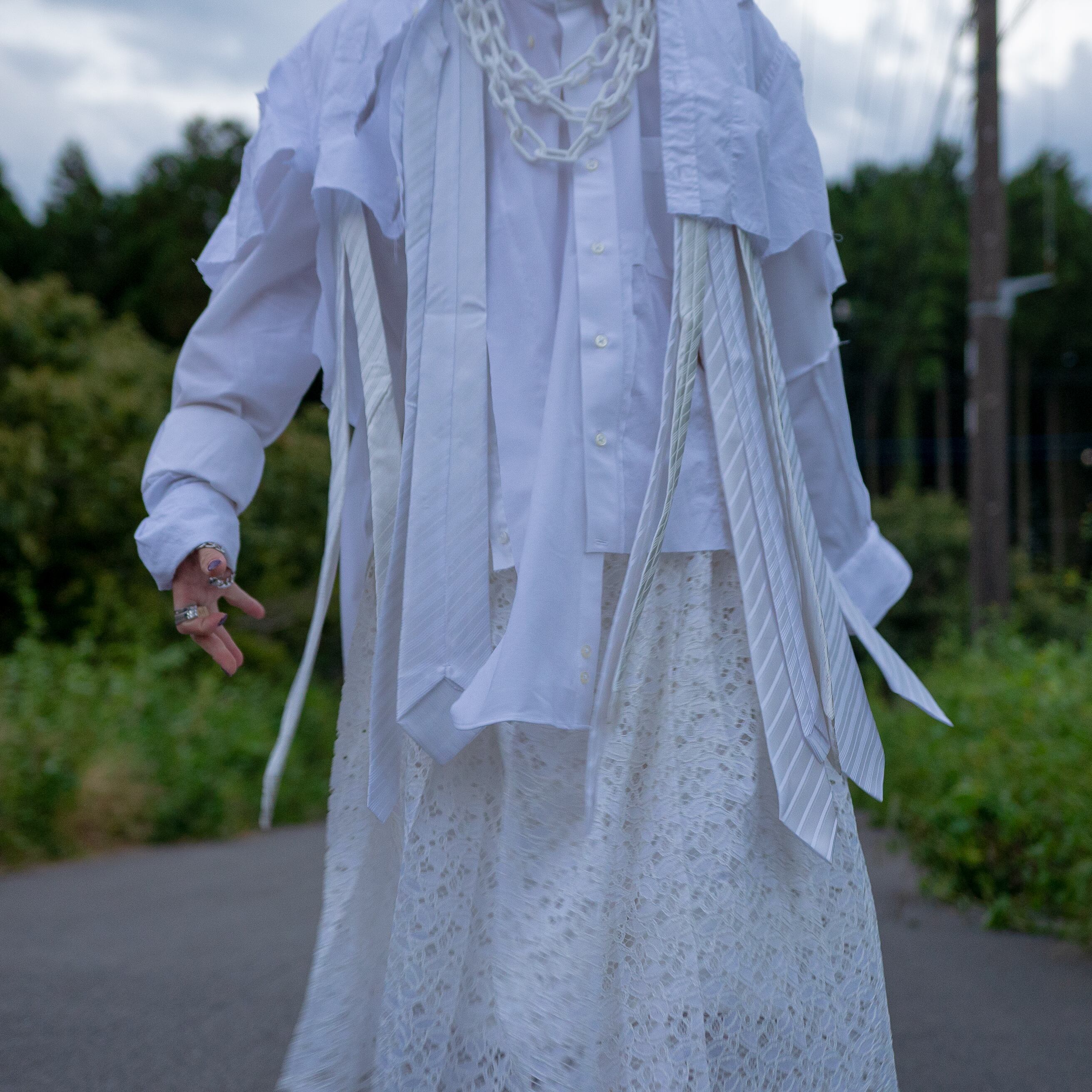 白シャツを3枚使って再構築し、白のネクタイを前に4本、後ろに4本の計8本を縫い付けて、動きのあるシャツを作成致しました。