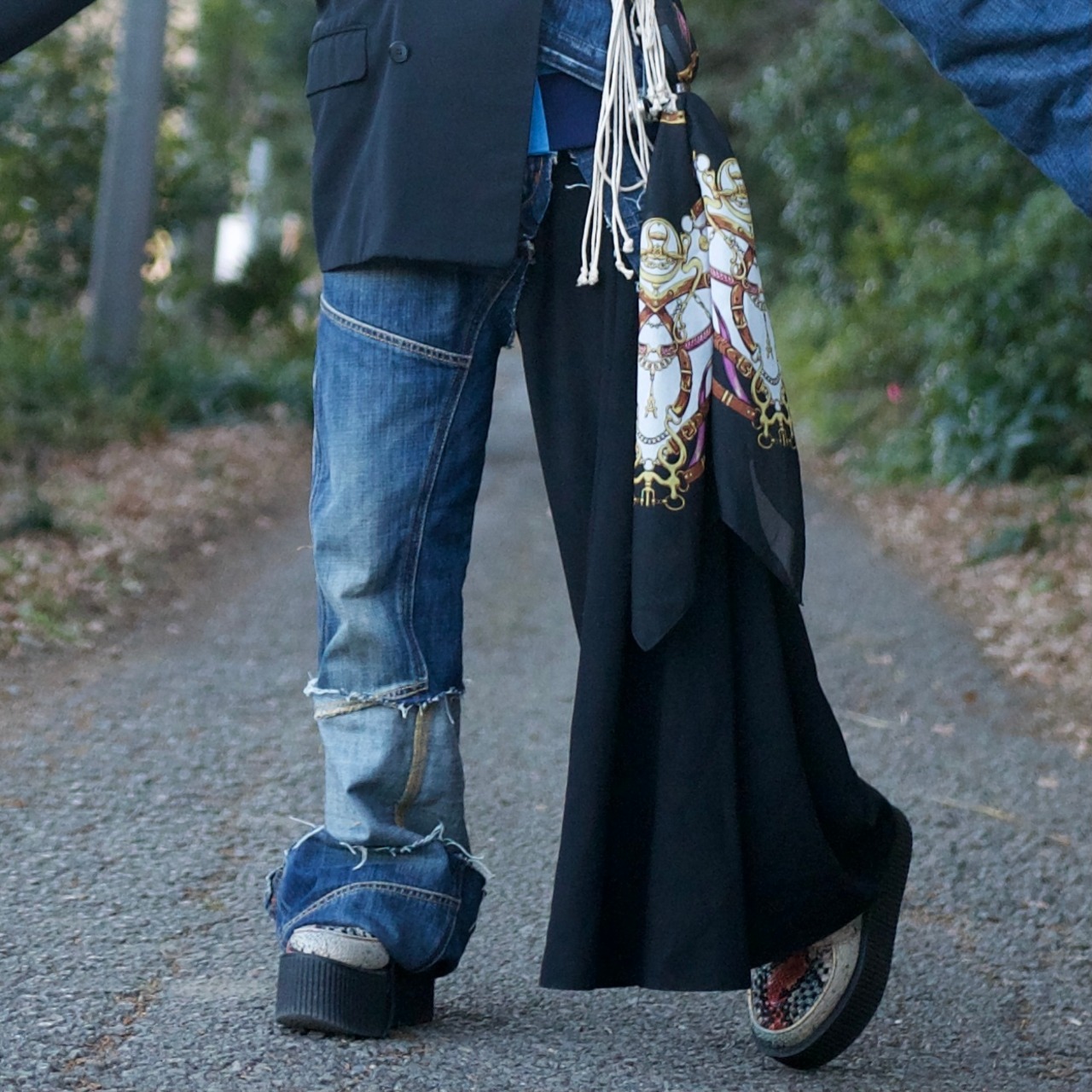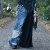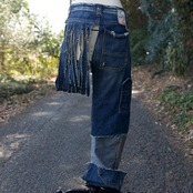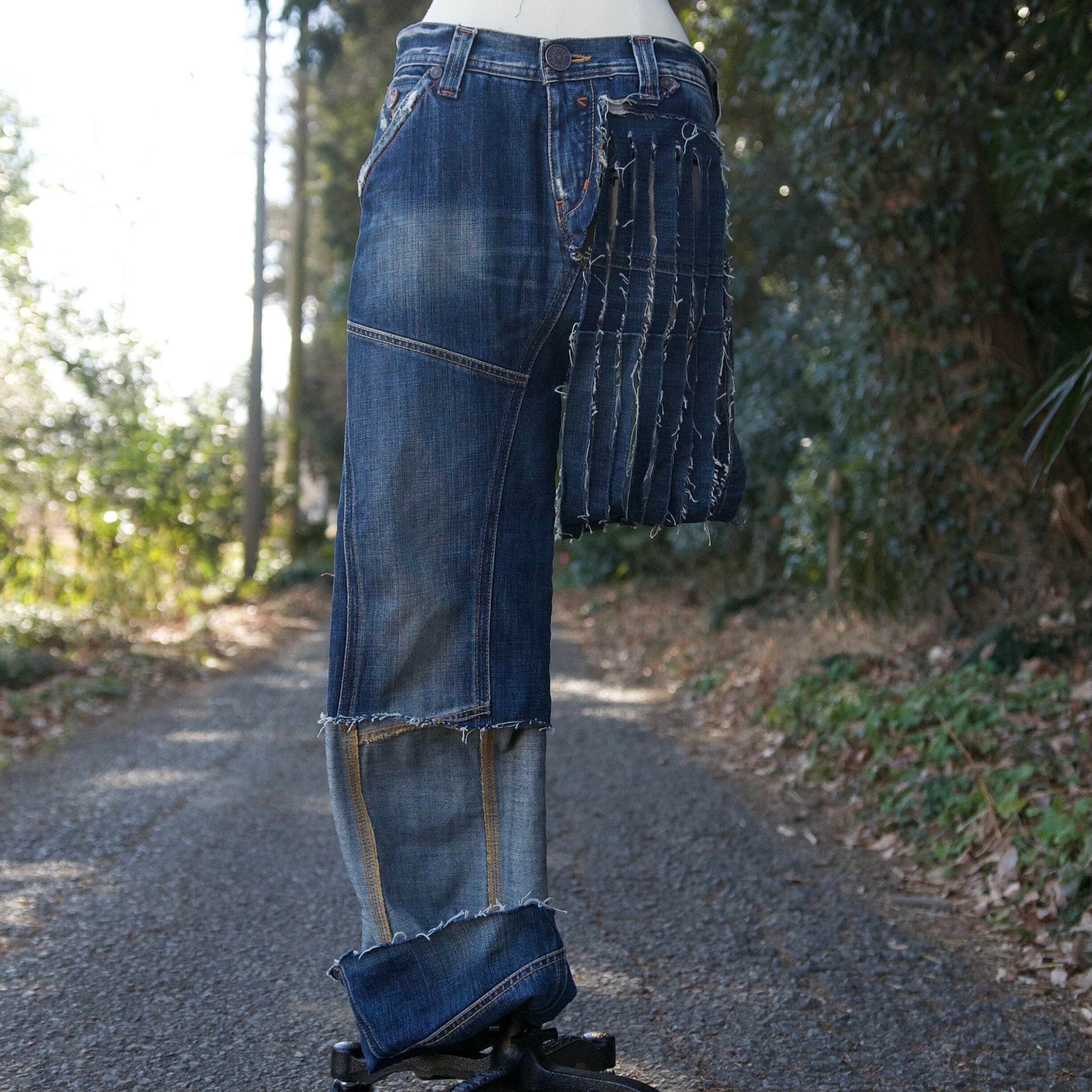 右足は丈が長めのデニムパンツになっていて、左足にはベルトループ部分からフランジが垂らしてあります。