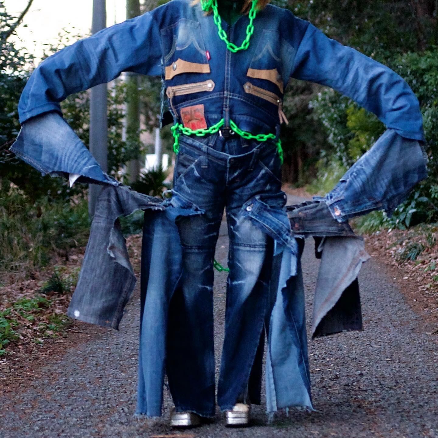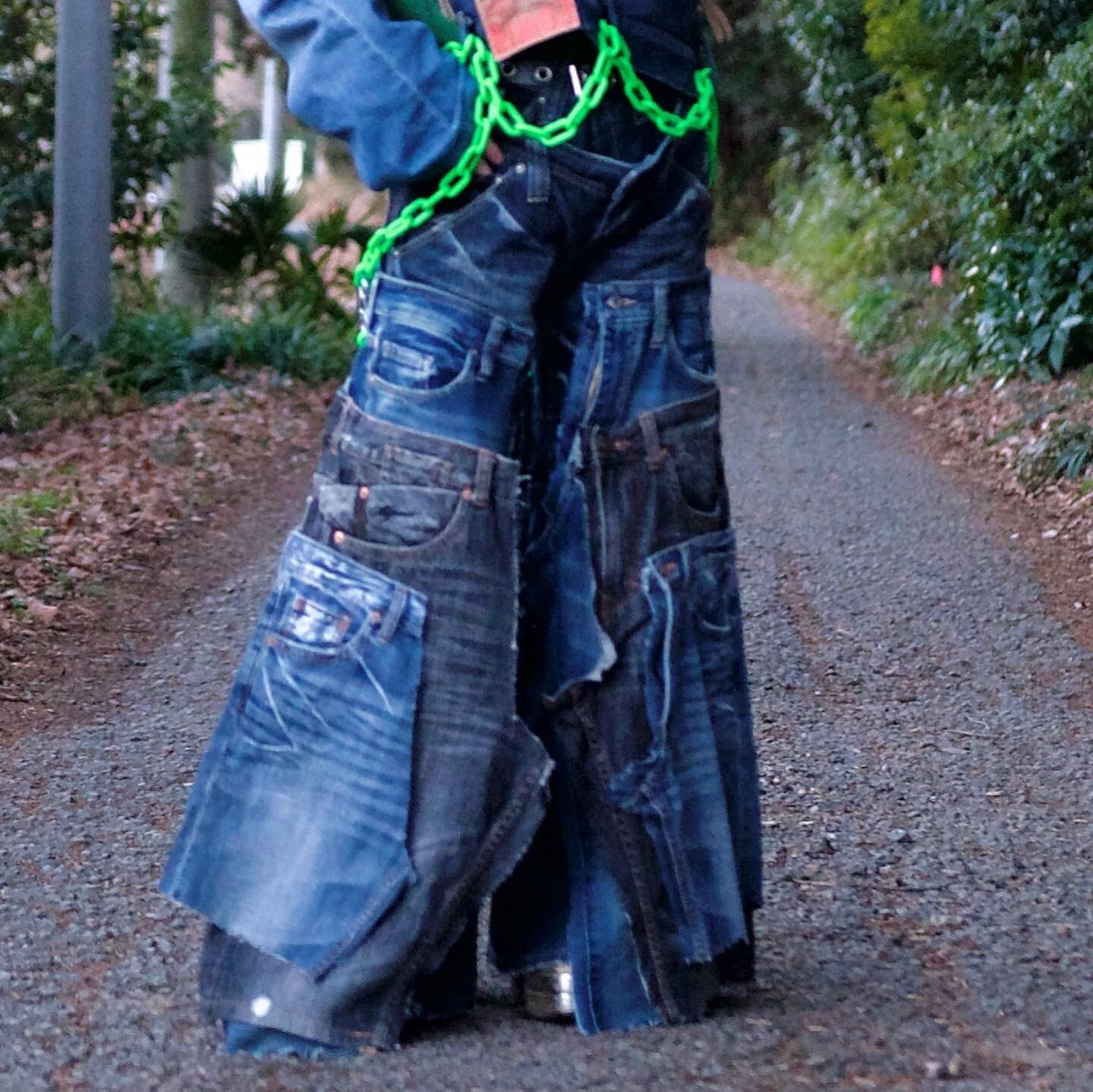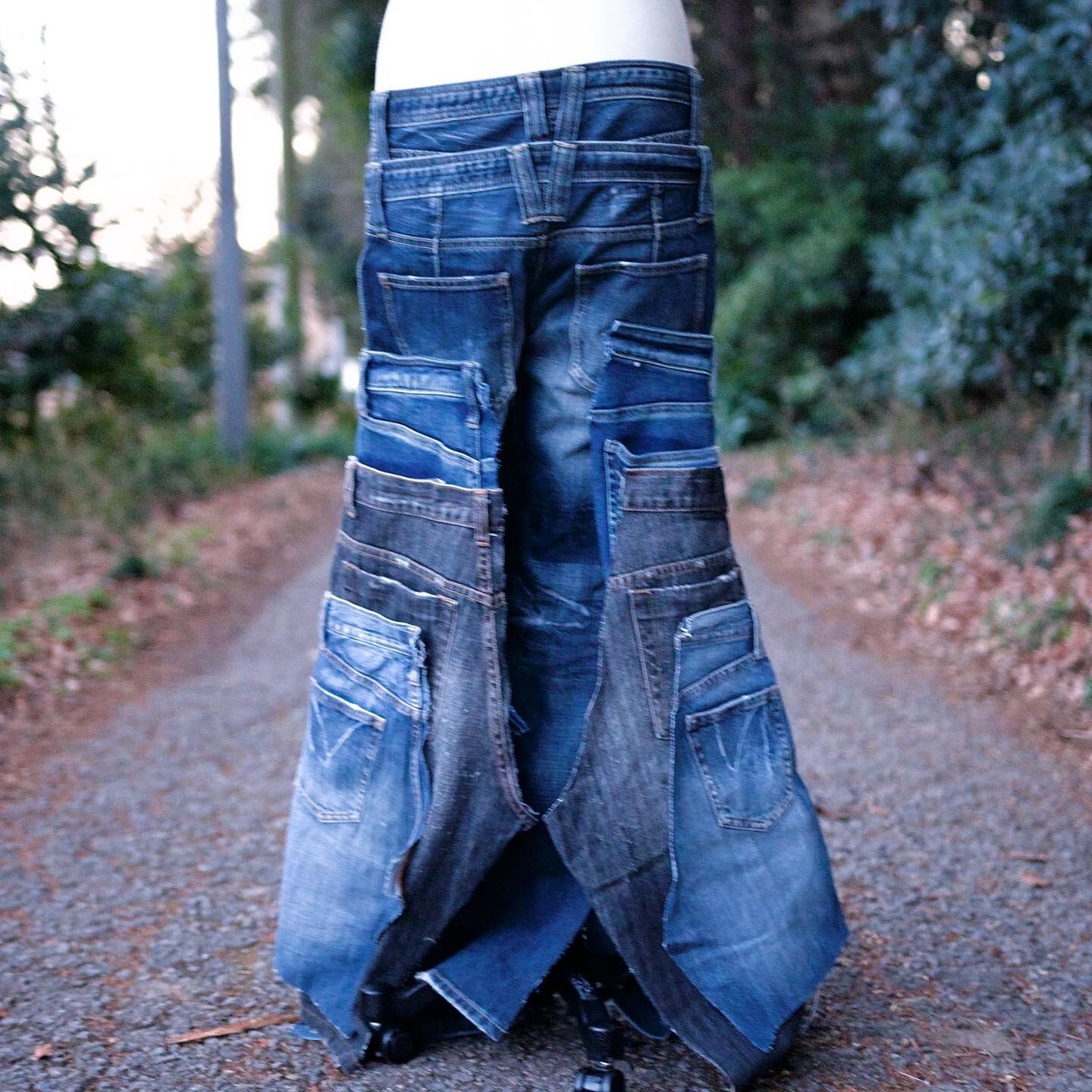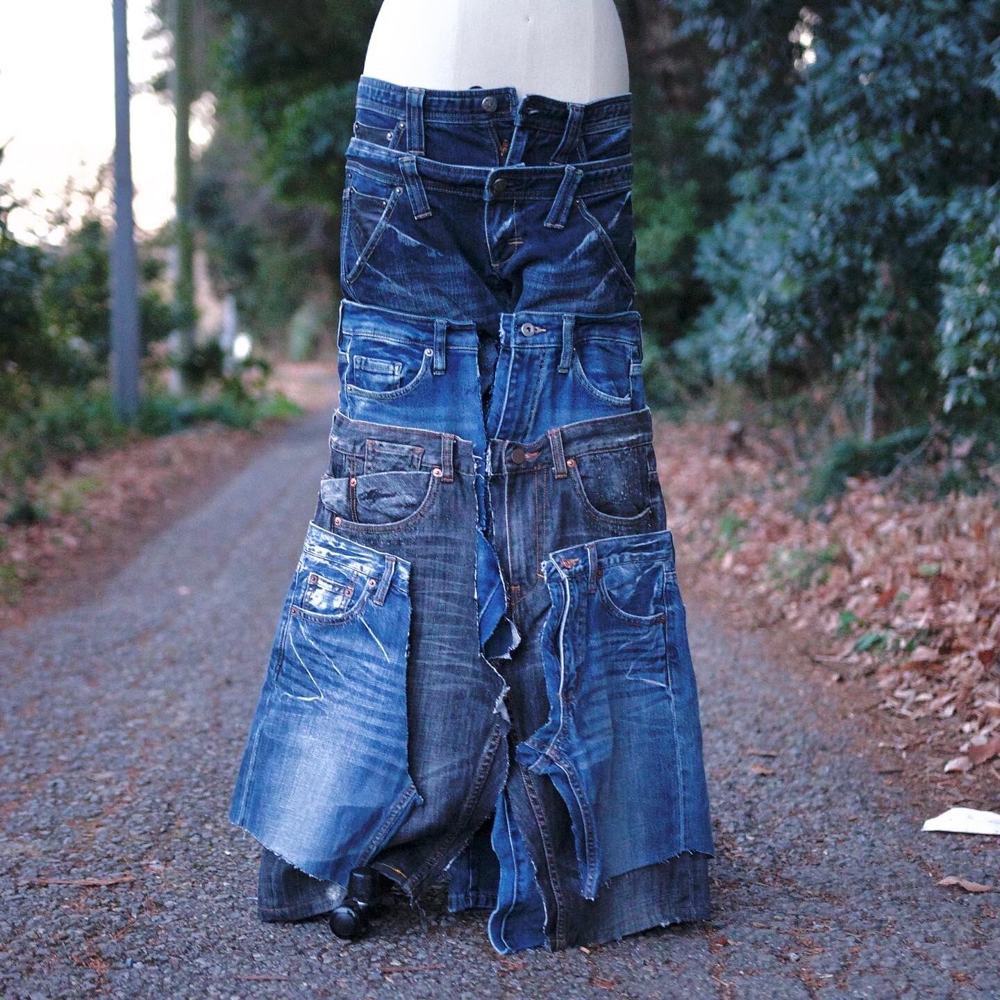 デニムパンツを5枚使い、ストレートデニムの上から被せる形になるようリメイクしました。