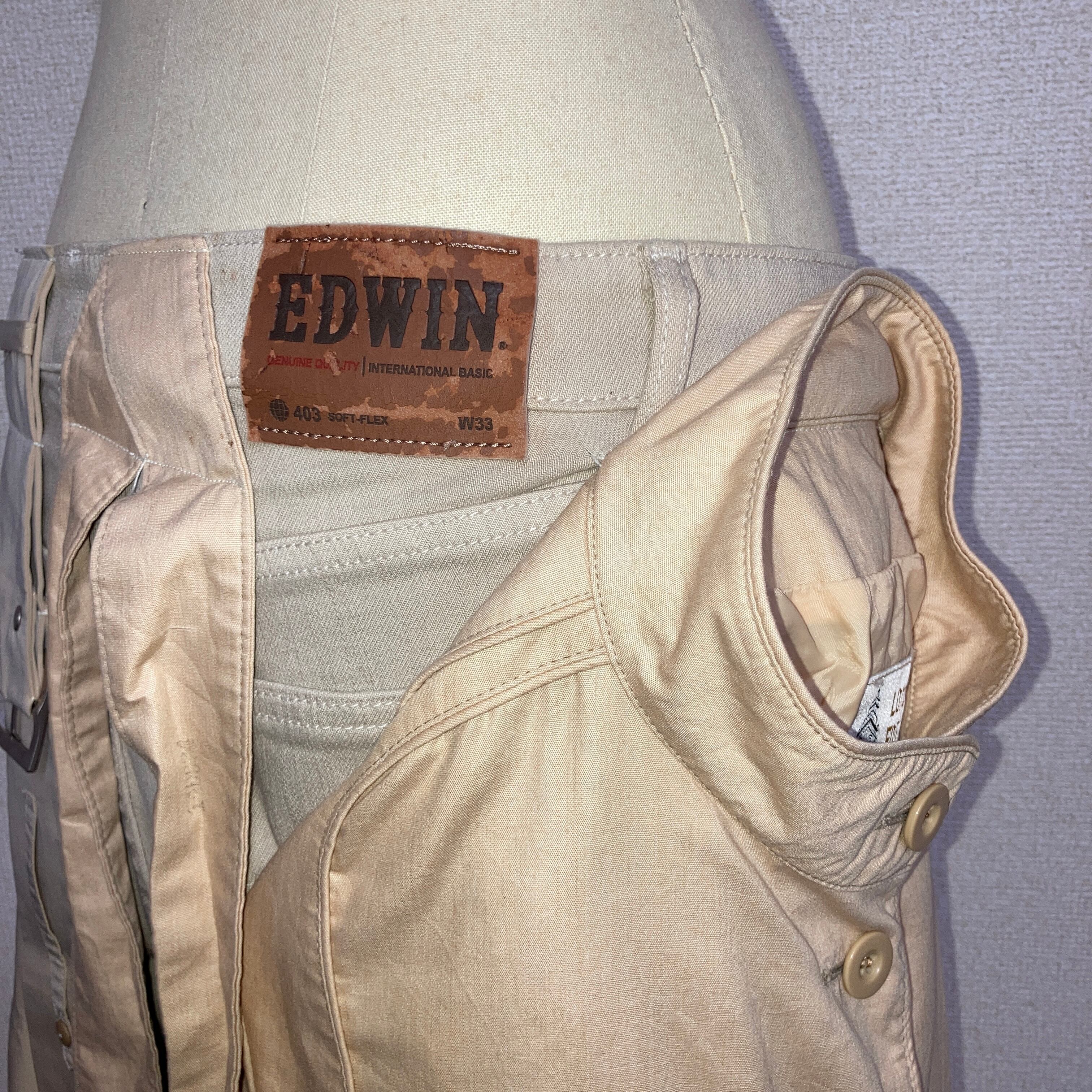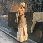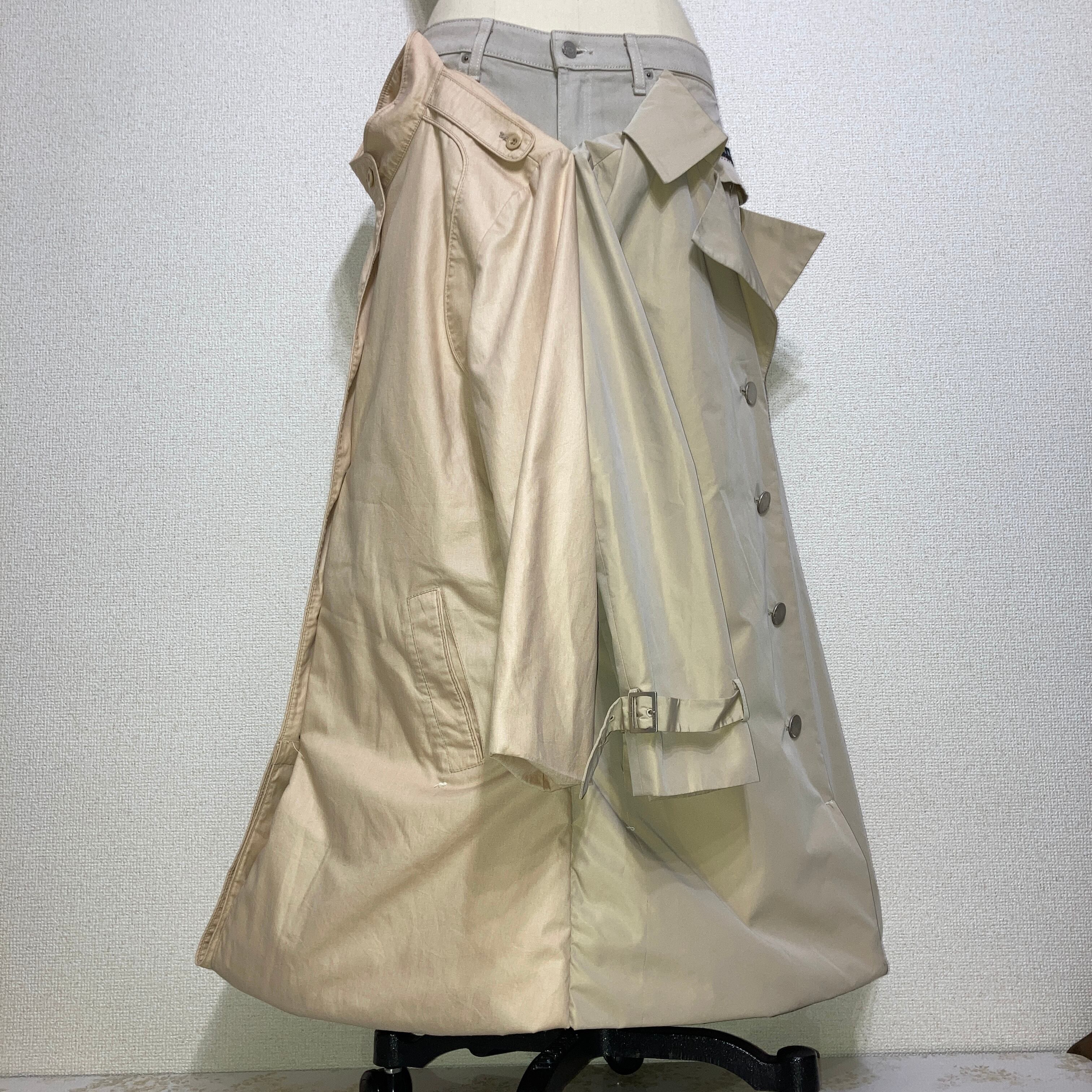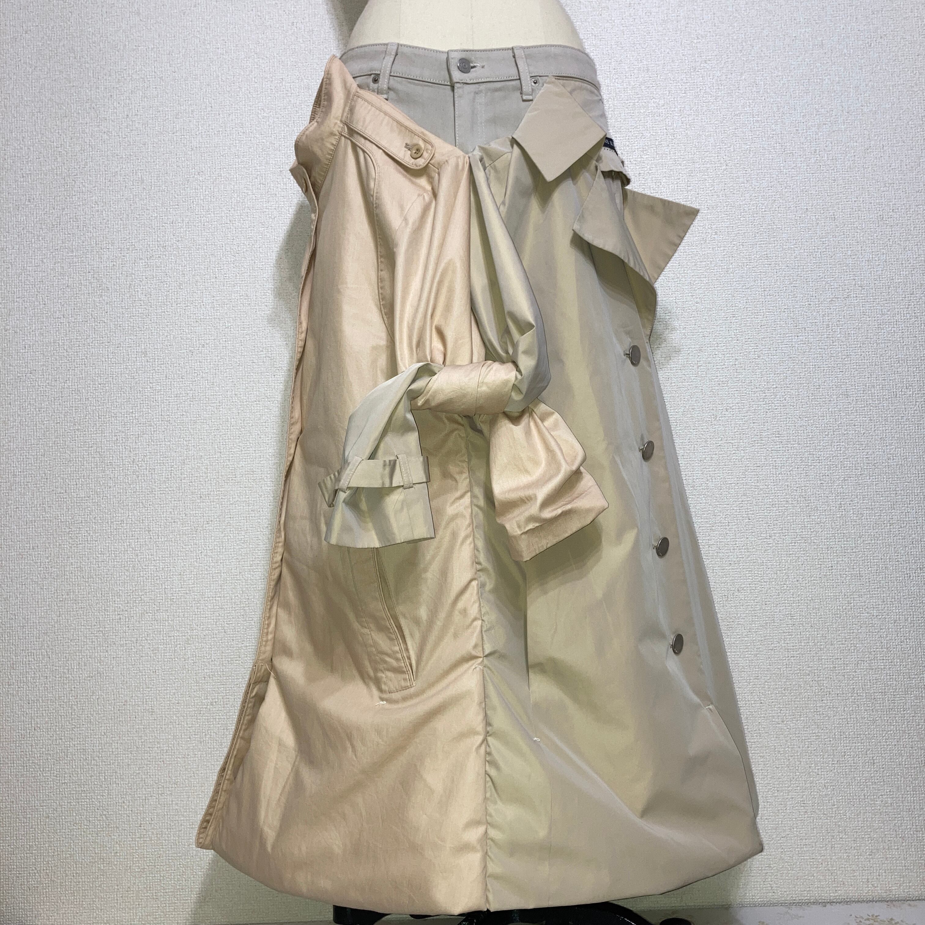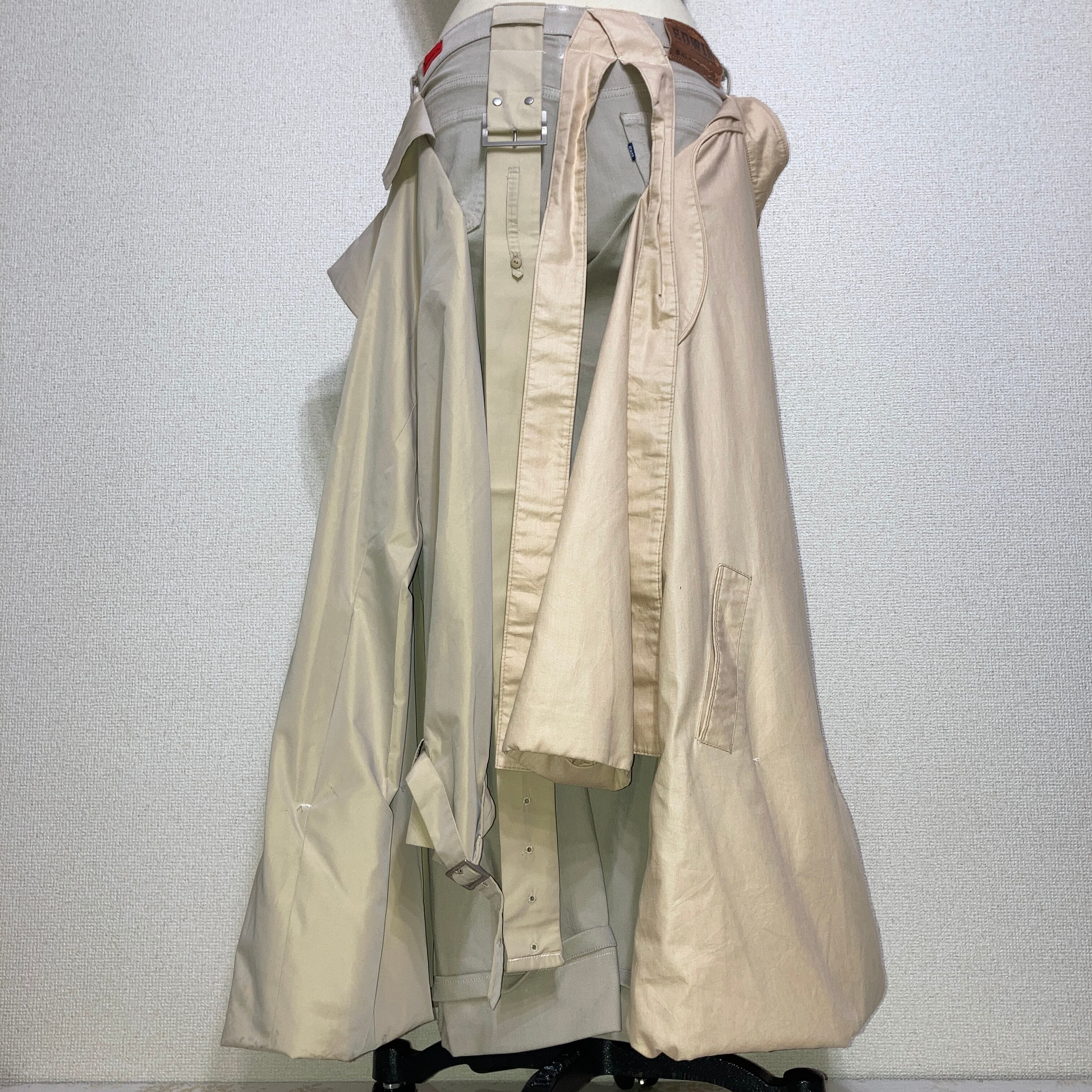 パンツ前面部に2枚のコート、パンツ後面部にはベルトで作られたベルトループが縫い付けてあり、かなりの布量によるAラインを表現したパンツ。