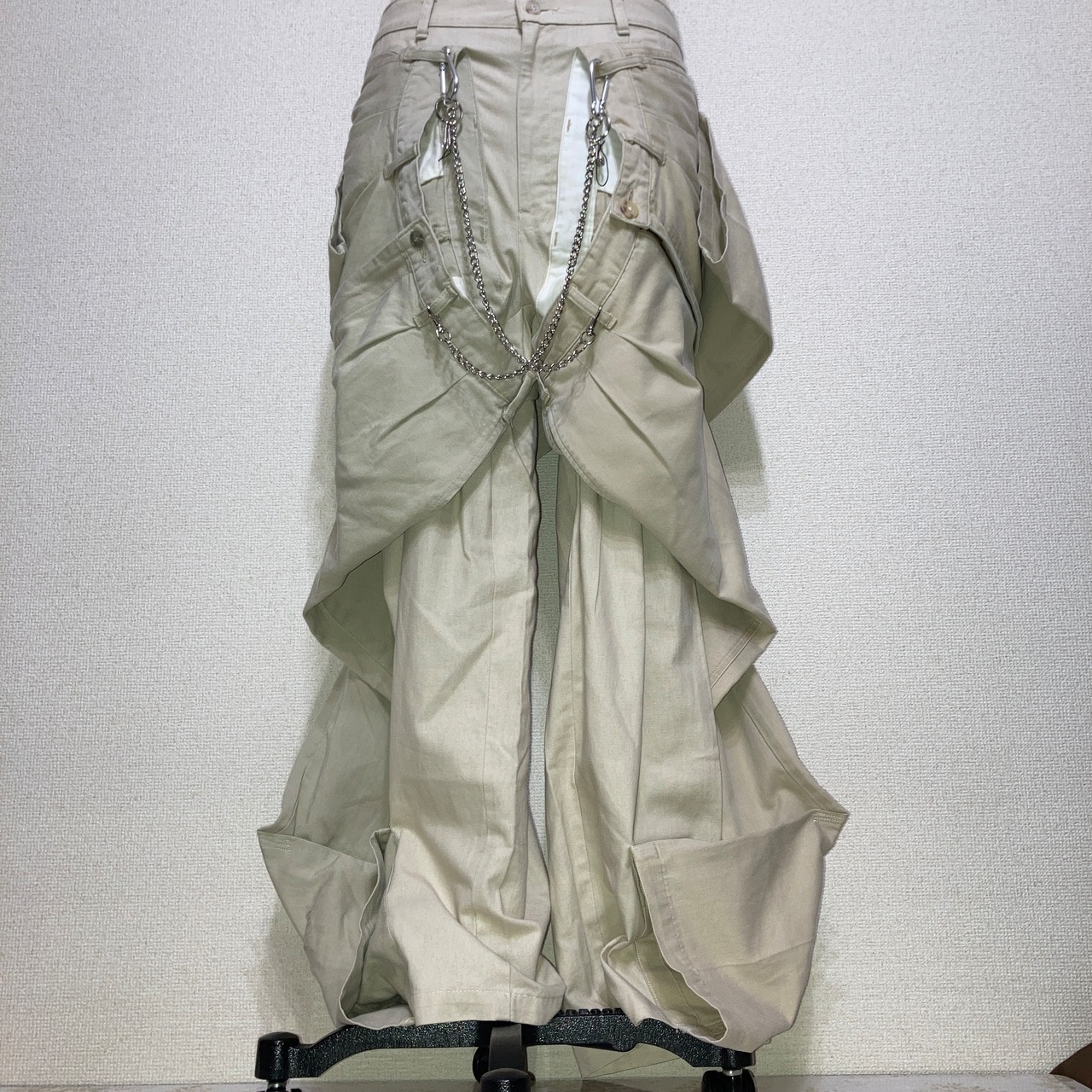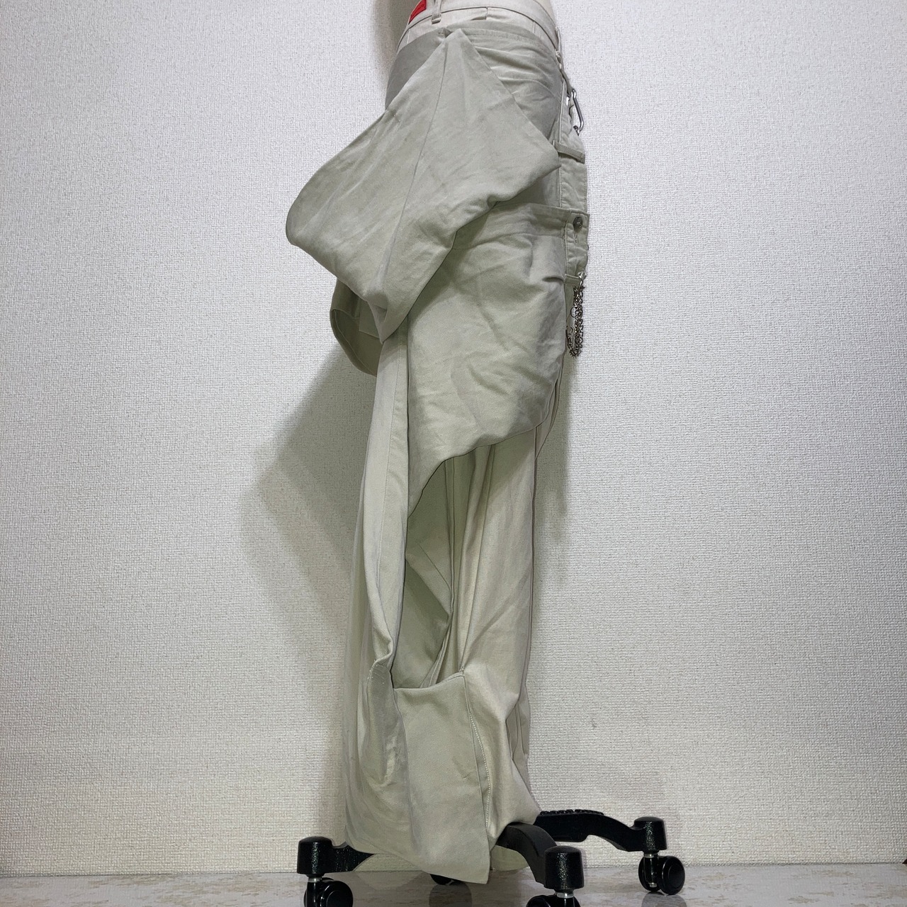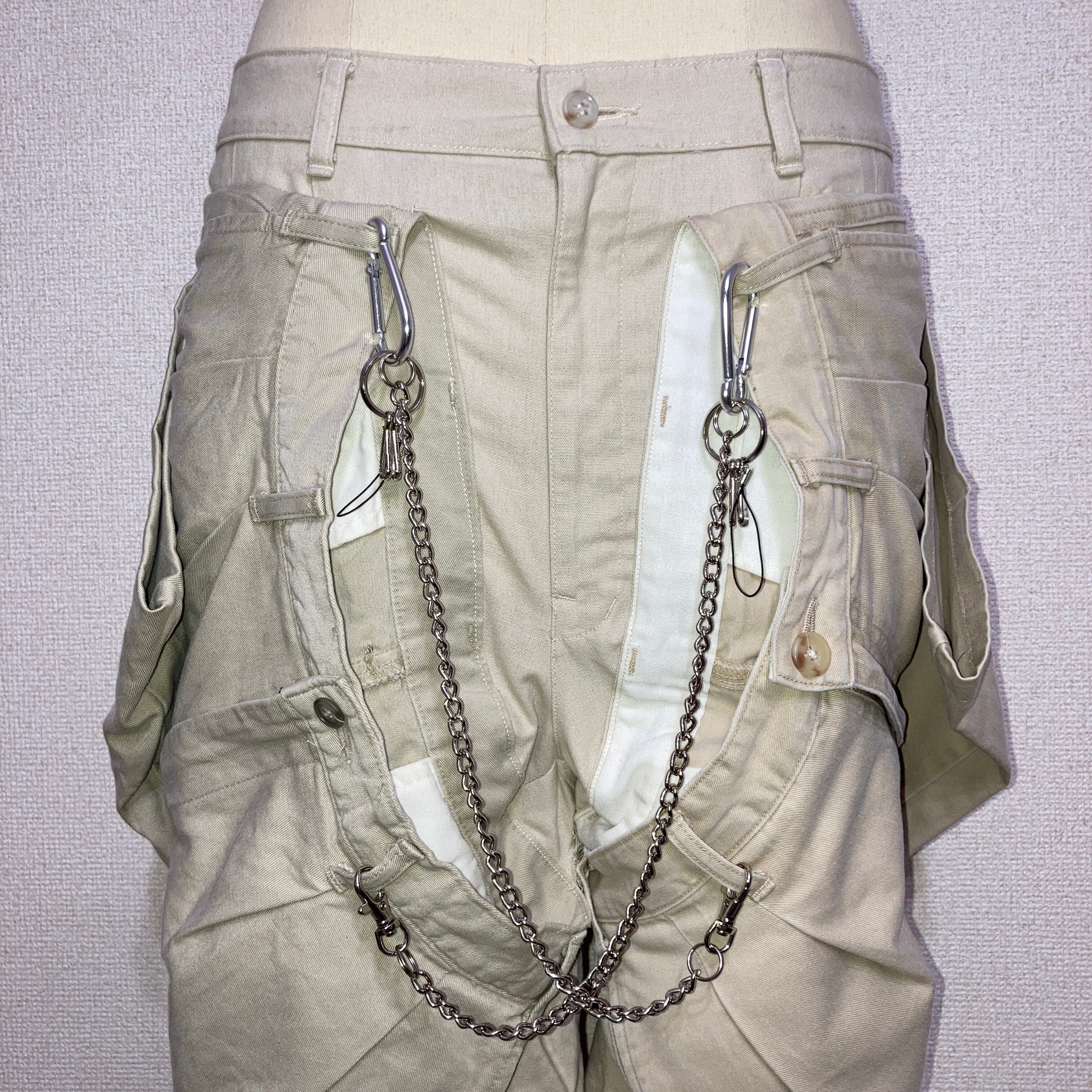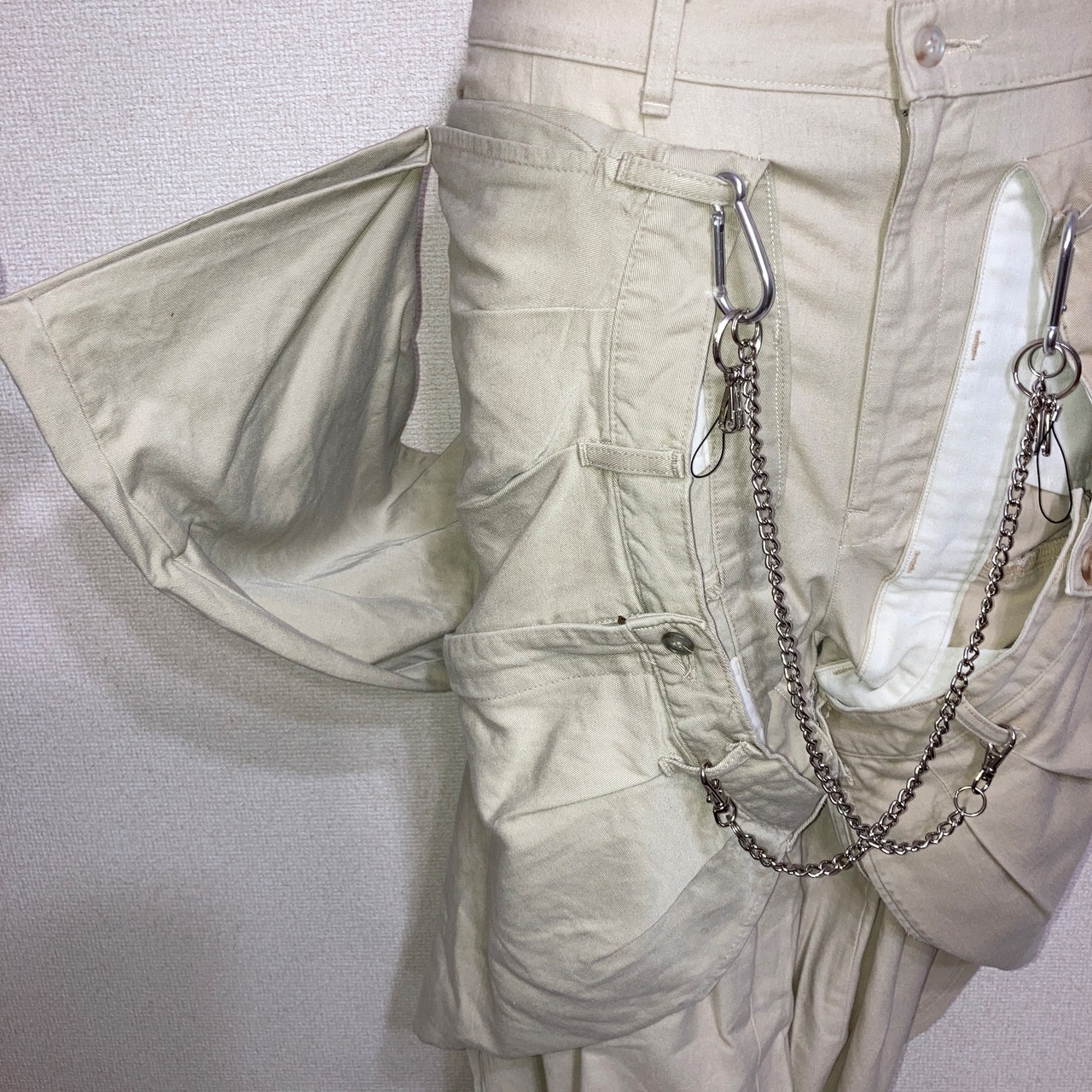 前面部に縫い付けてあるパンツのファスナーとボタンを外し内側を見せる事で更なる抜け感を出す事も可能。