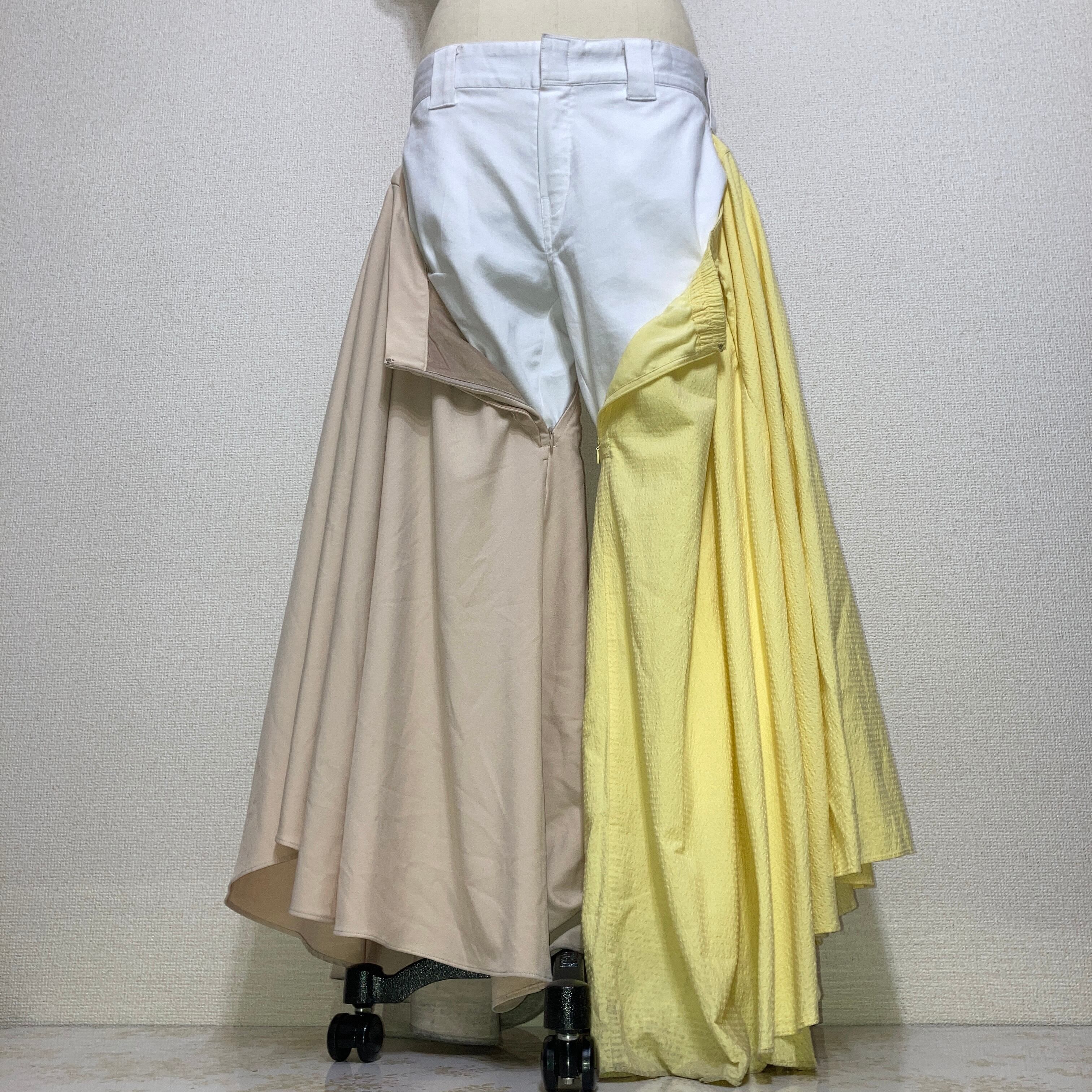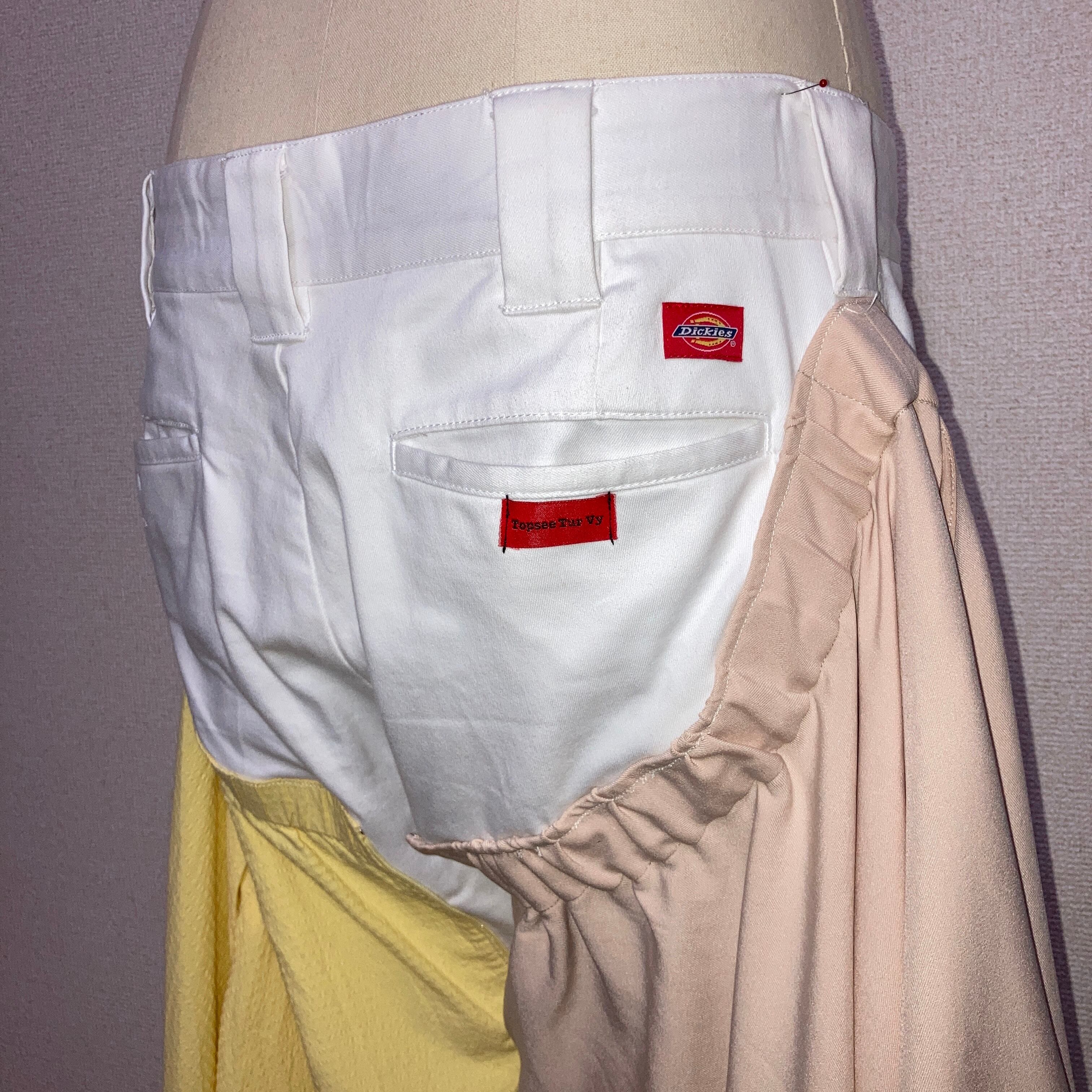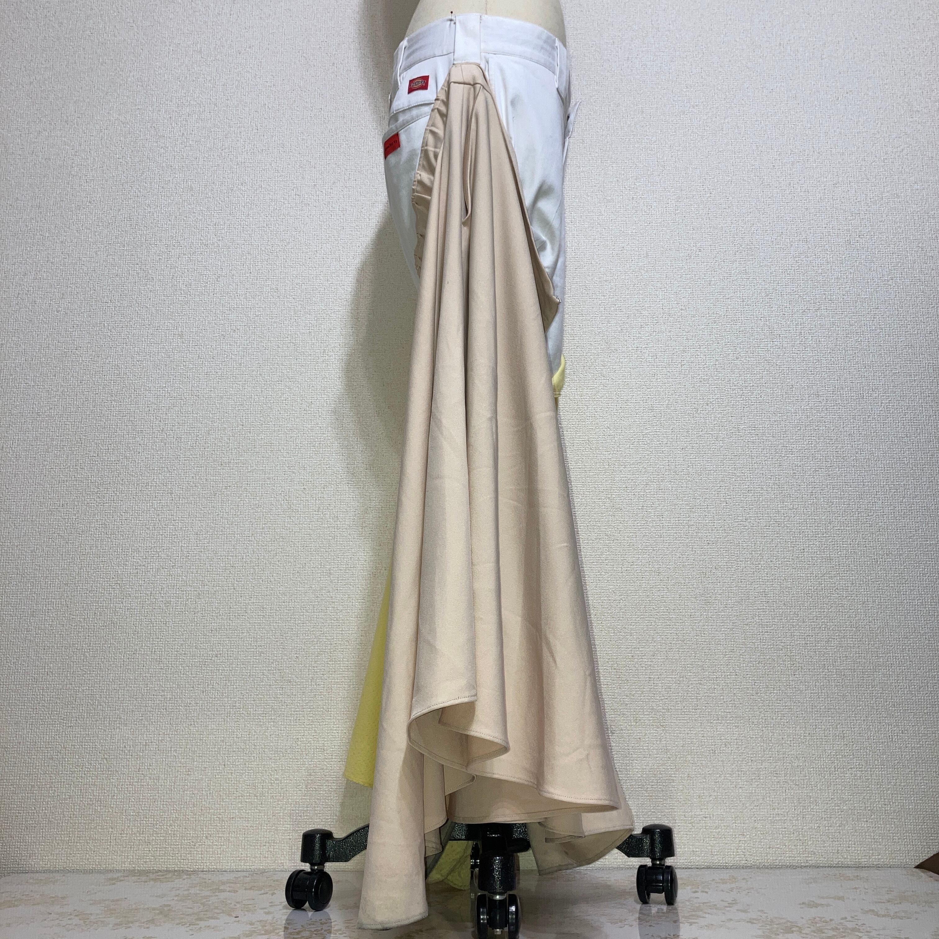 パンツに縫い付けられたフレアスカートによるドレープを最大限活かしたパンツ。