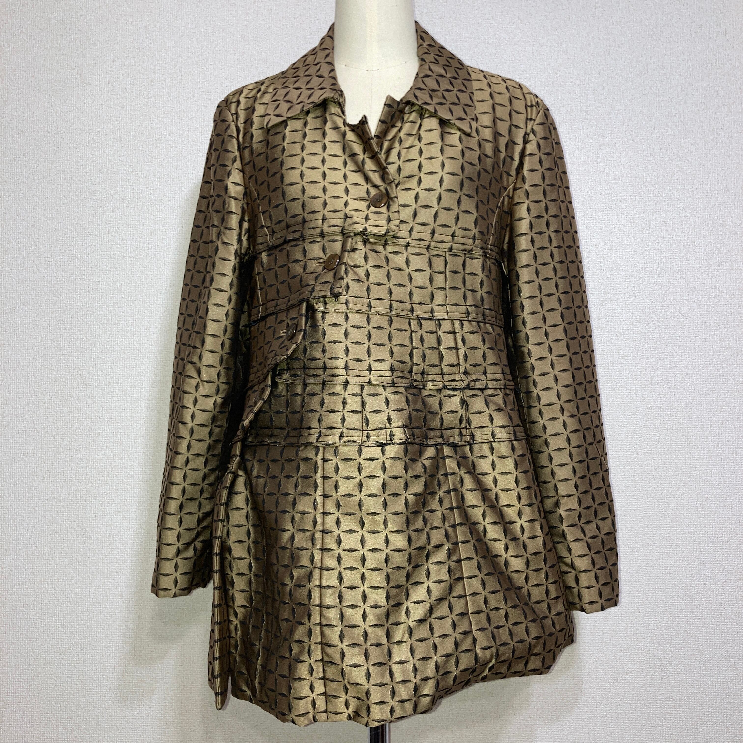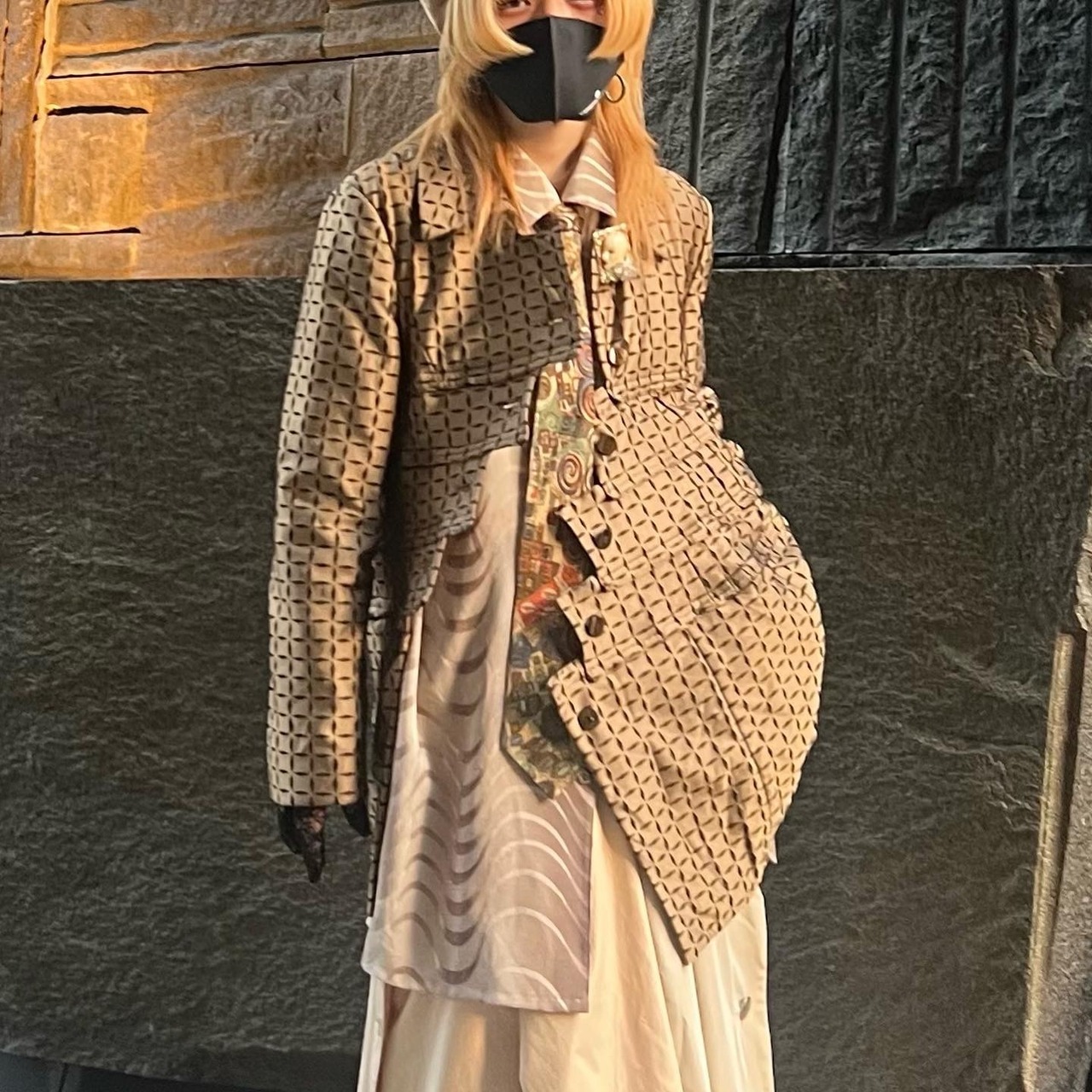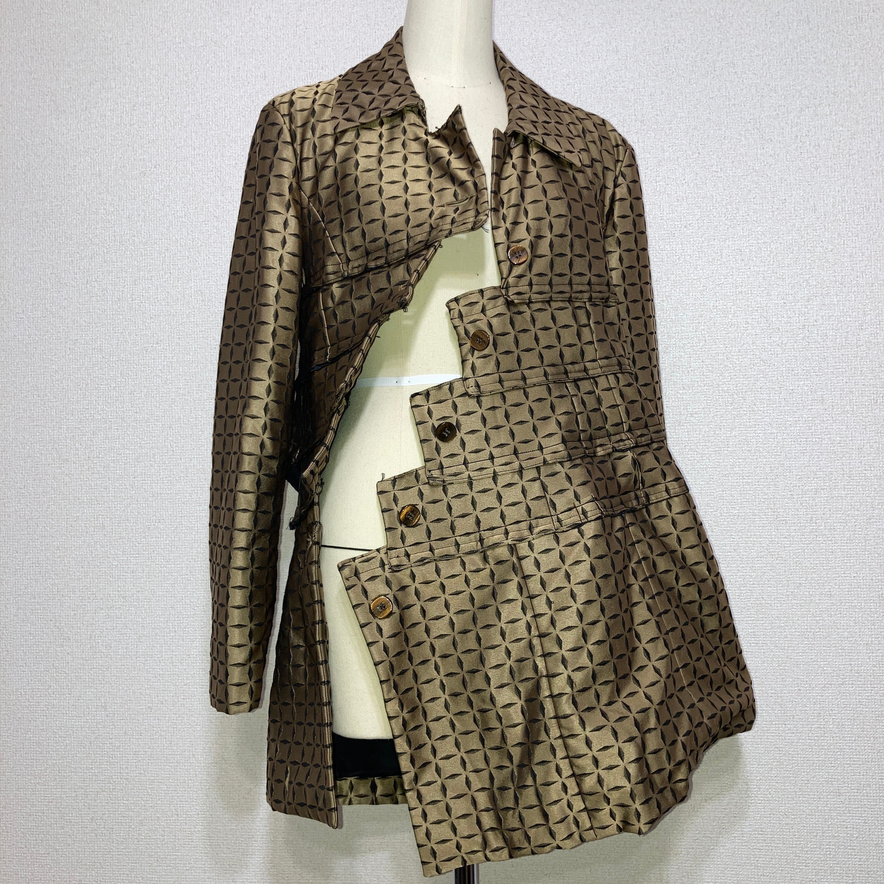 総柄のコートをボタンを軸にずらしてあり、立体感を追求したコート。