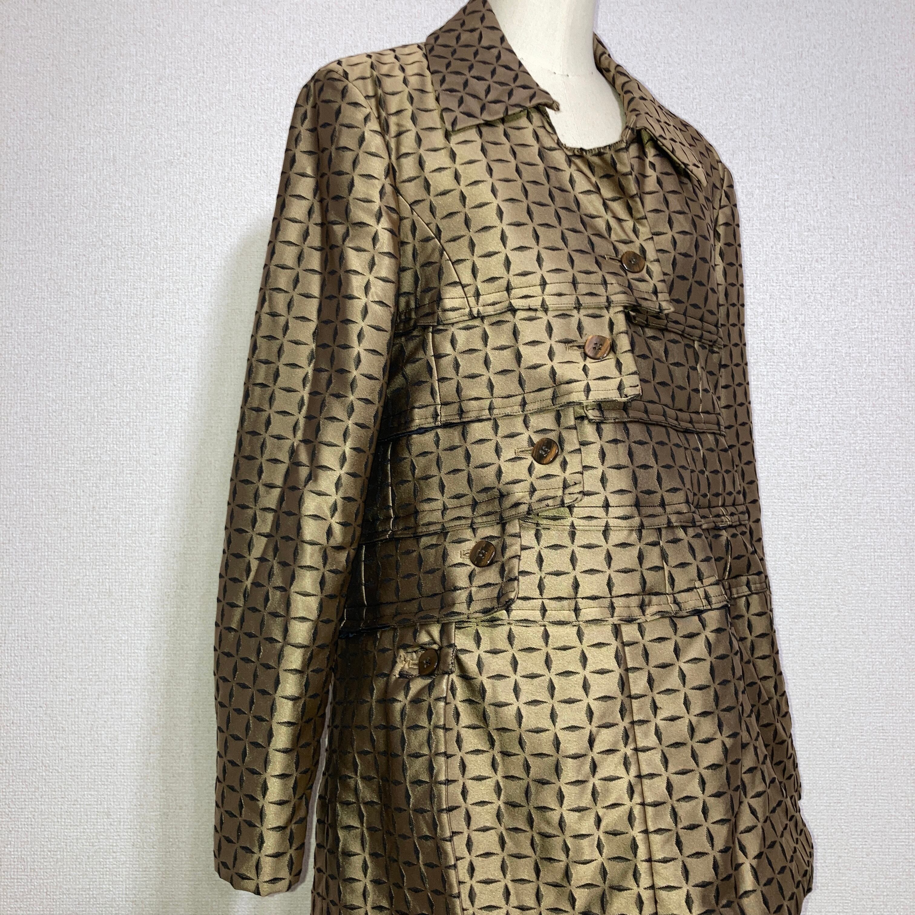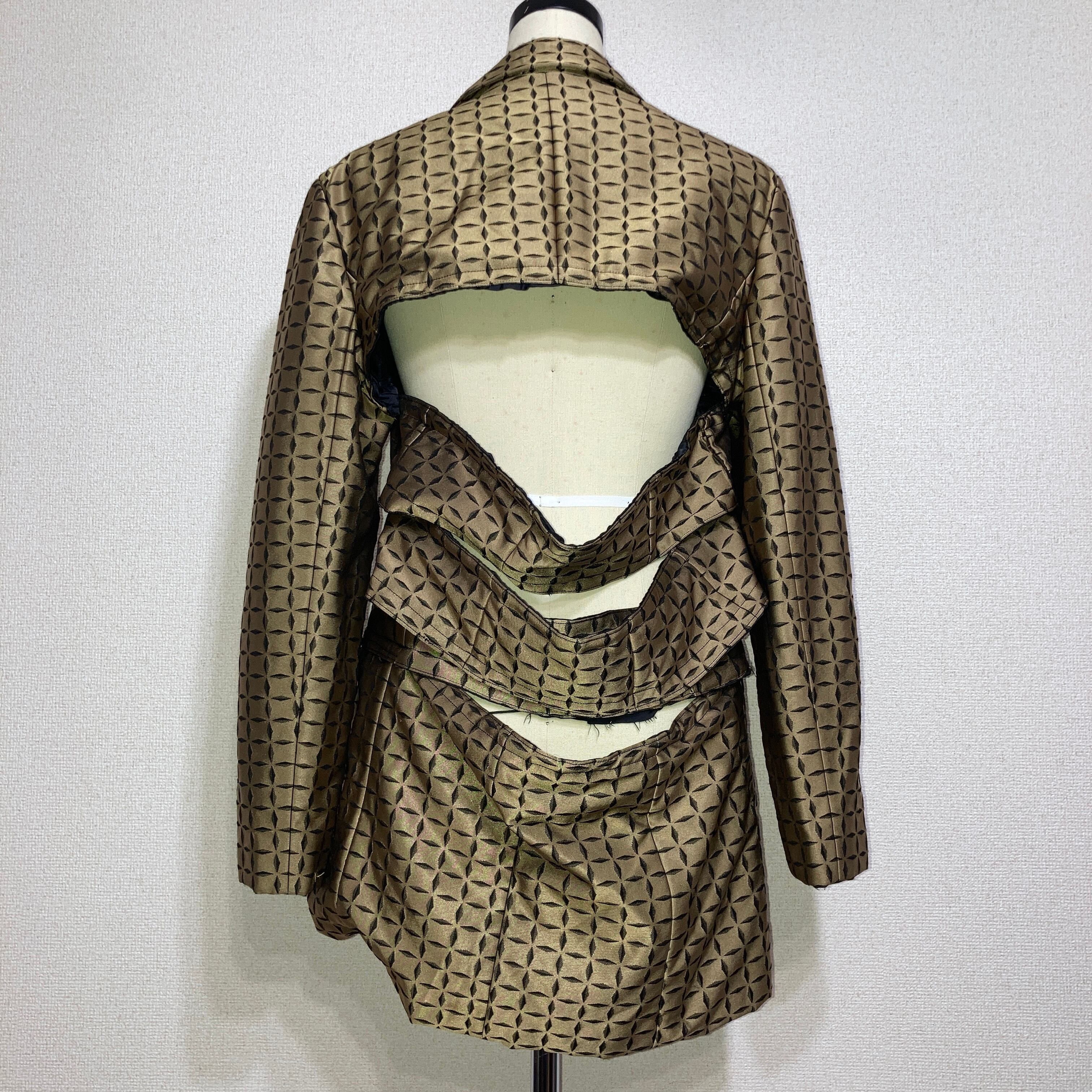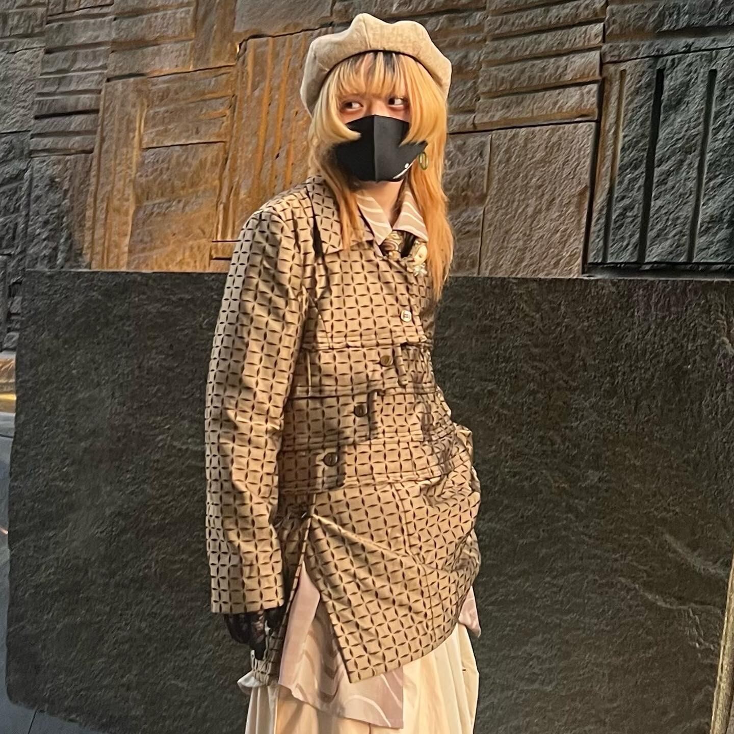 総柄のコートをボタンを軸にずらしてあり、立体感を追求したコート。