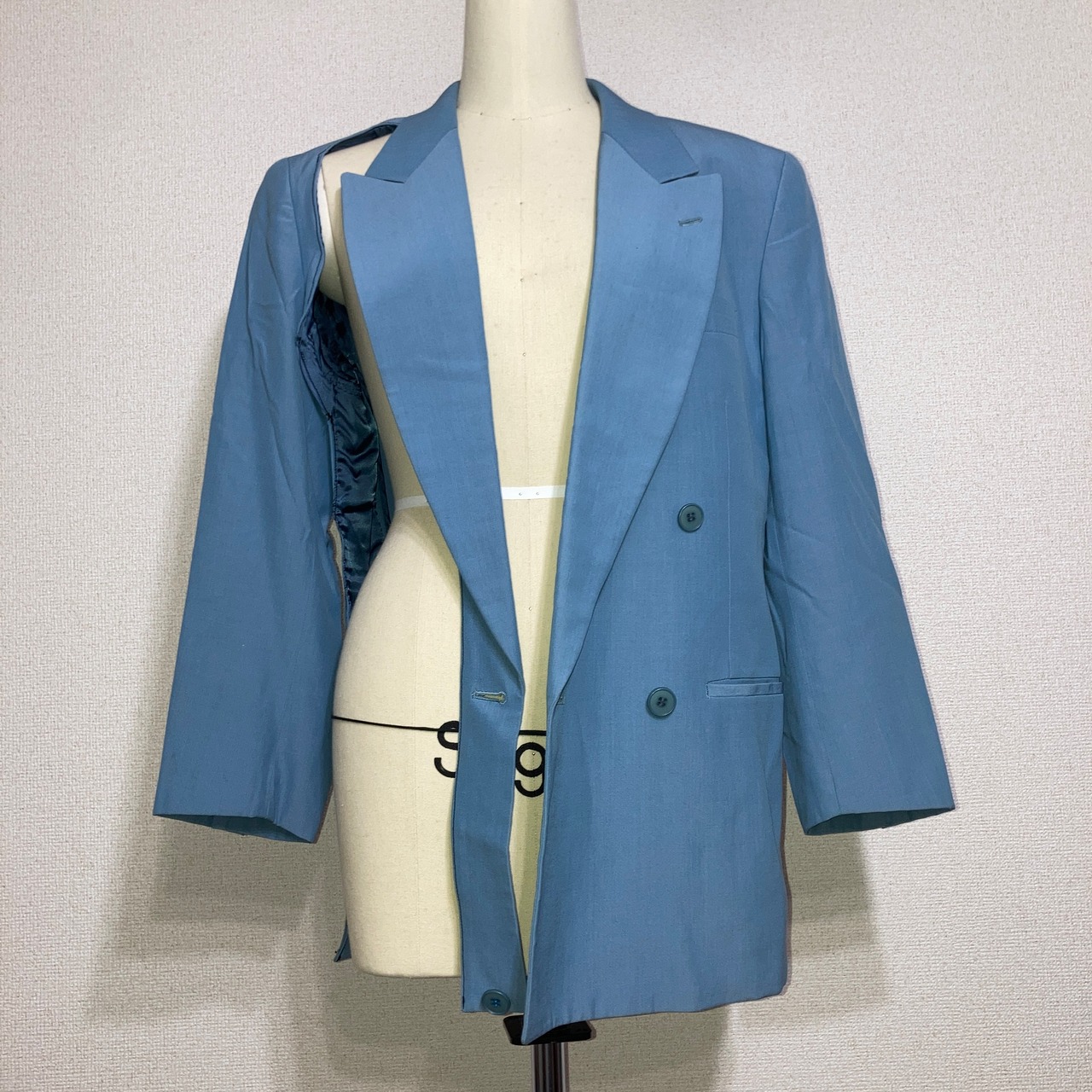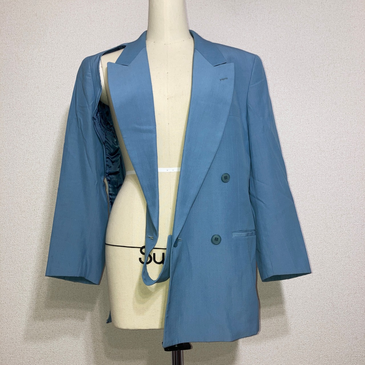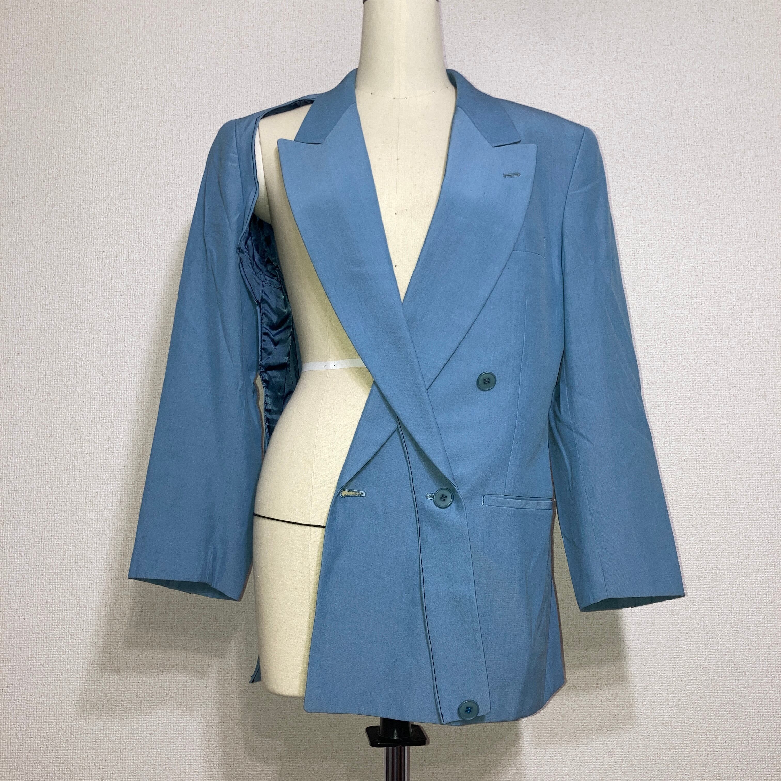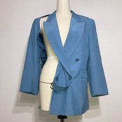 ダブルジャケットの右腹部をラペルを残して裁断してあり、下に着ているものとのレイヤードを楽しむことができるジャケット。