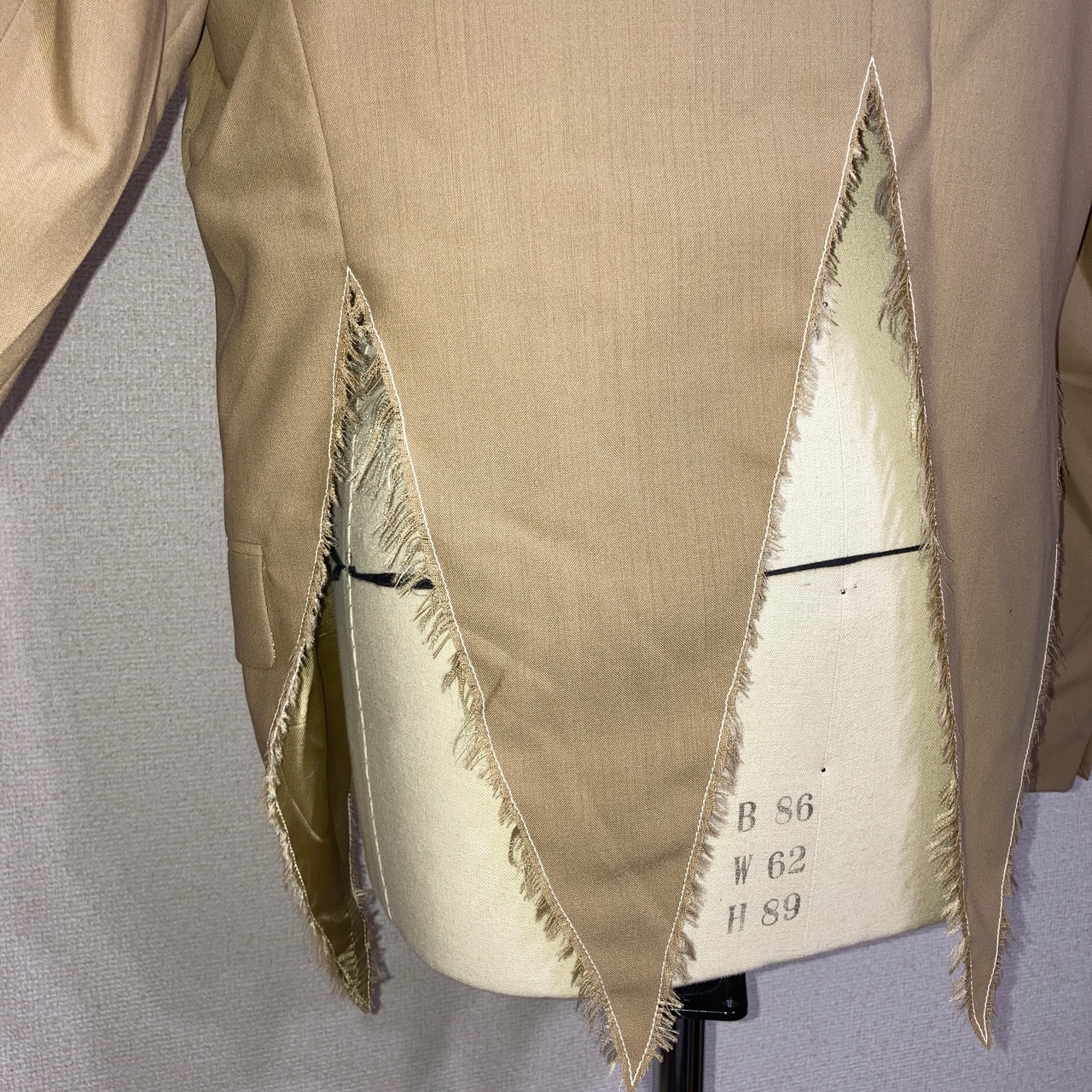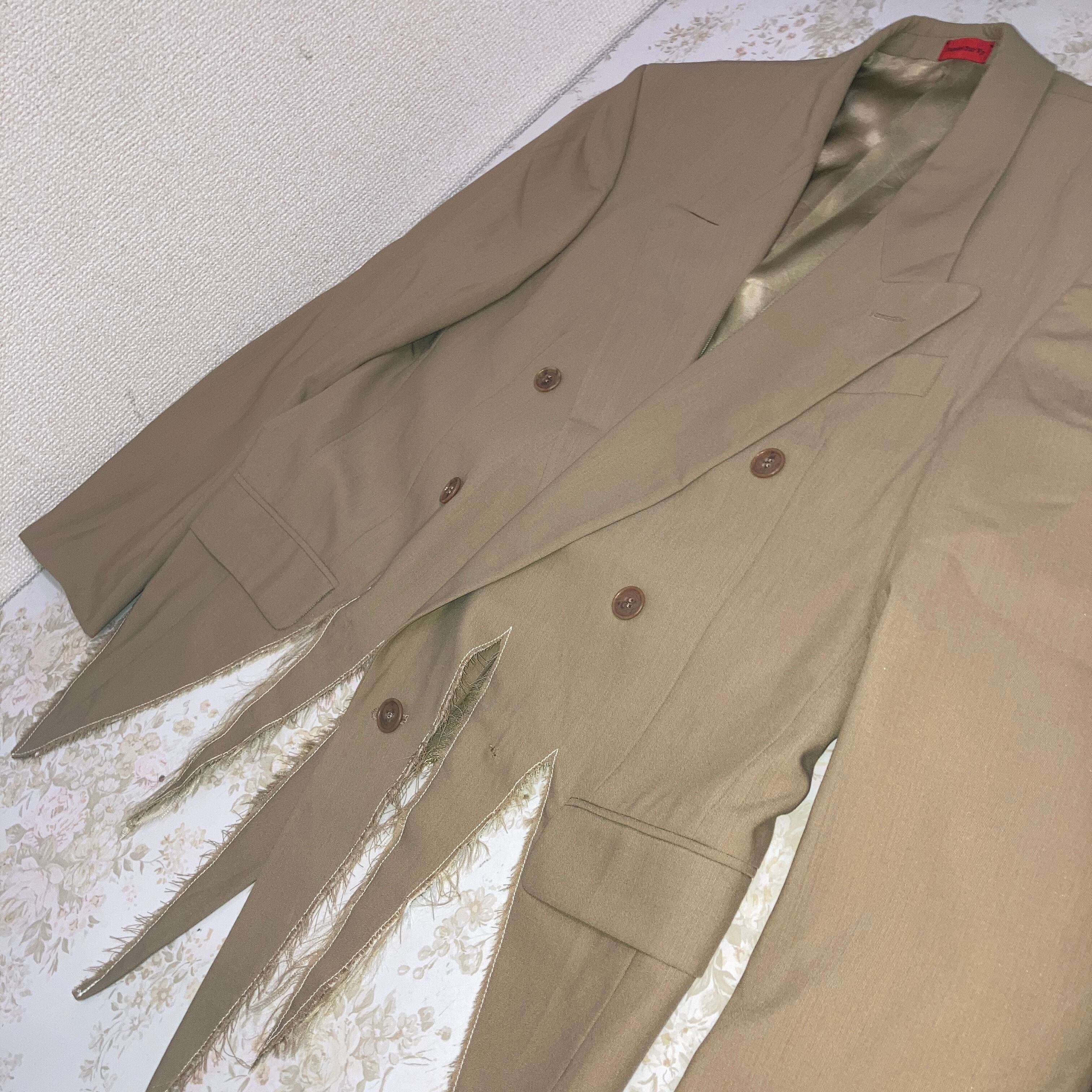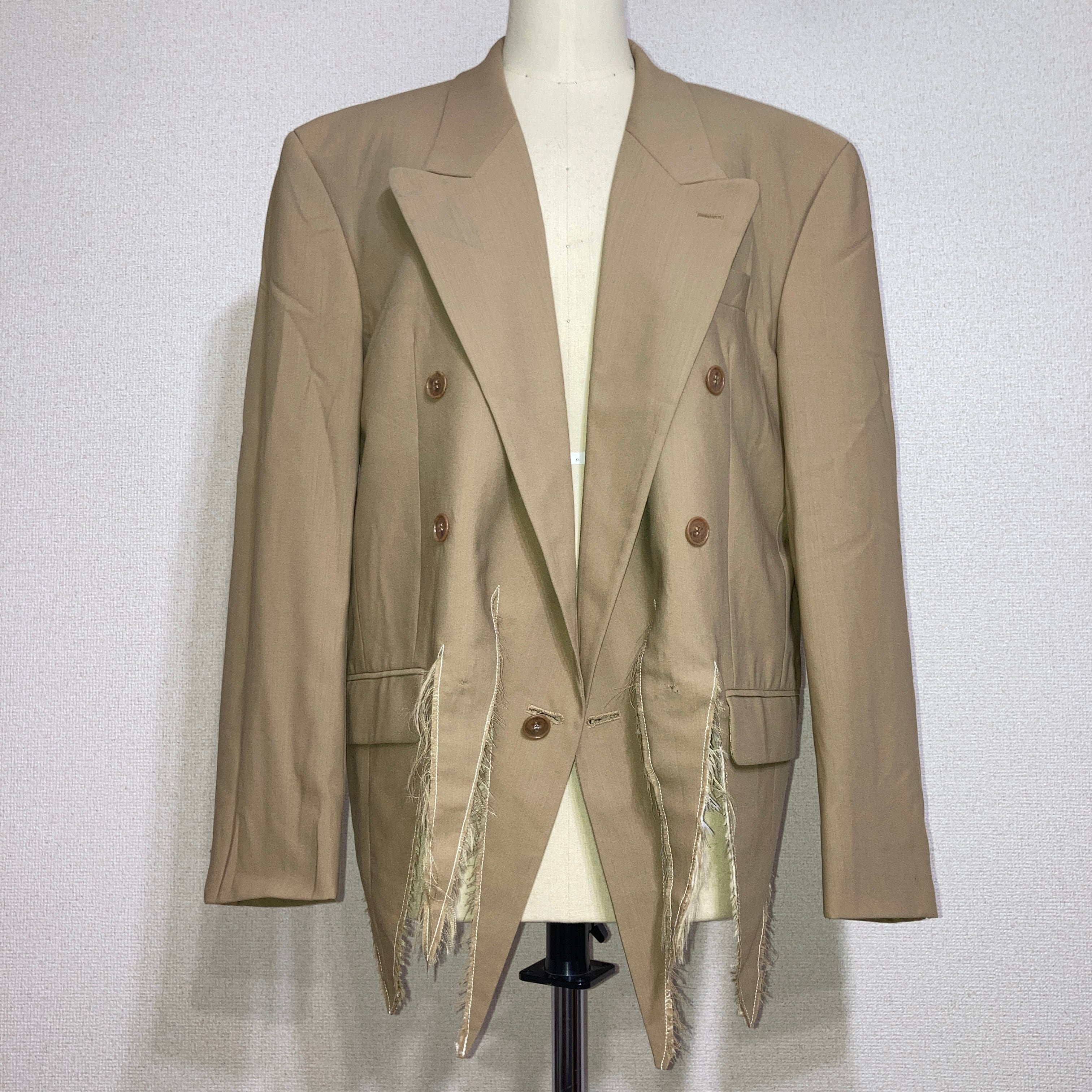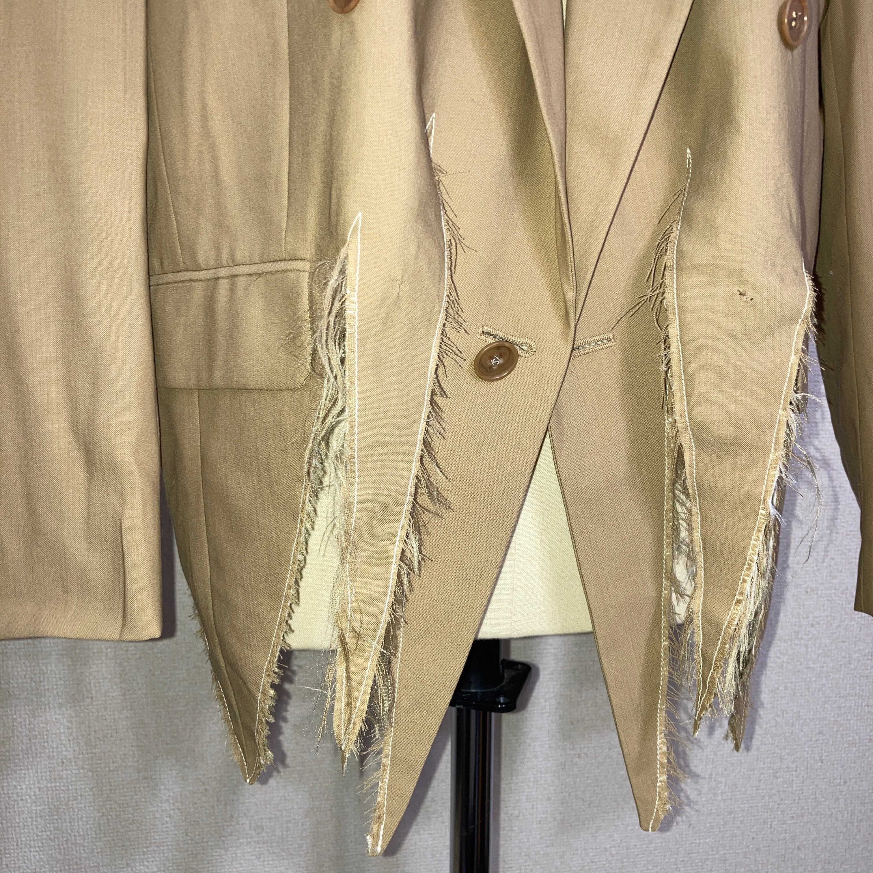 ダブルジャケットの裾の布目を裂き、グランジ風にリメイクしたジャケット。