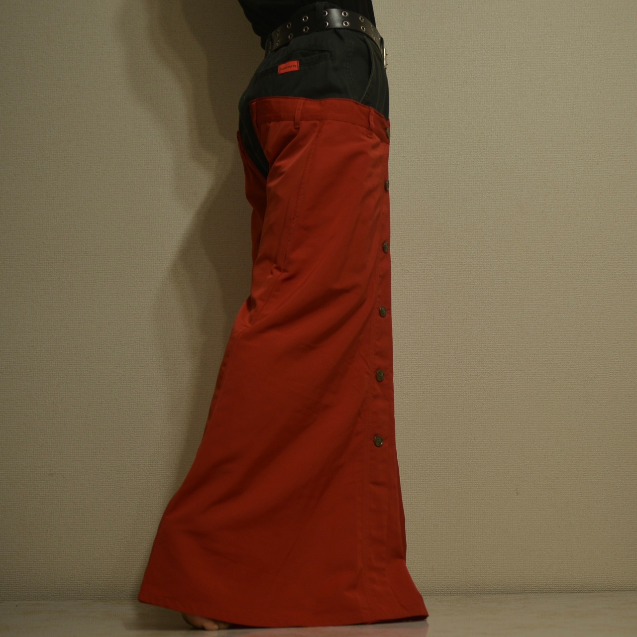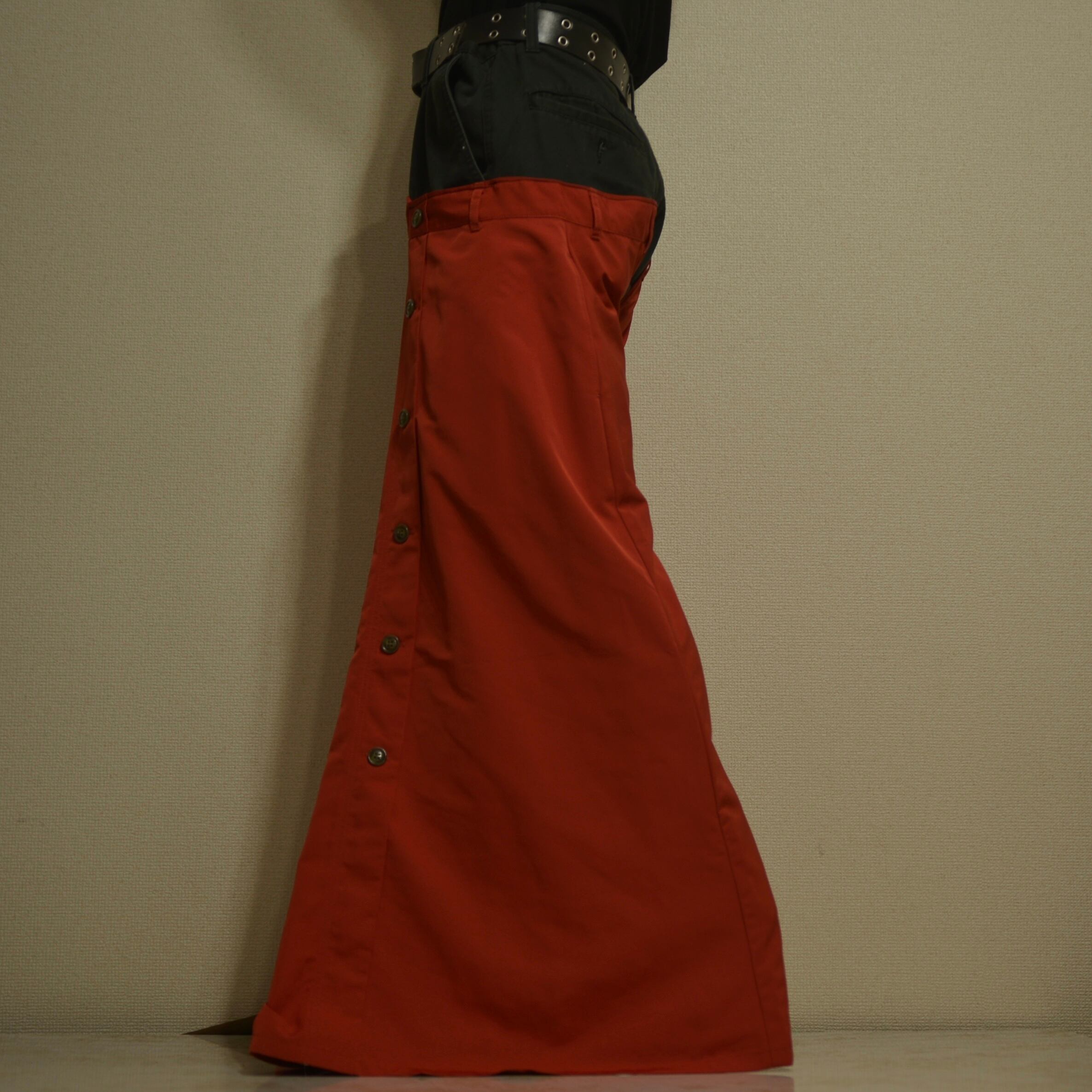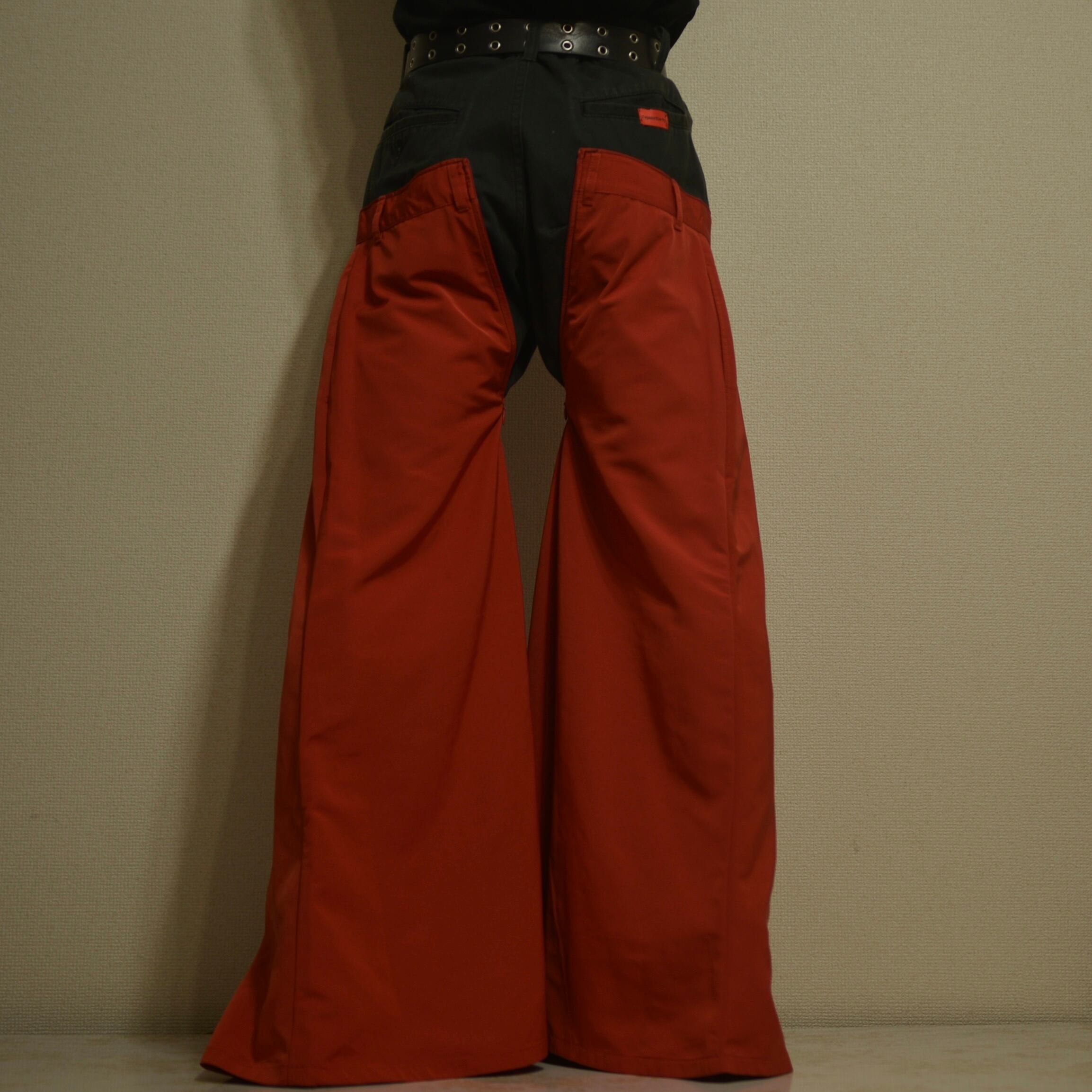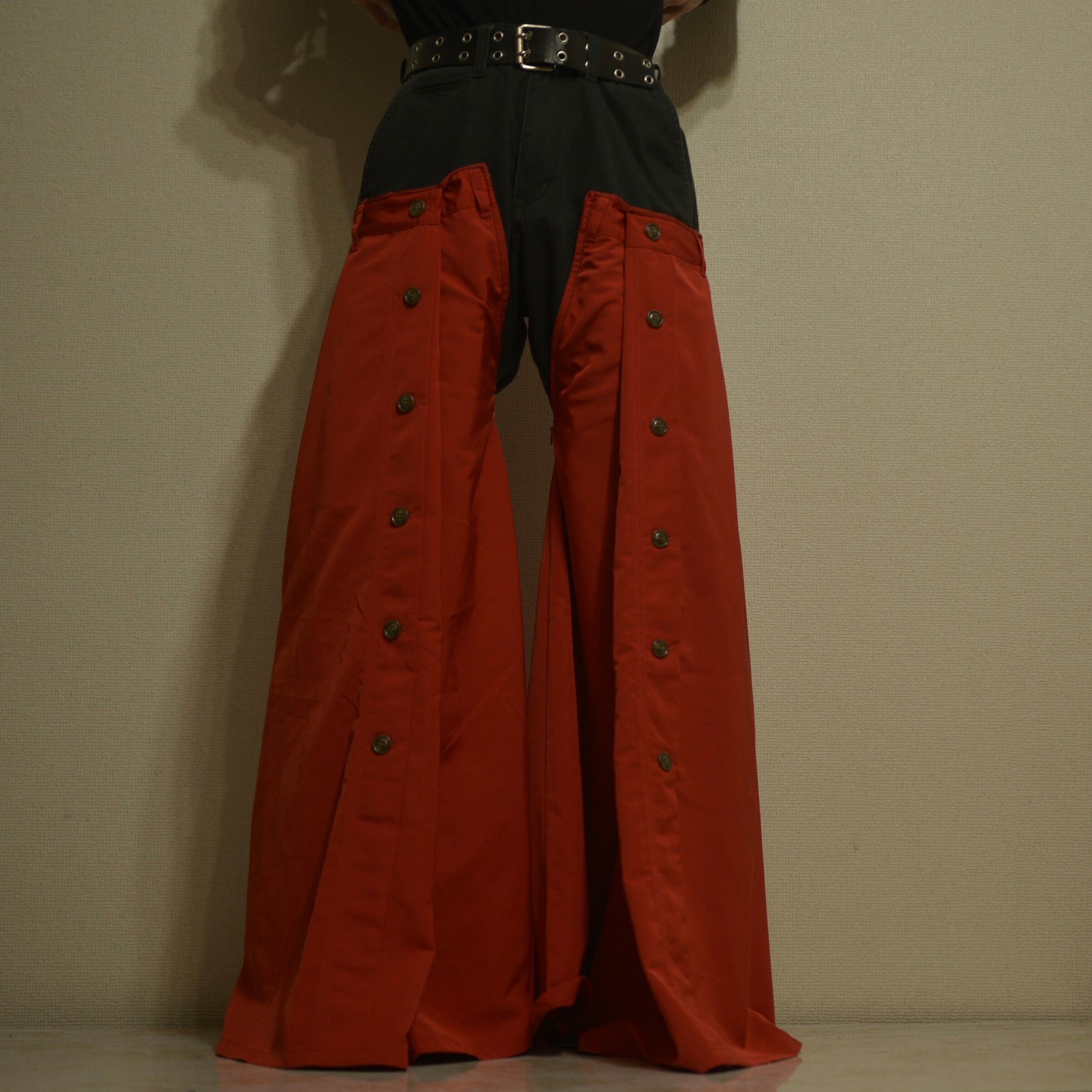 EDWINの黒デニムパンツに赤の光沢感のあるスカートを縫い付けたフレアパンツ。