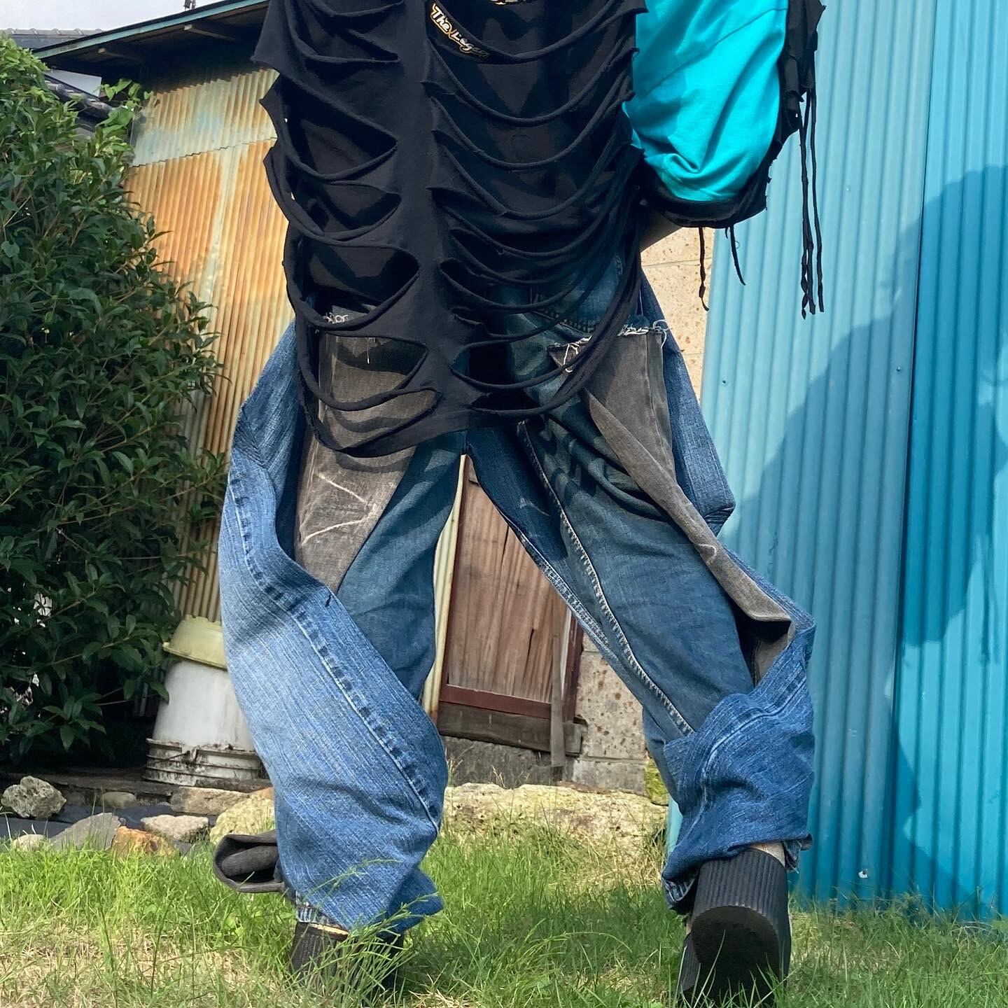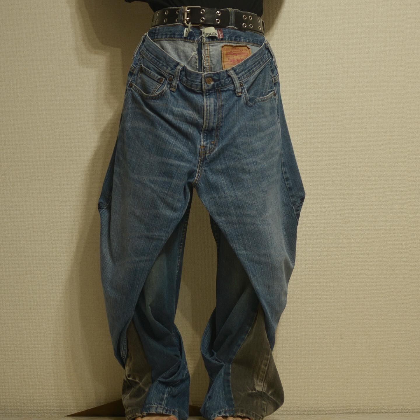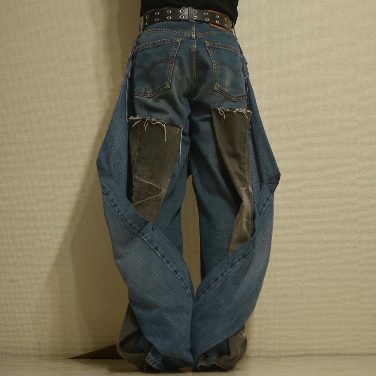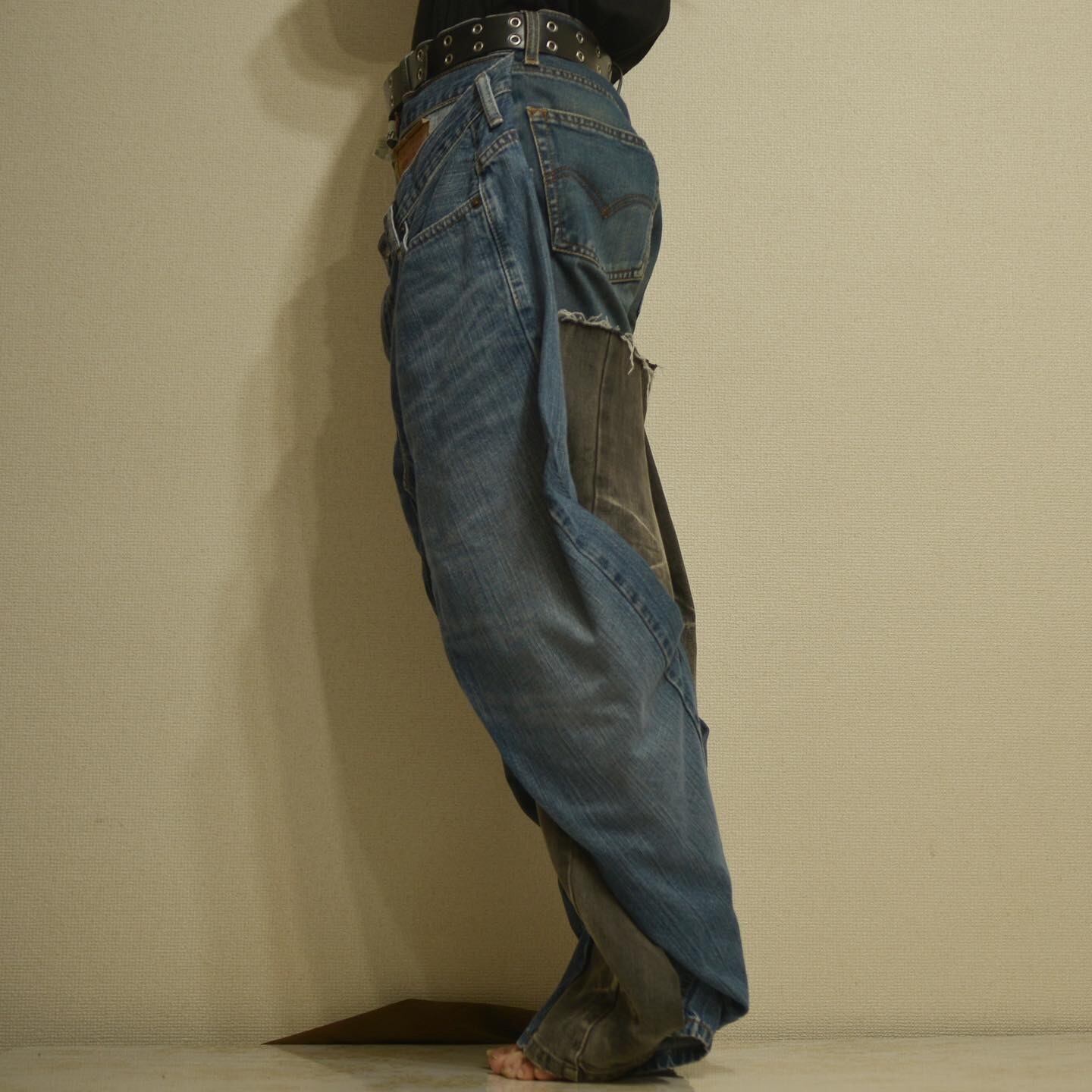 パンツ前面部にもう一枚パンツがねじりながら縫い付けられてあるリメイクデニムパンツ。膝部分までが外に広がり、また裾に近づくにつれて外に広がりを見せる前衛的なシルエットとなっている。