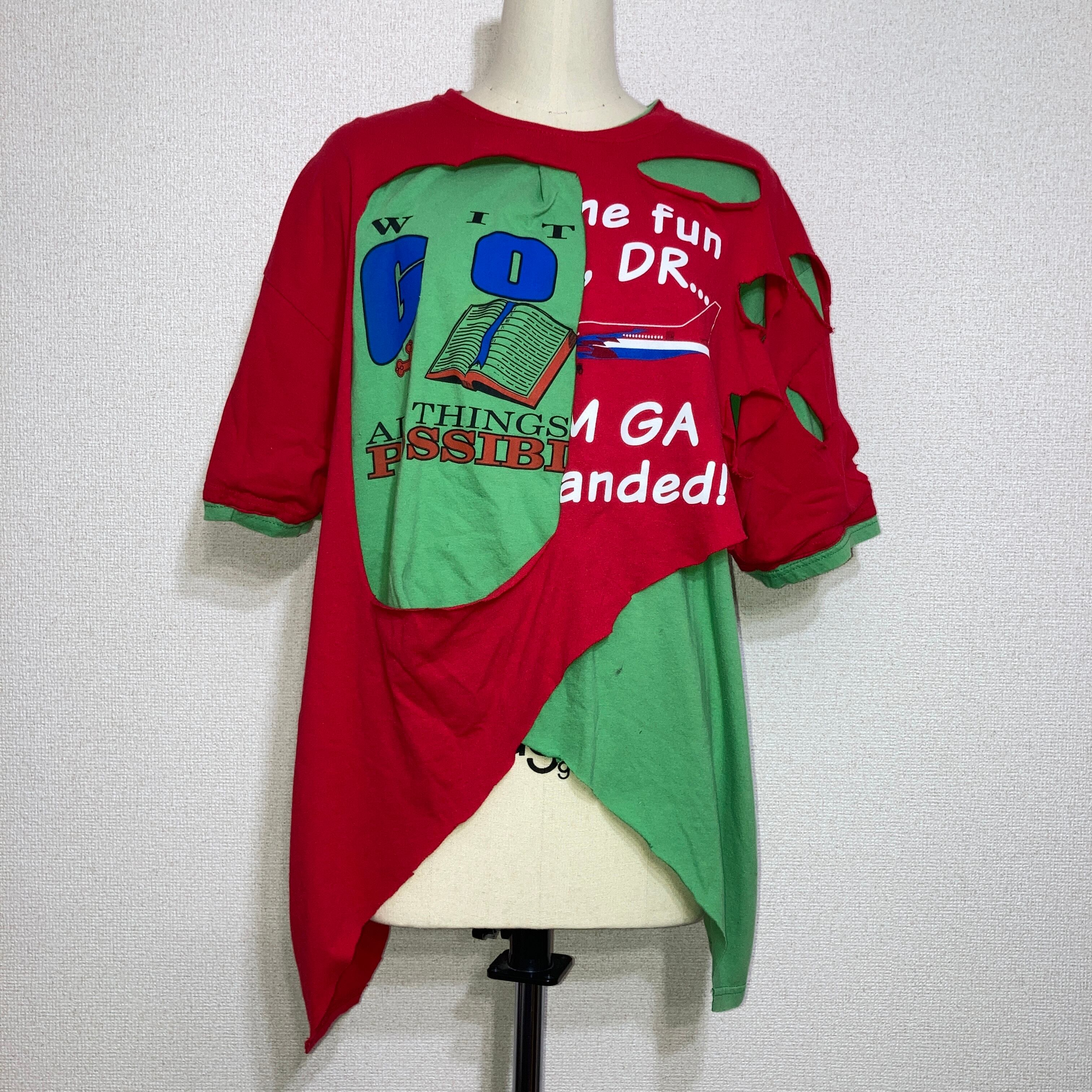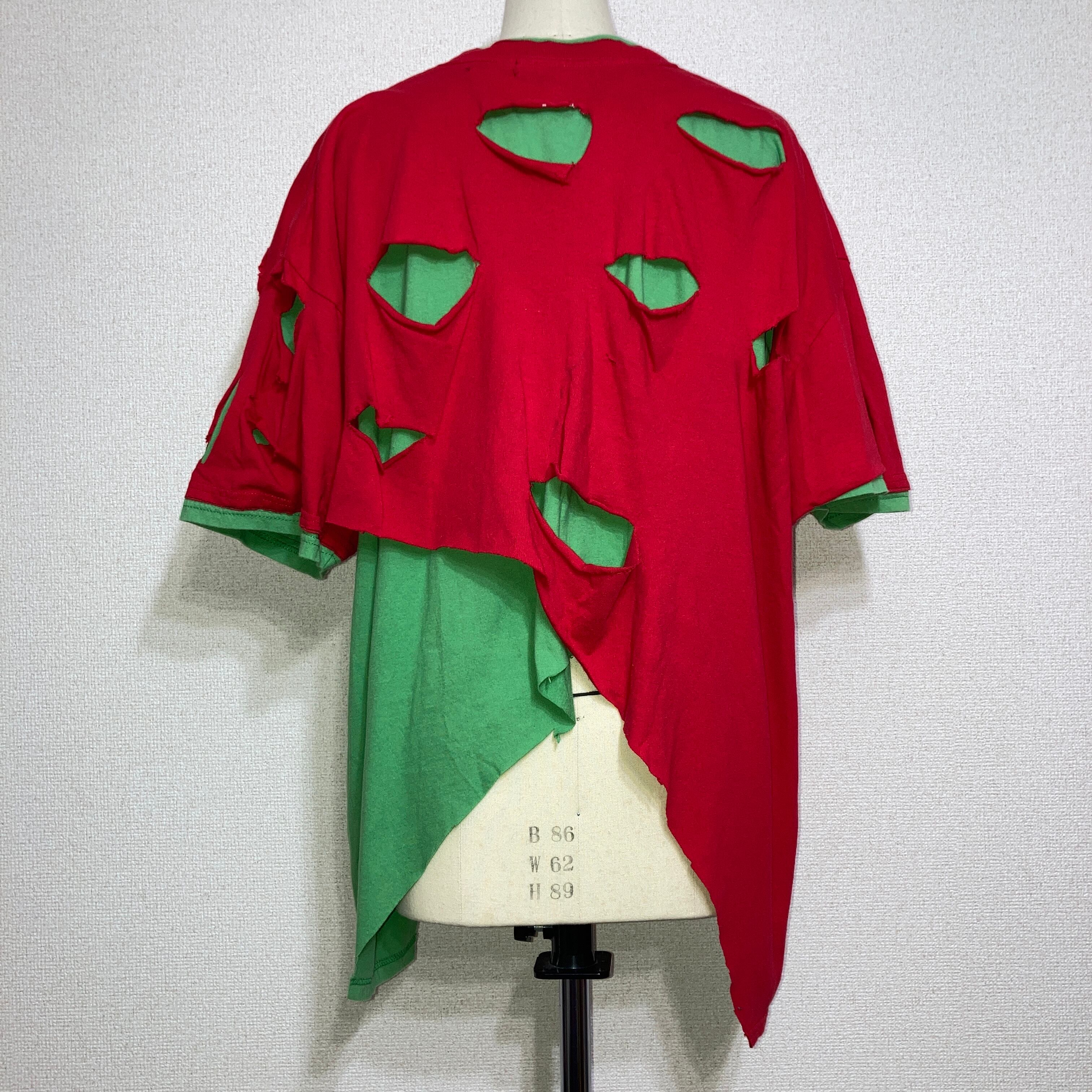 左右で丈の長さが違うTシャツが重ねて縫われており、所々にクラッシュが入っている。
