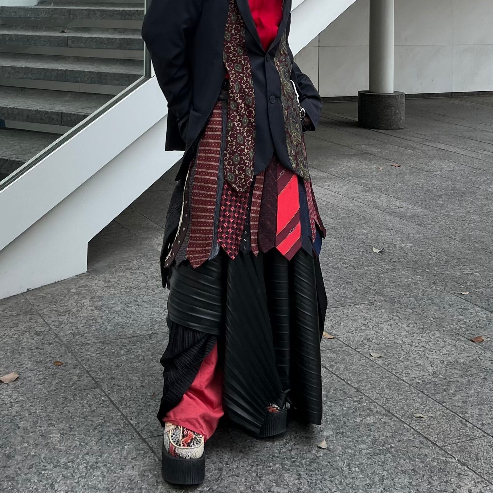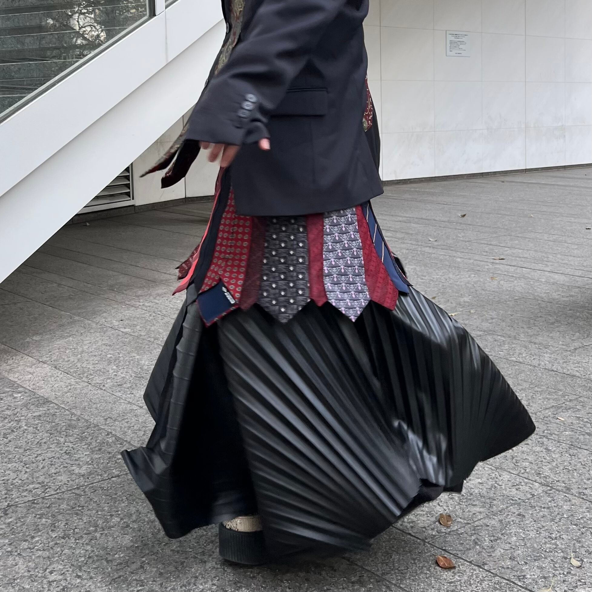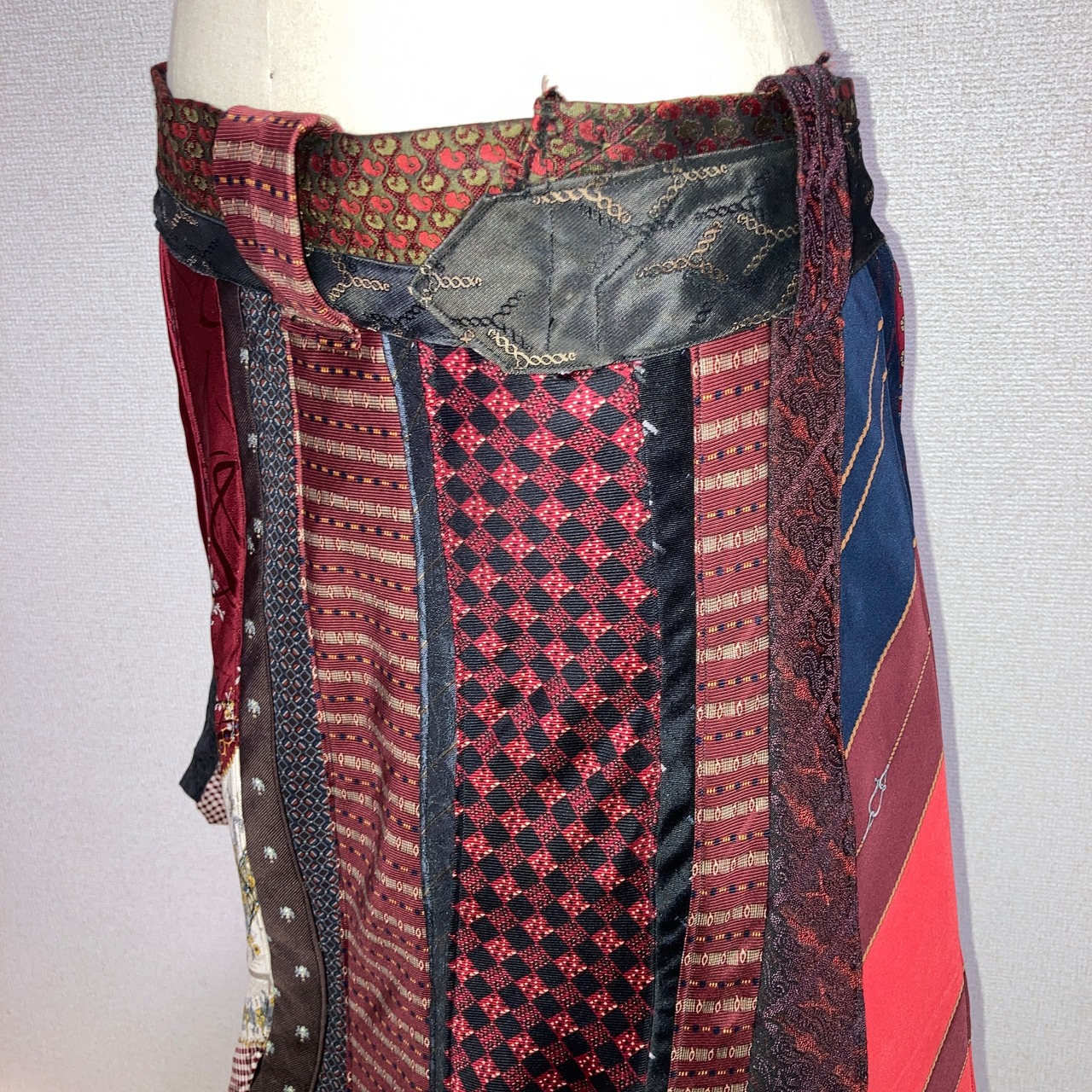 ネクタイを20本使用し、大剣の広がりを活かしフレアスカートを表現したリメイクスカート。