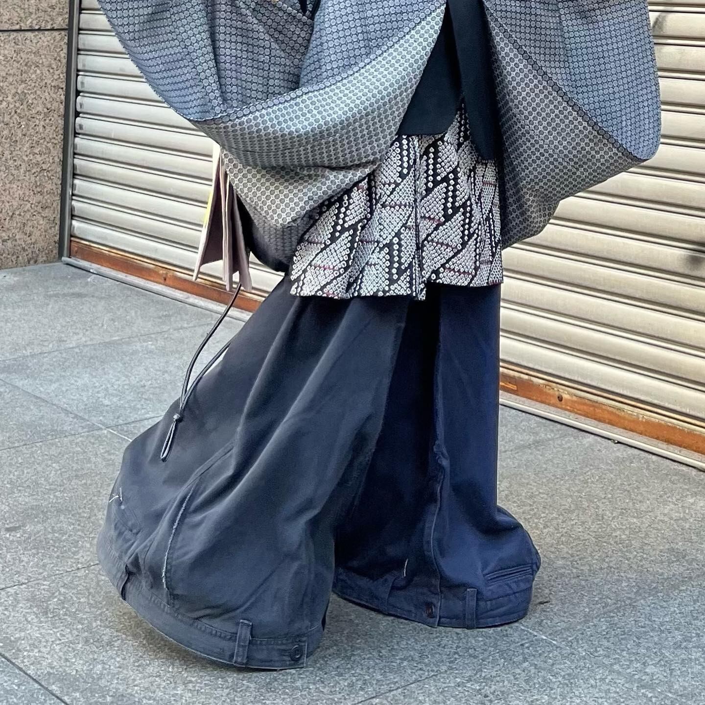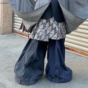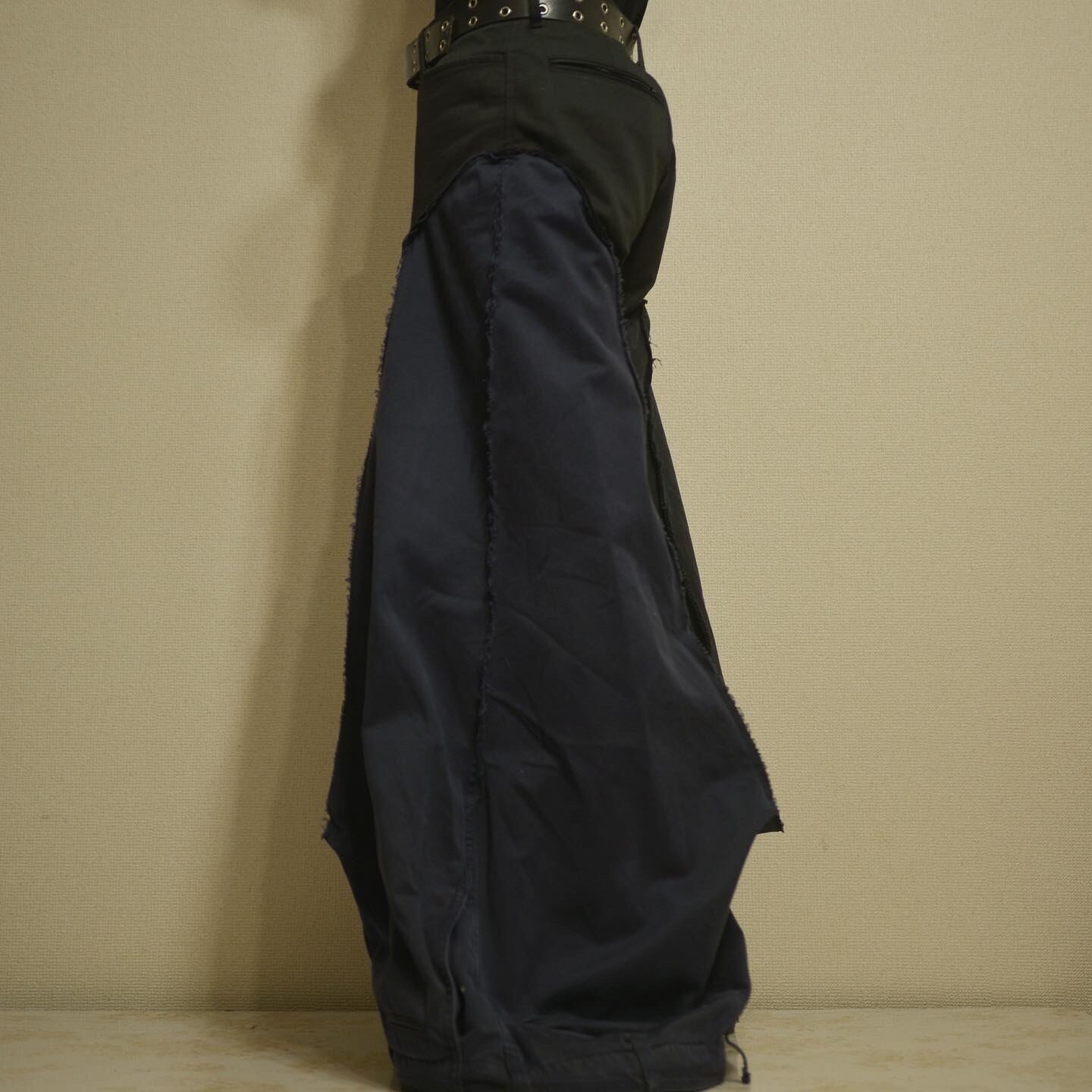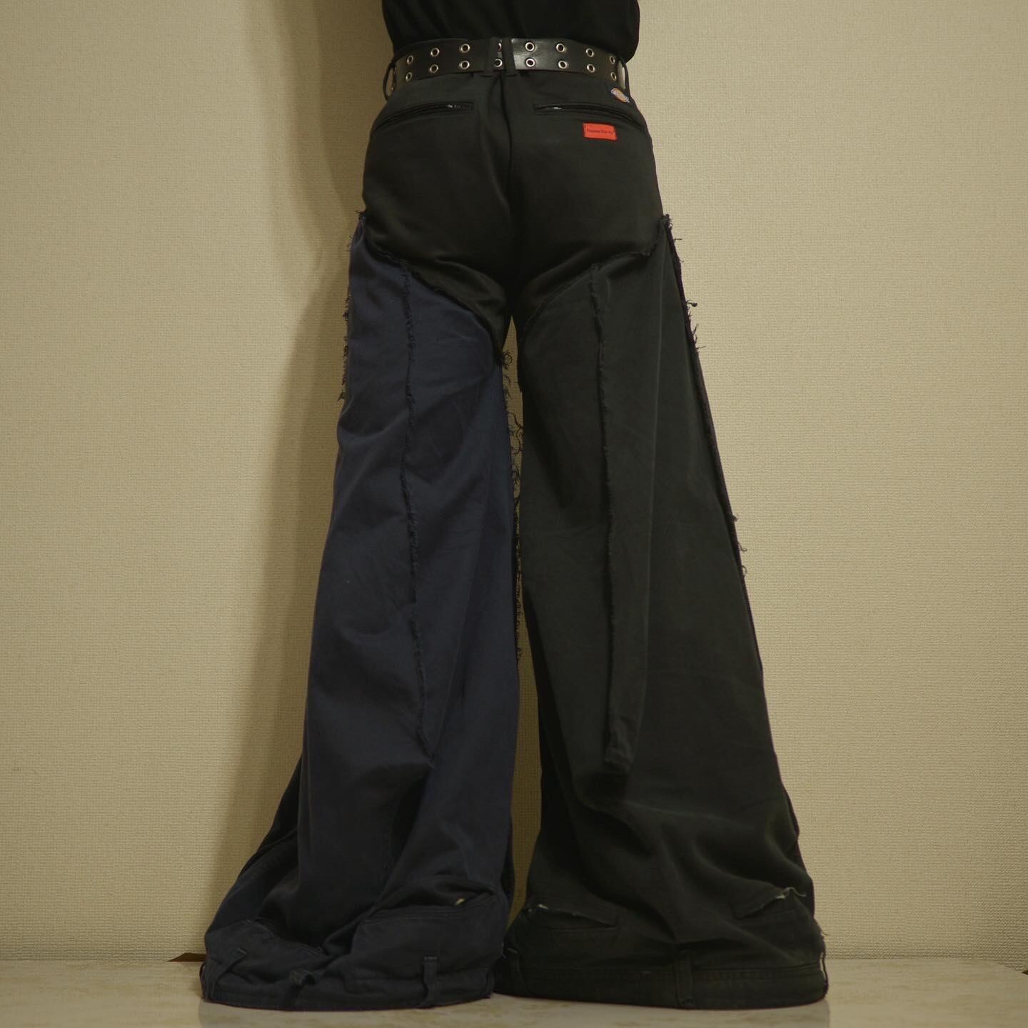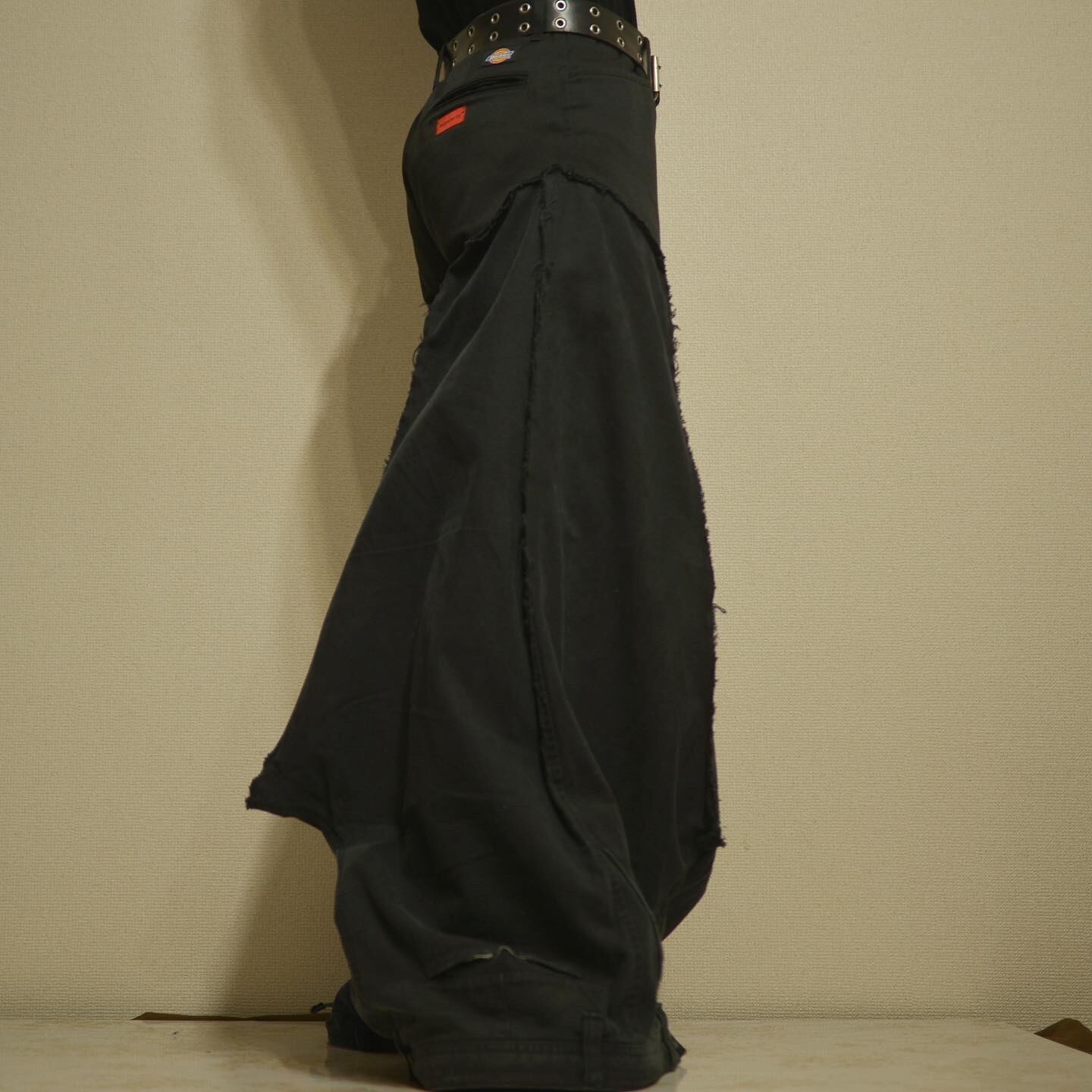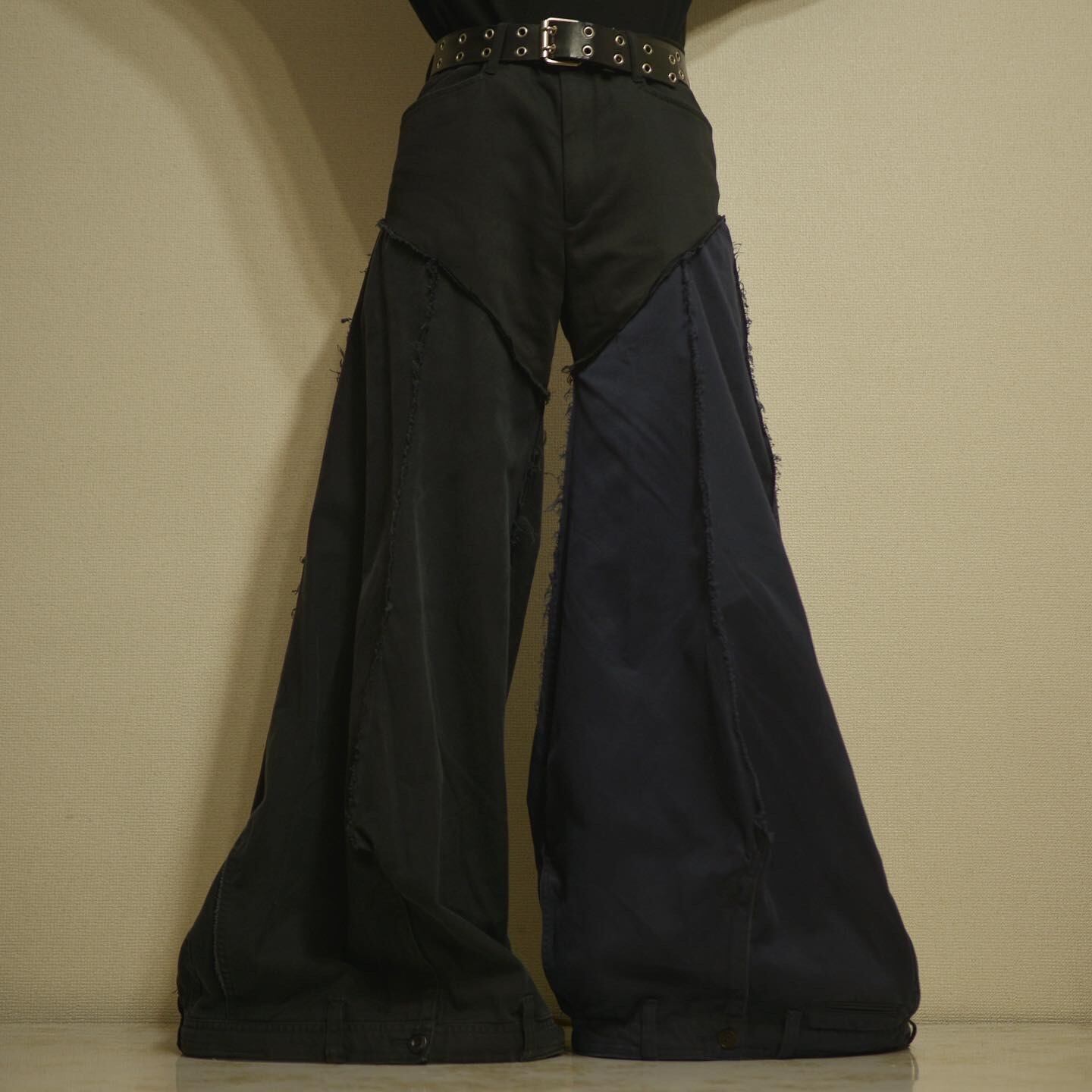 ワイドパンツのウエスト部分がそのまま裾になっているため、裾周りが100近くあるリメイクデニムパンツ。