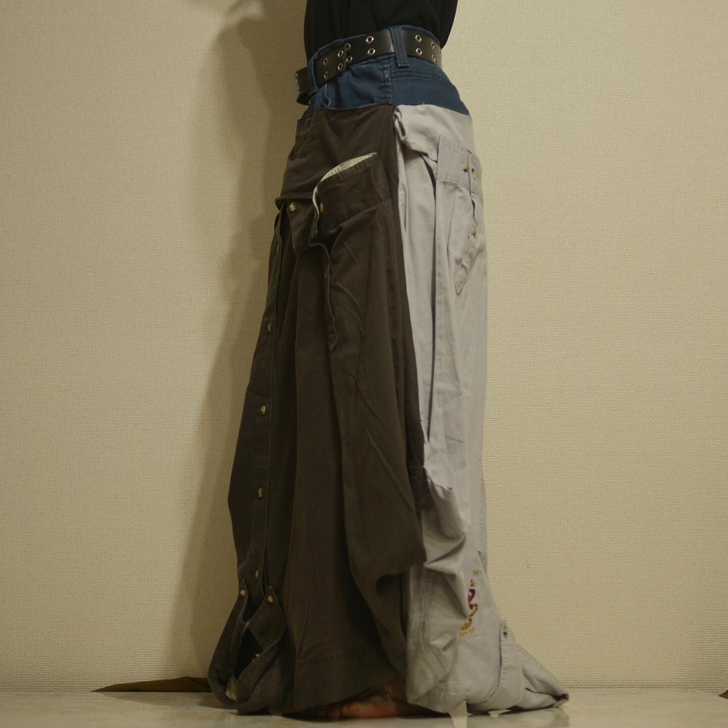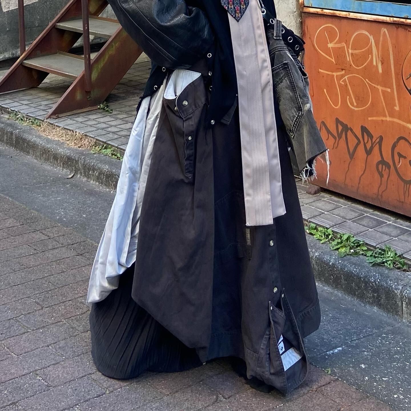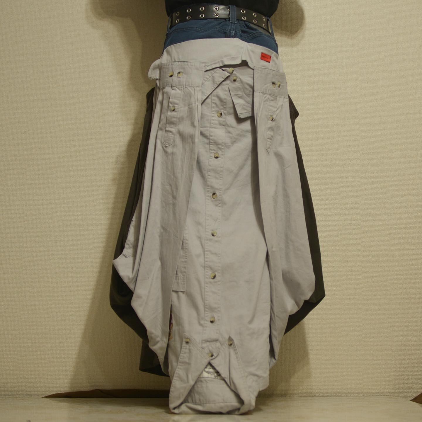 前後は長くなっているが、横は短いので下にパンツなどを履いてレイヤードも楽しむことができる。シャツのボタンを開けてドレープを効かせたりすることも可能。