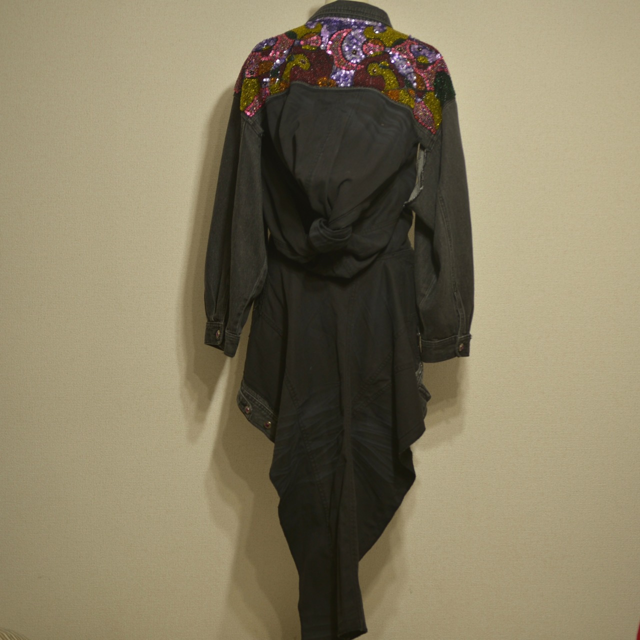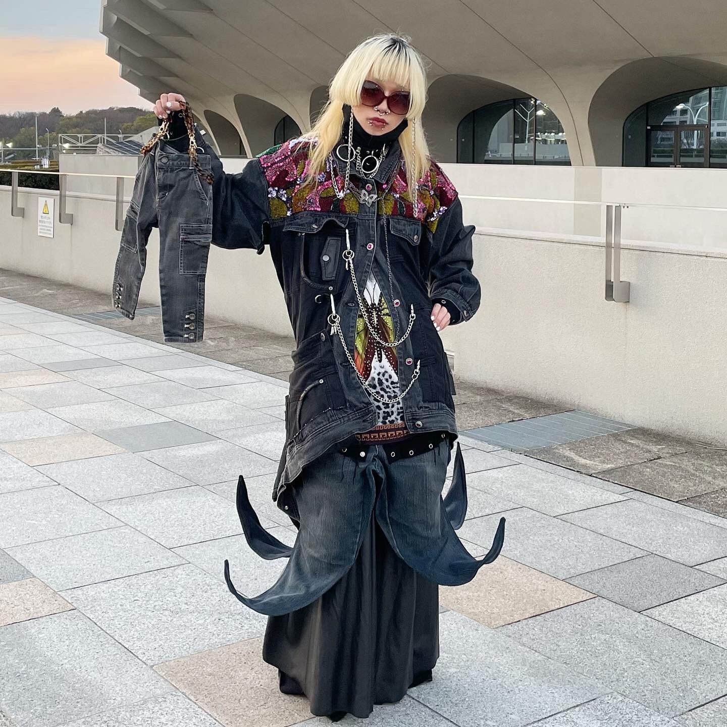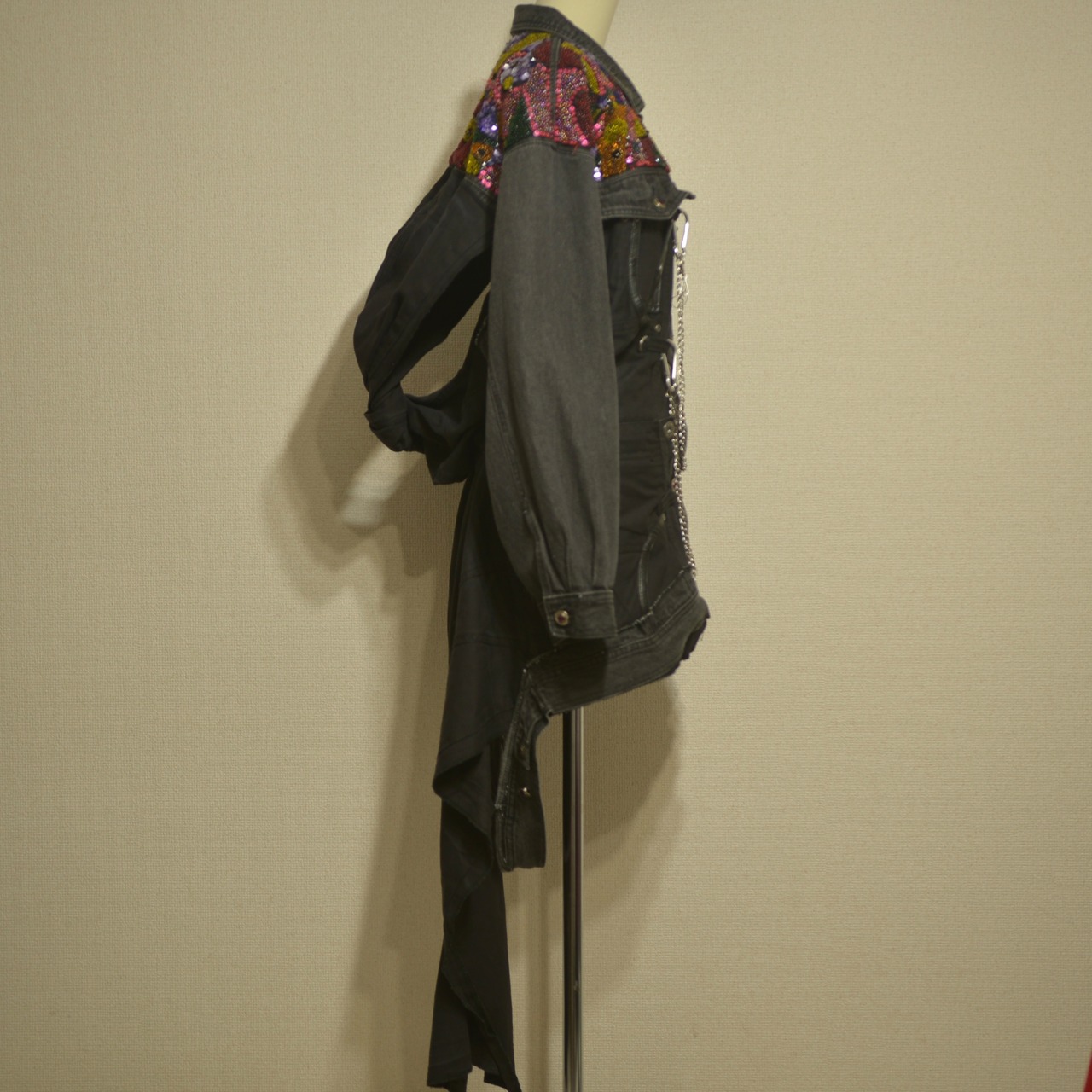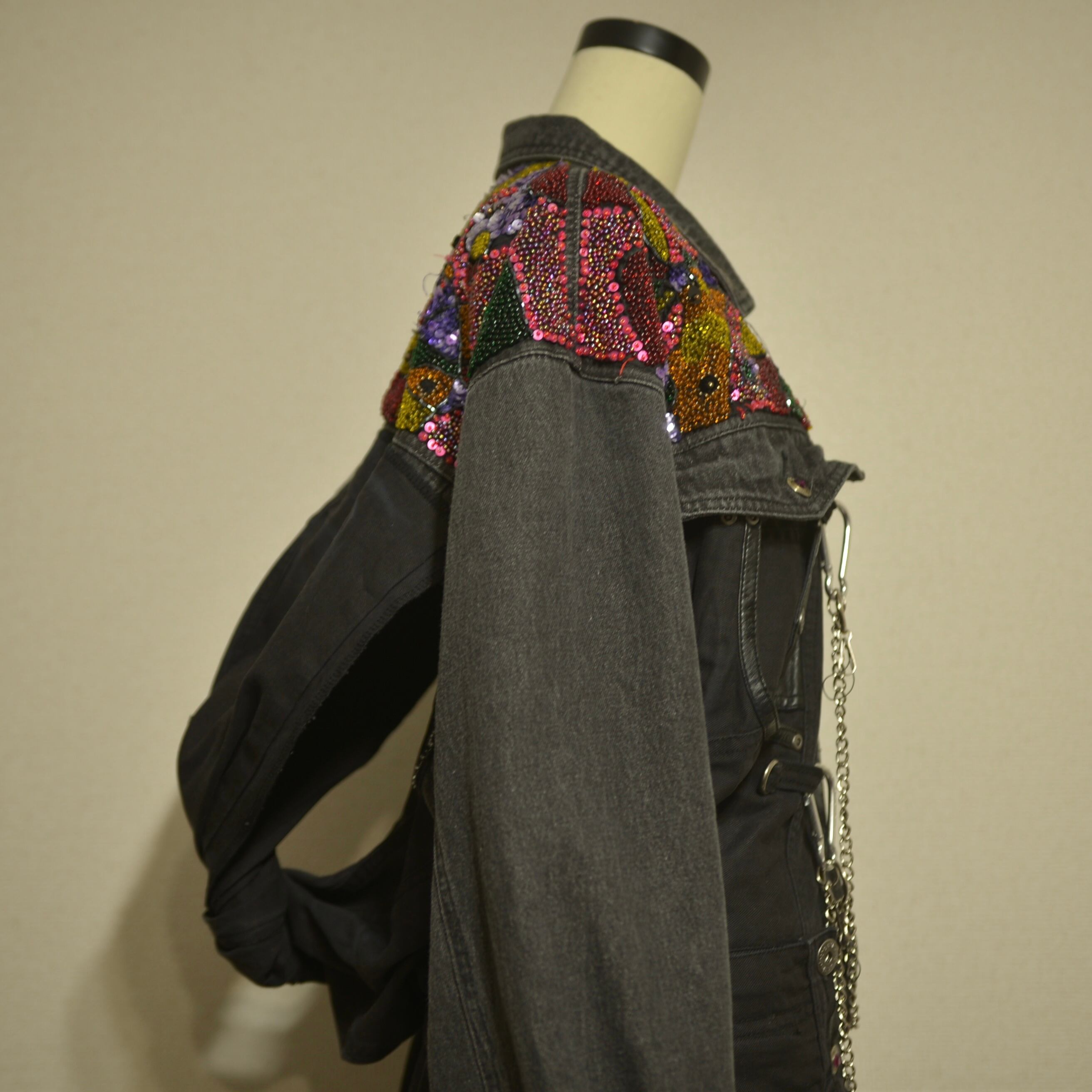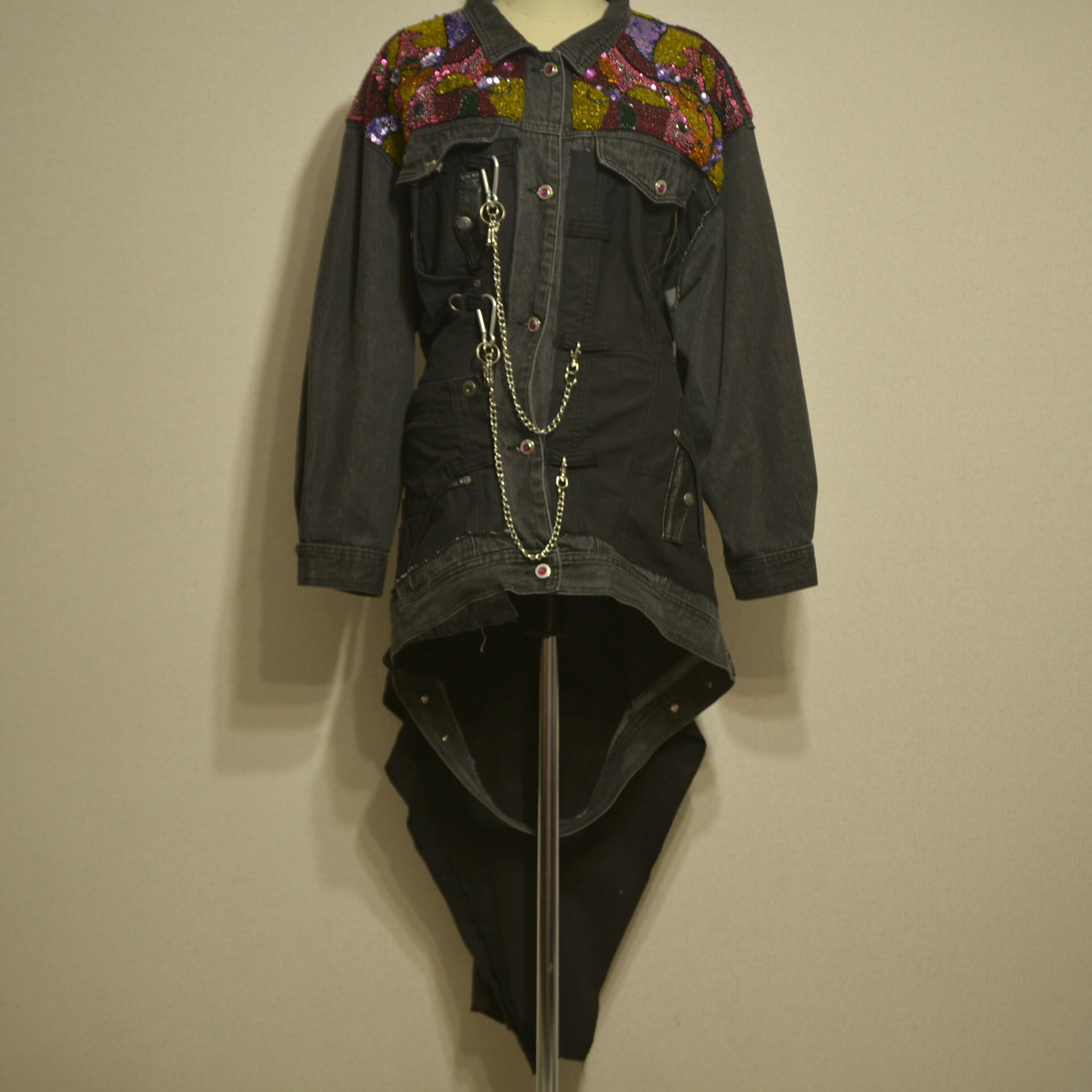 肩部分に宝石のようなものが散りばめられ、肩から下はパンツが縫い付けられたリメイクジャケット。