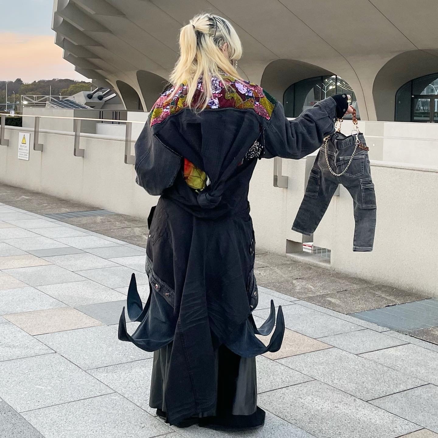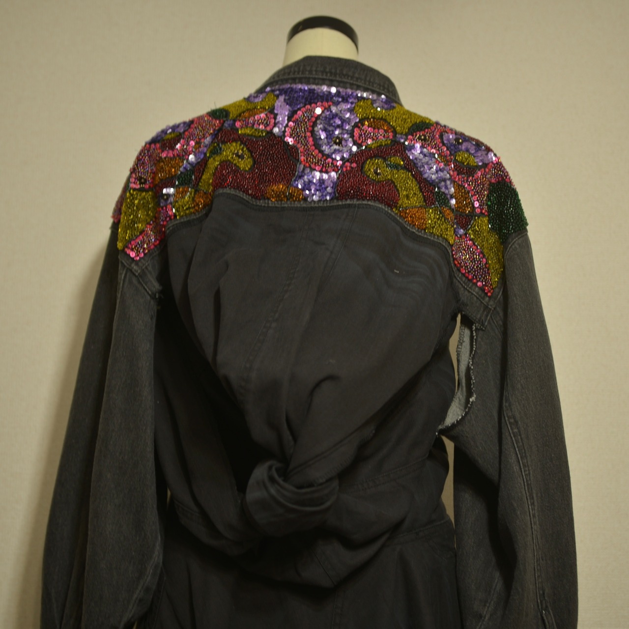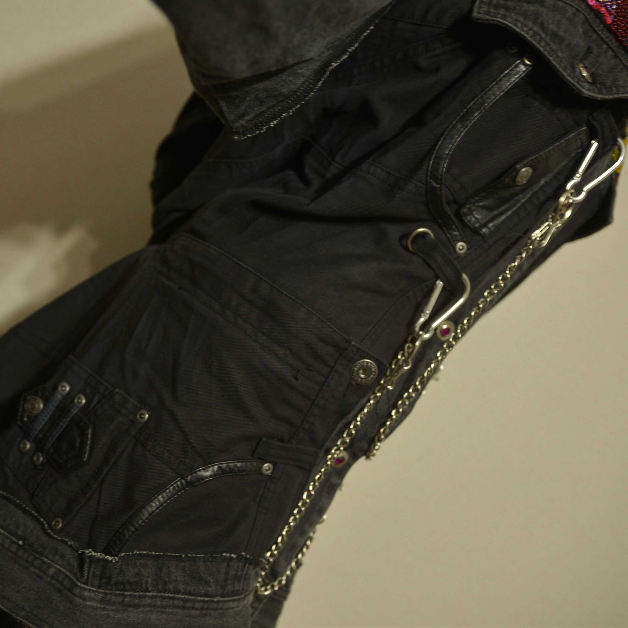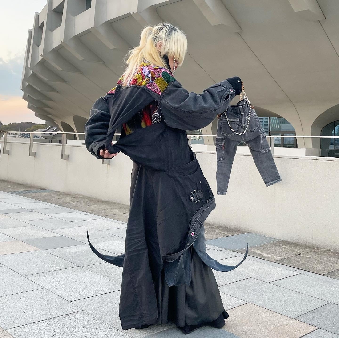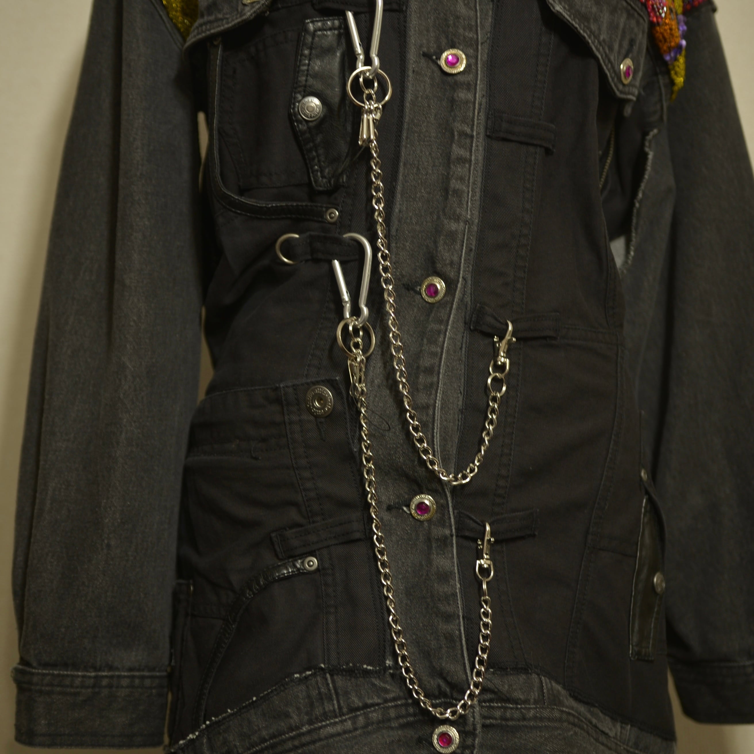 肩部分に宝石のようなものが散りばめられ、肩から下はパンツが縫い付けられたリメイクジャケット。