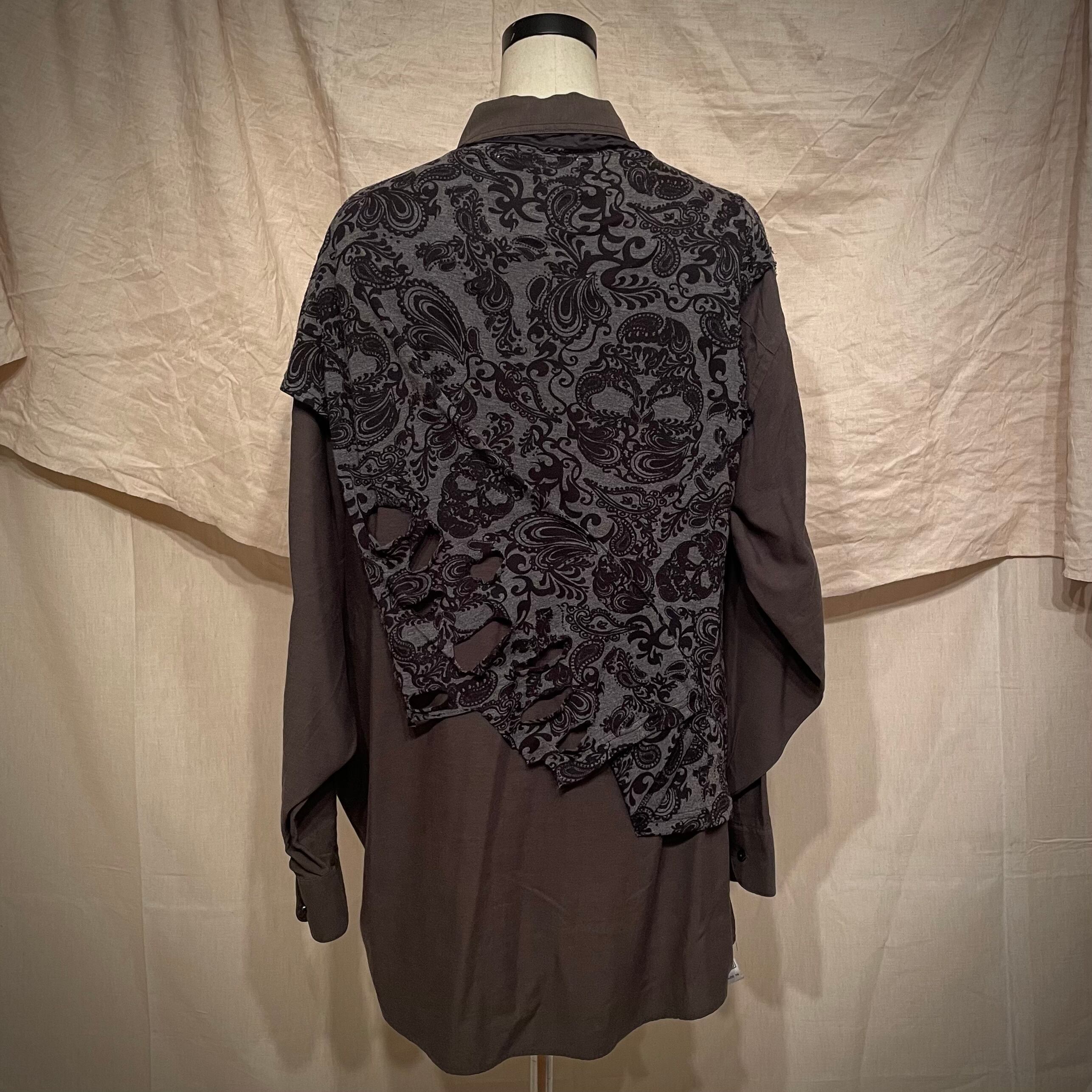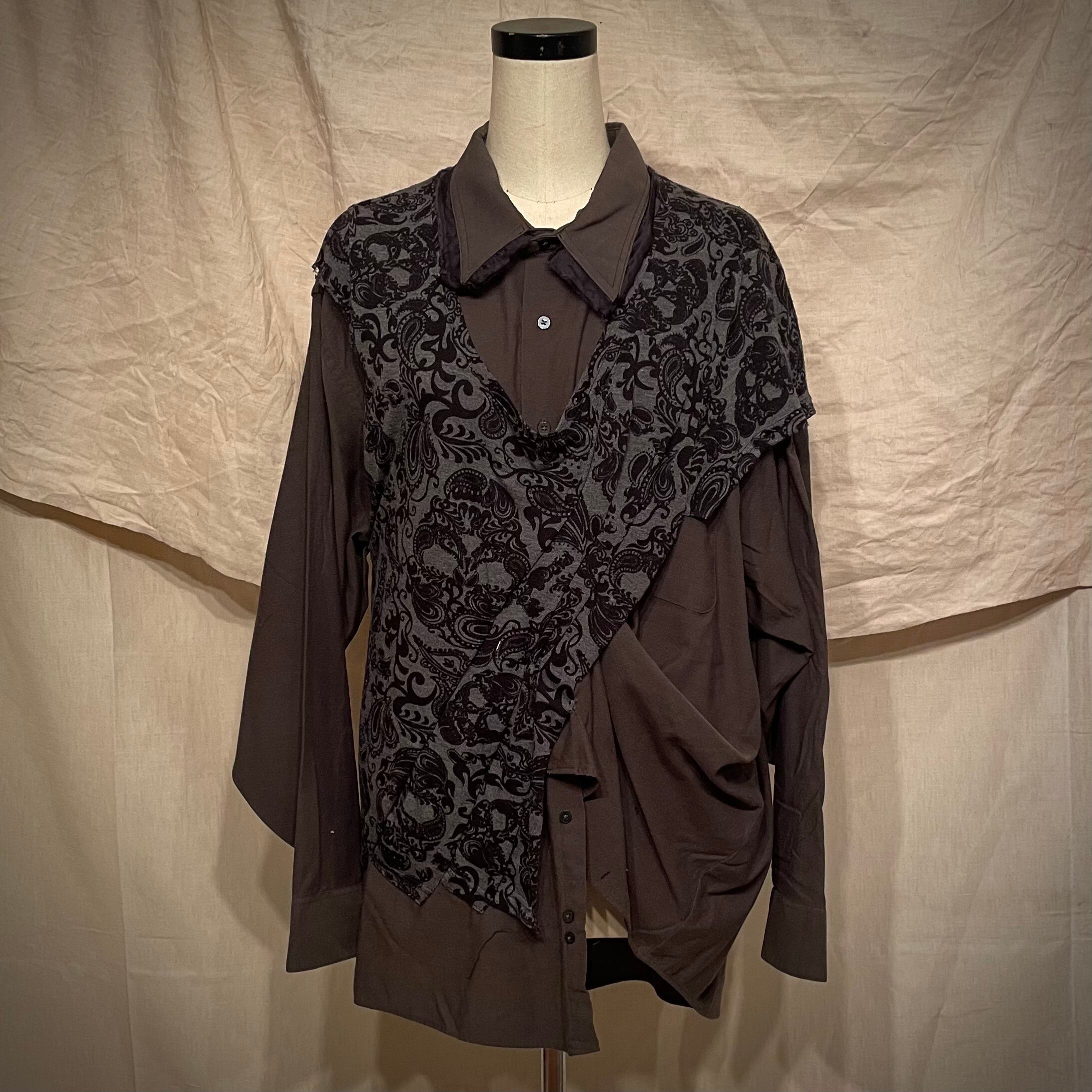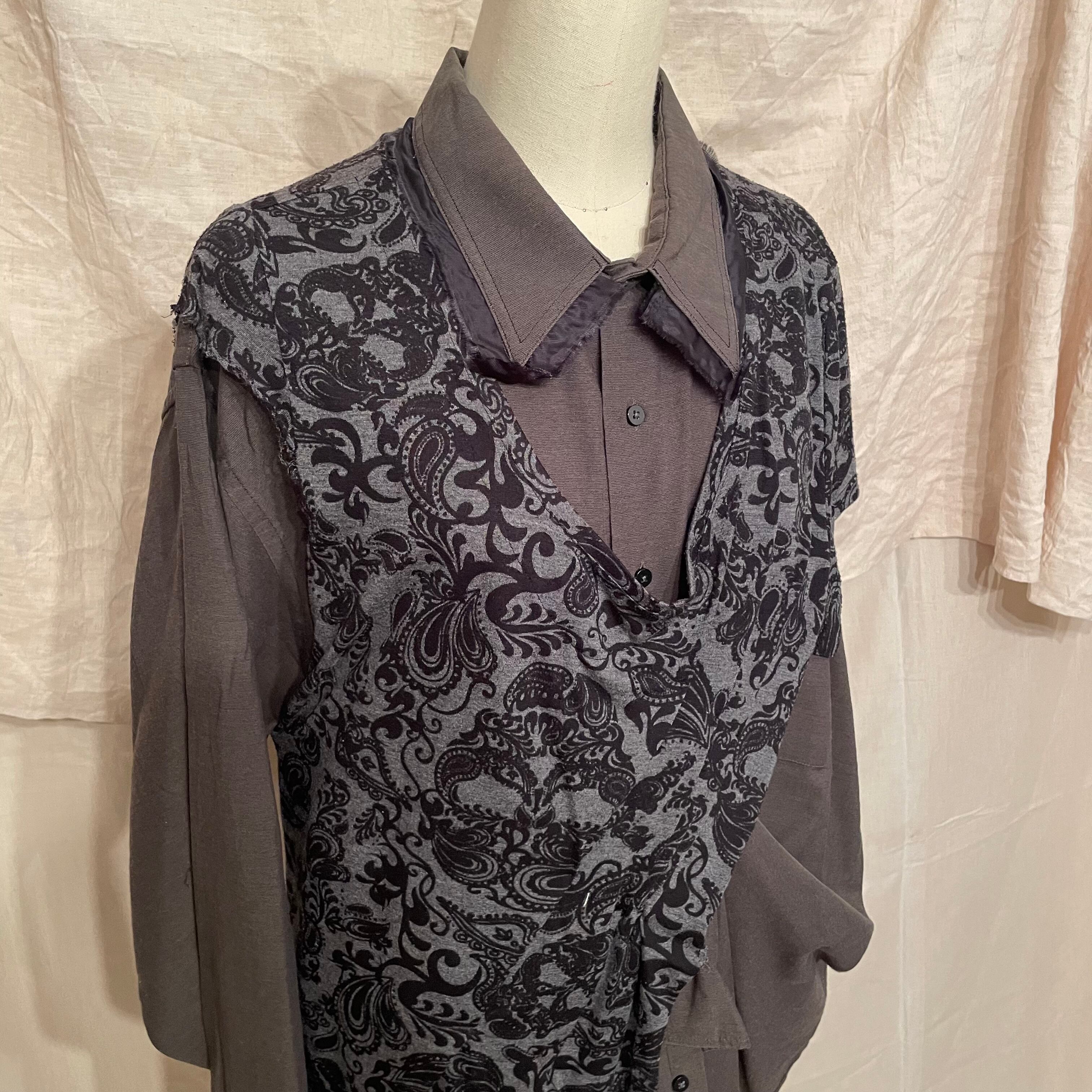 A remake shirt sewn together while making tucks from a patterned shirt with a Y2K feel.