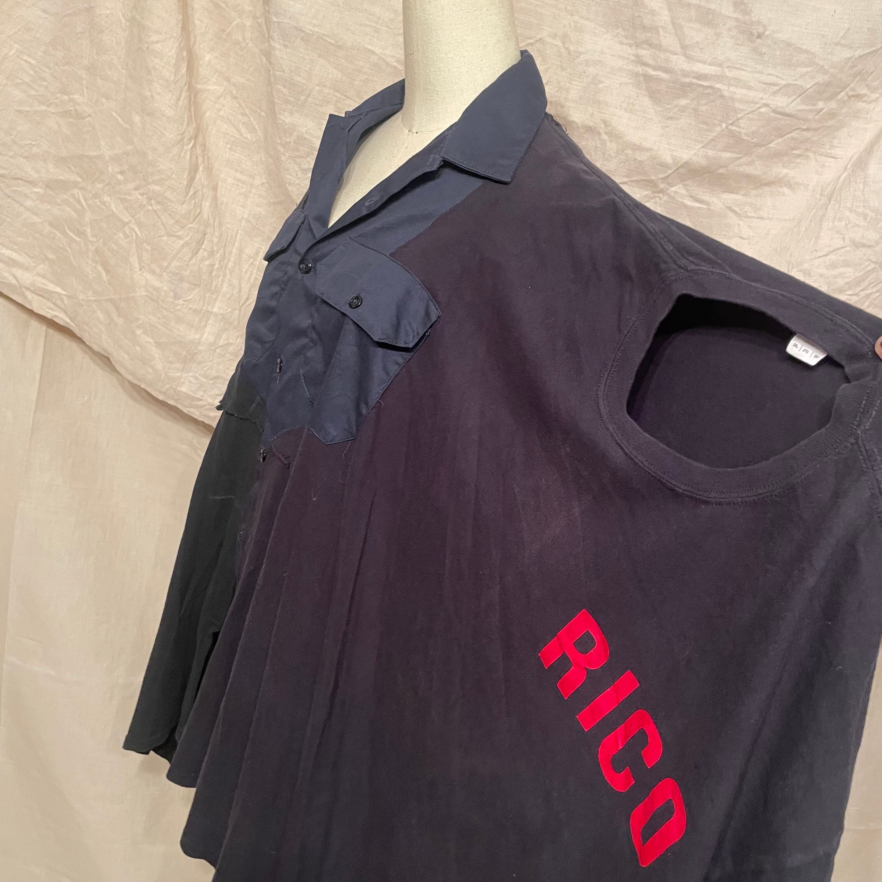 両側にTシャツをドッキングしたリメイクシャツ。腕出す位置が半袖部分と長袖部分にあるのでシーズンを通して着ることが可能。