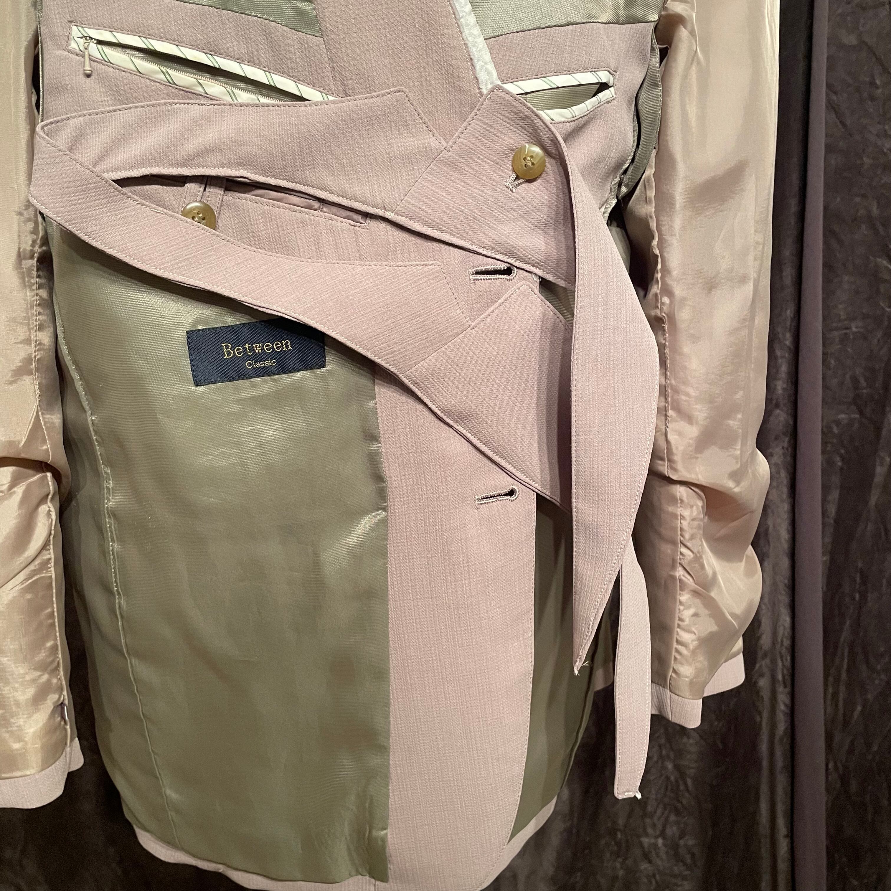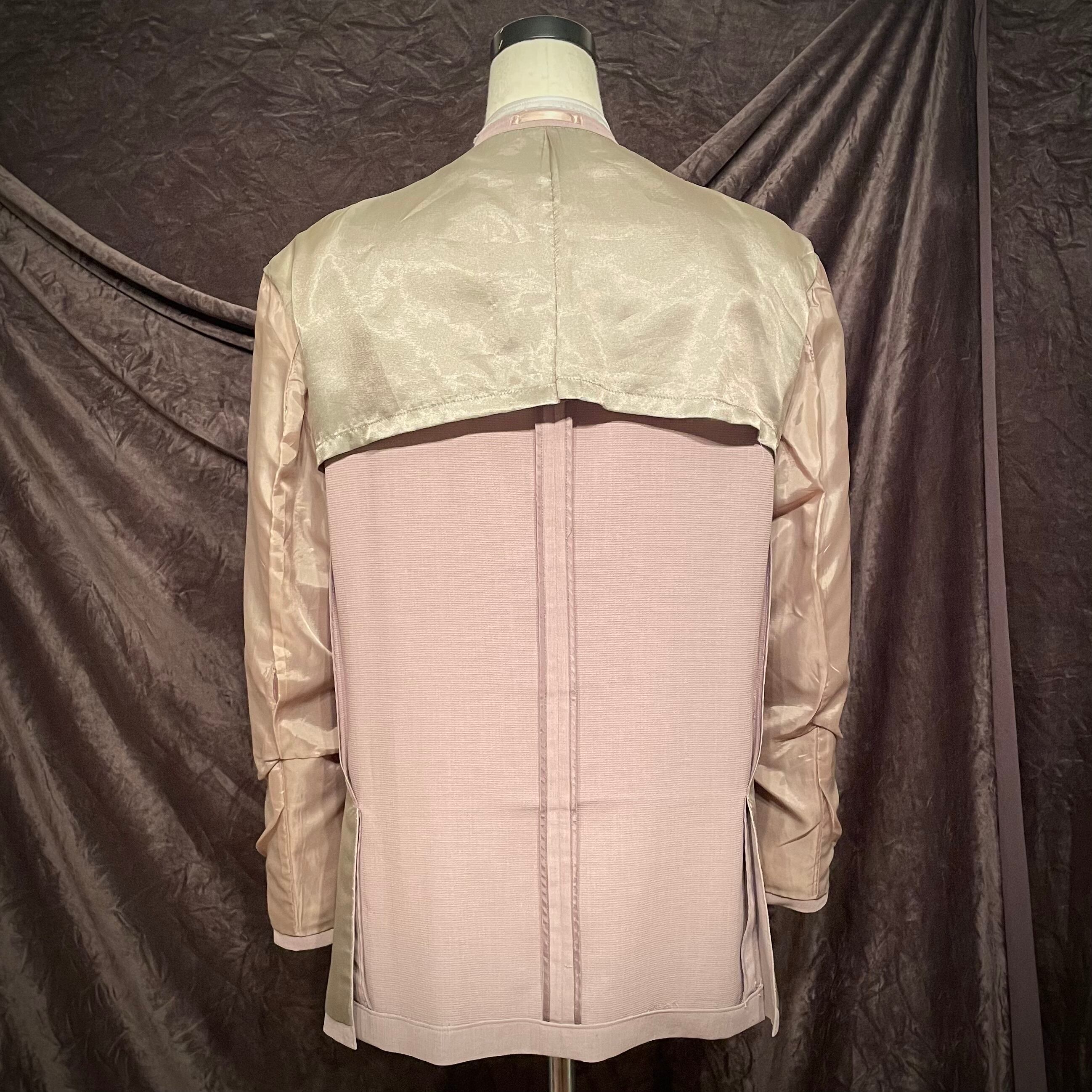 裏仕立ての綺麗なジャケットをインサイドアウトし、ノーカラーにすることで違和感を追加したジャケット。