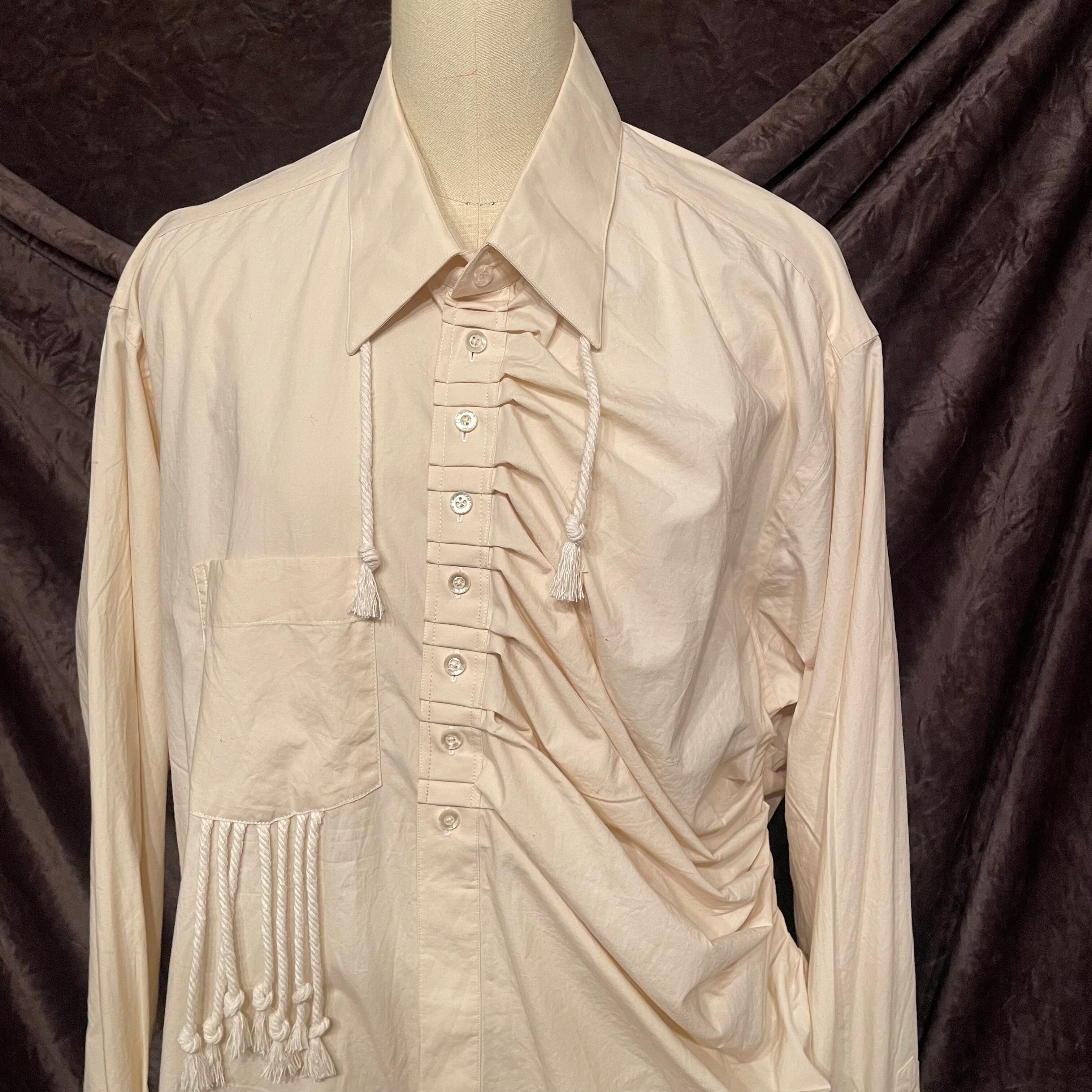 シンプルな白シャツにタッグや紐でドレープを作ったアシンメトリーシャツ。